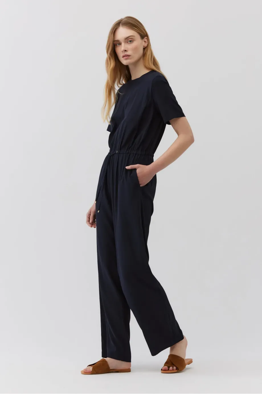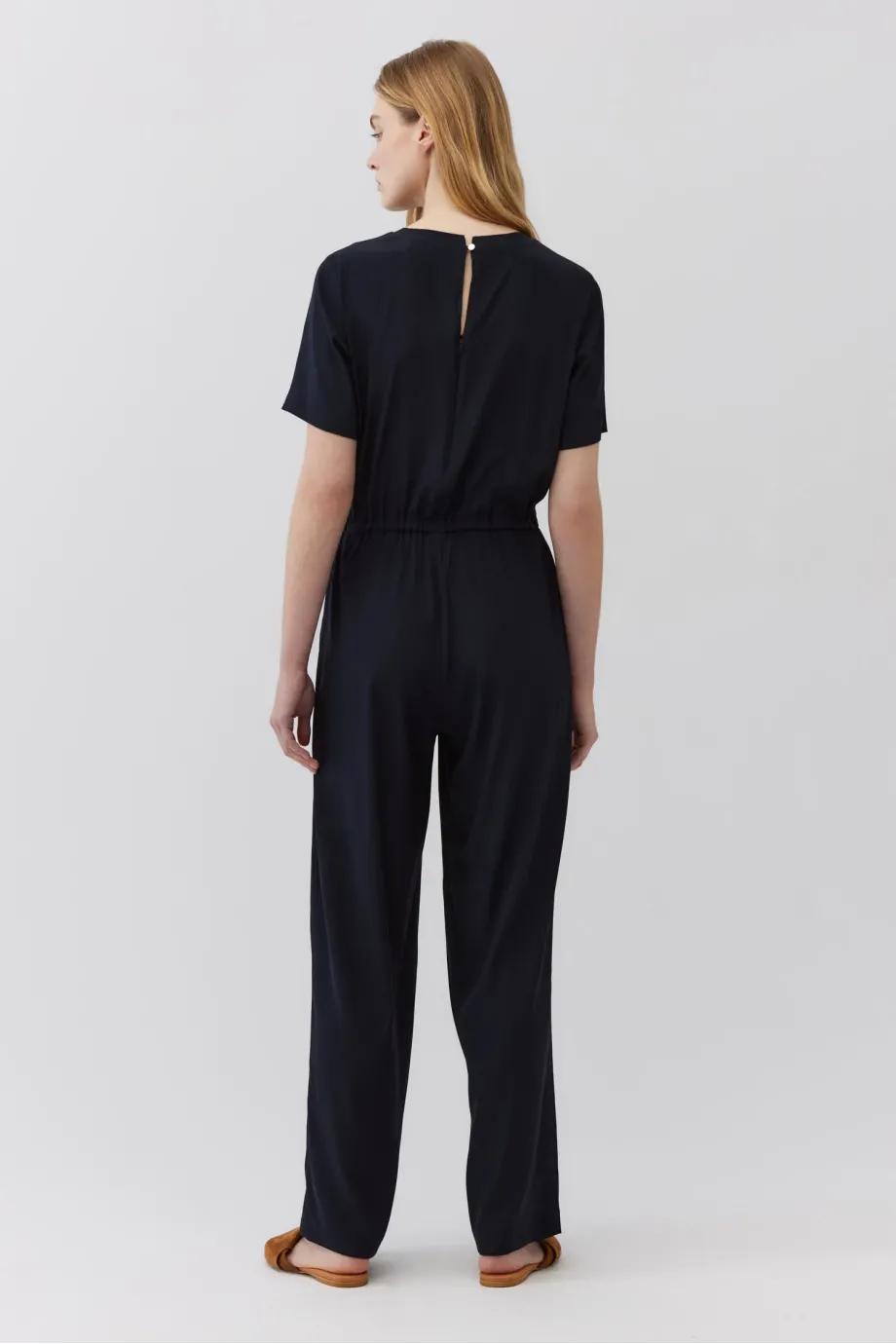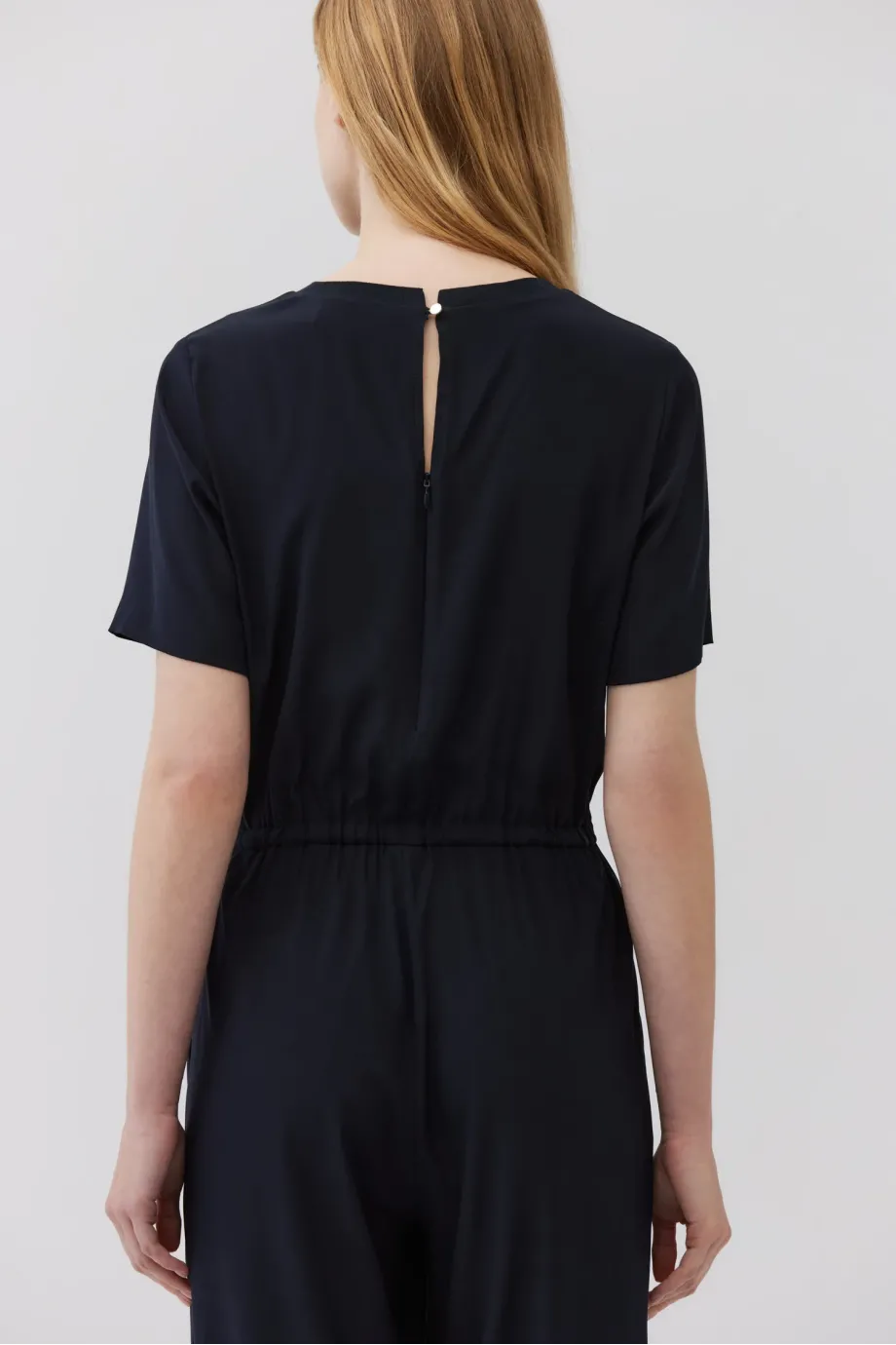 Námořnicky modrý overal s krátkým rukávem. Jednoduchý střih s dlouhými, volnými nohavicemi. Elastický pas nastavitelný šňůrkou. Kulatý výstřih. Zapínání vzadu na zip a knoflík. Skryté kapsy ve bočních švech. Vyrobený z hedvábí.