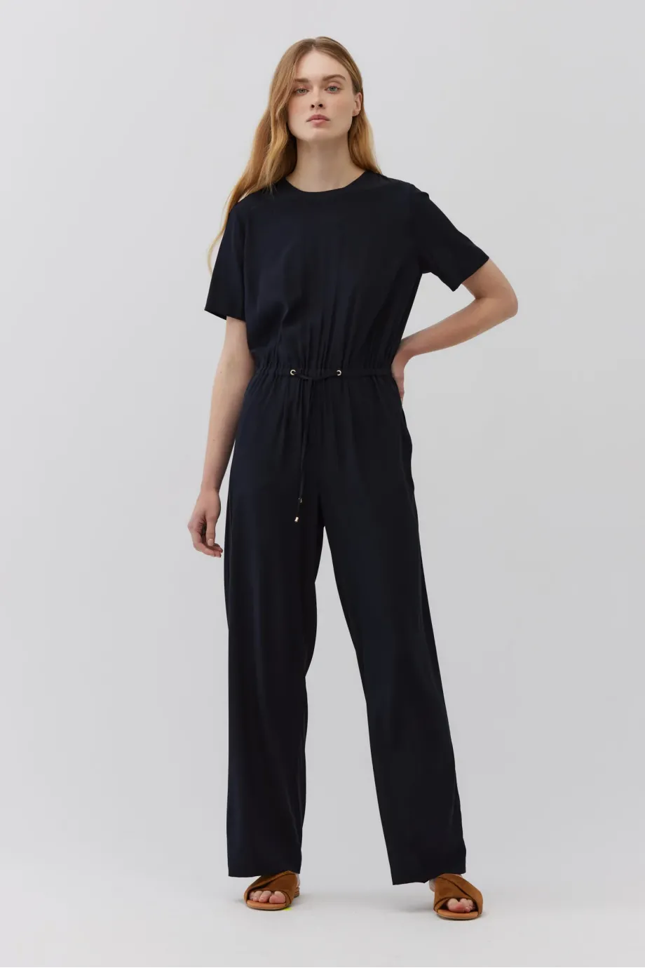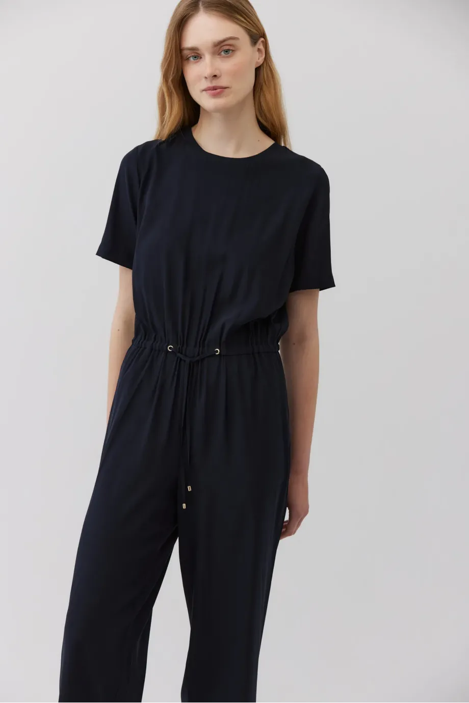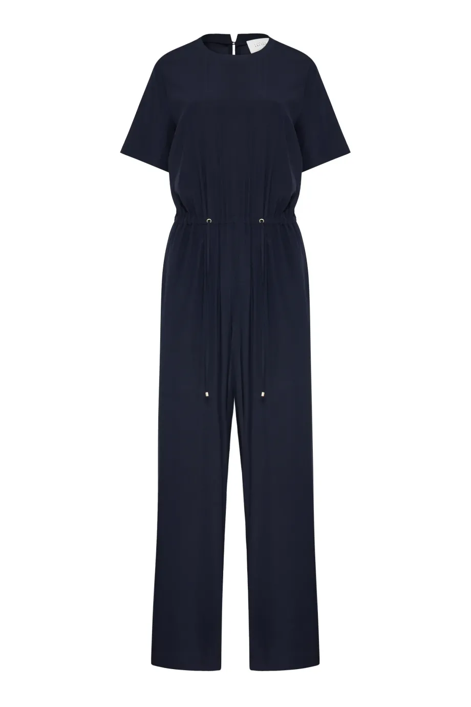 Námořnicky modrý overal s krátkým rukávem. Jednoduchý střih s dlouhými, volnými nohavicemi. Elastický pas nastavitelný šňůrkou. Kulatý výstřih. Zapínání vzadu na zip a knoflík. Skryté kapsy ve bočních švech. Vyrobený z hedvábí.