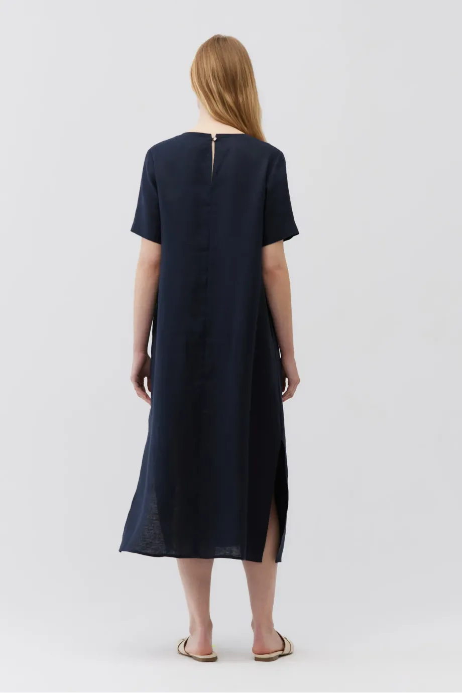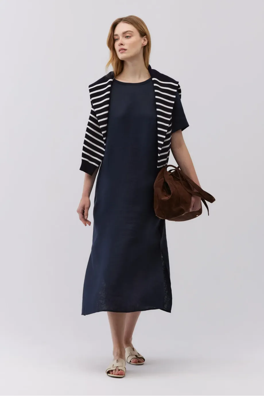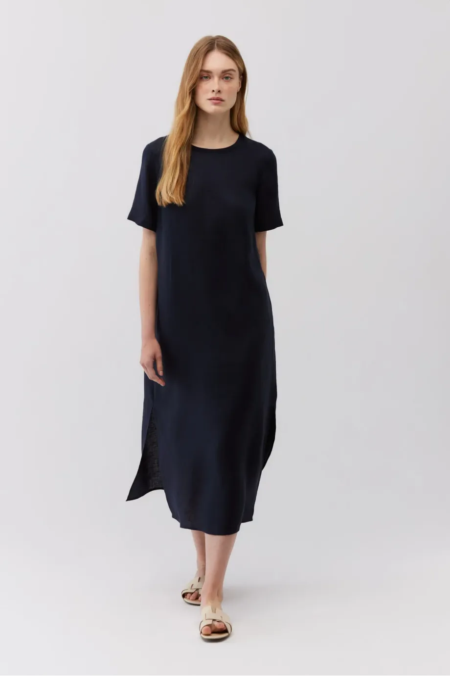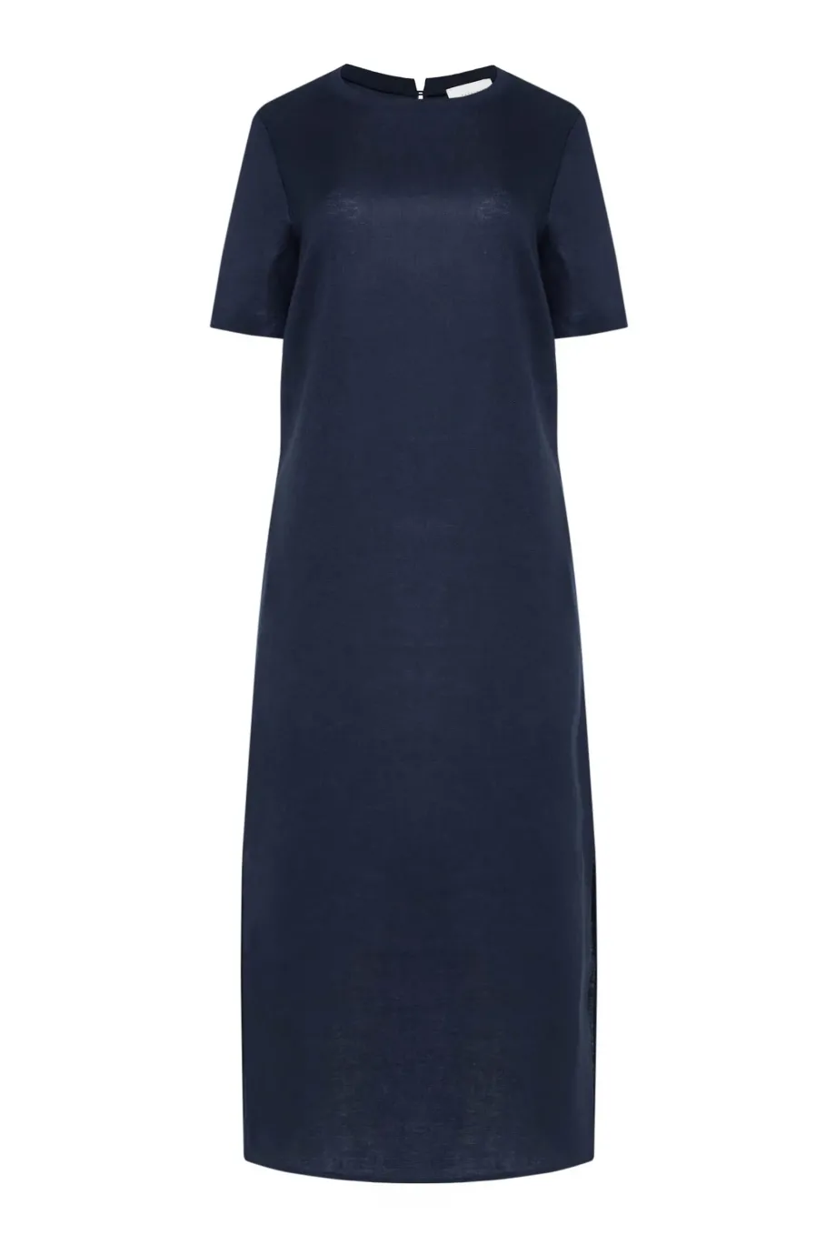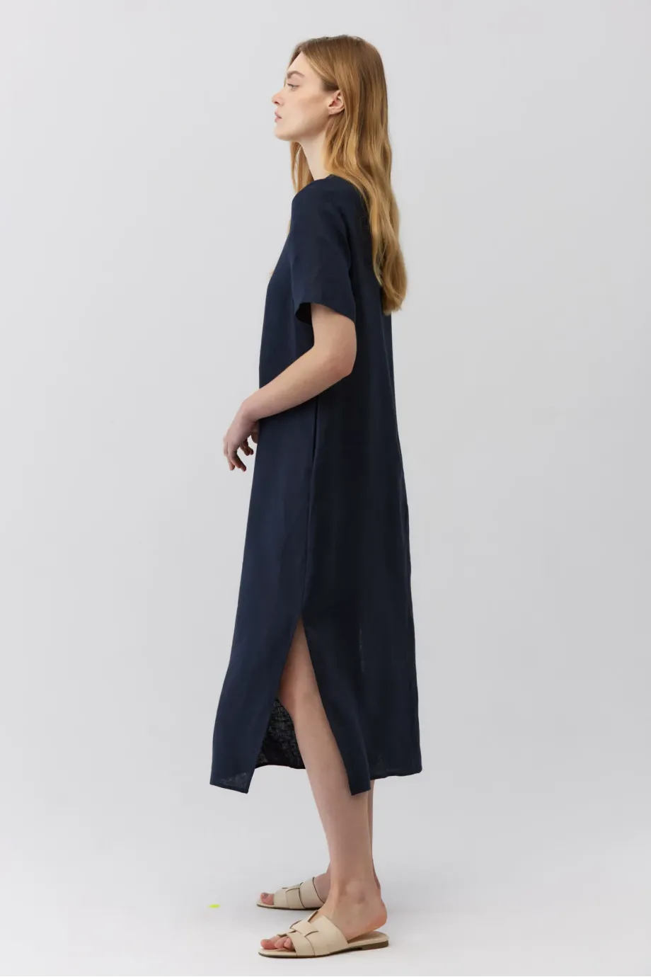 Dlouhá šaty s krátkým rukávem. Jednoduchý, volný střih. Kulatý výstřih. Rozparky po stranách. Kapsy v bočních švech. Tkanina 100% len. Barva tmavě modrá.