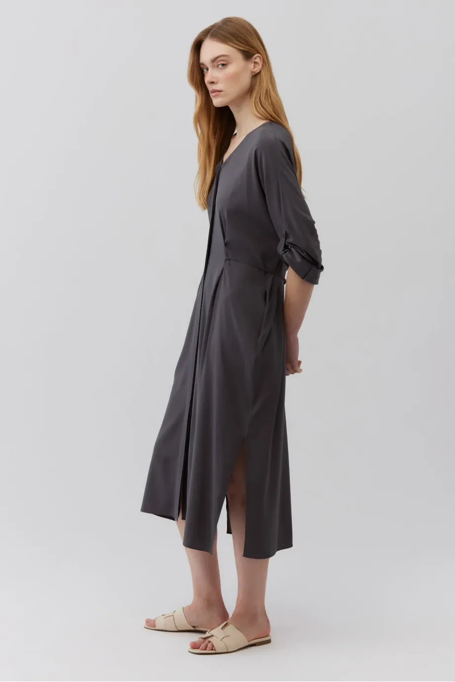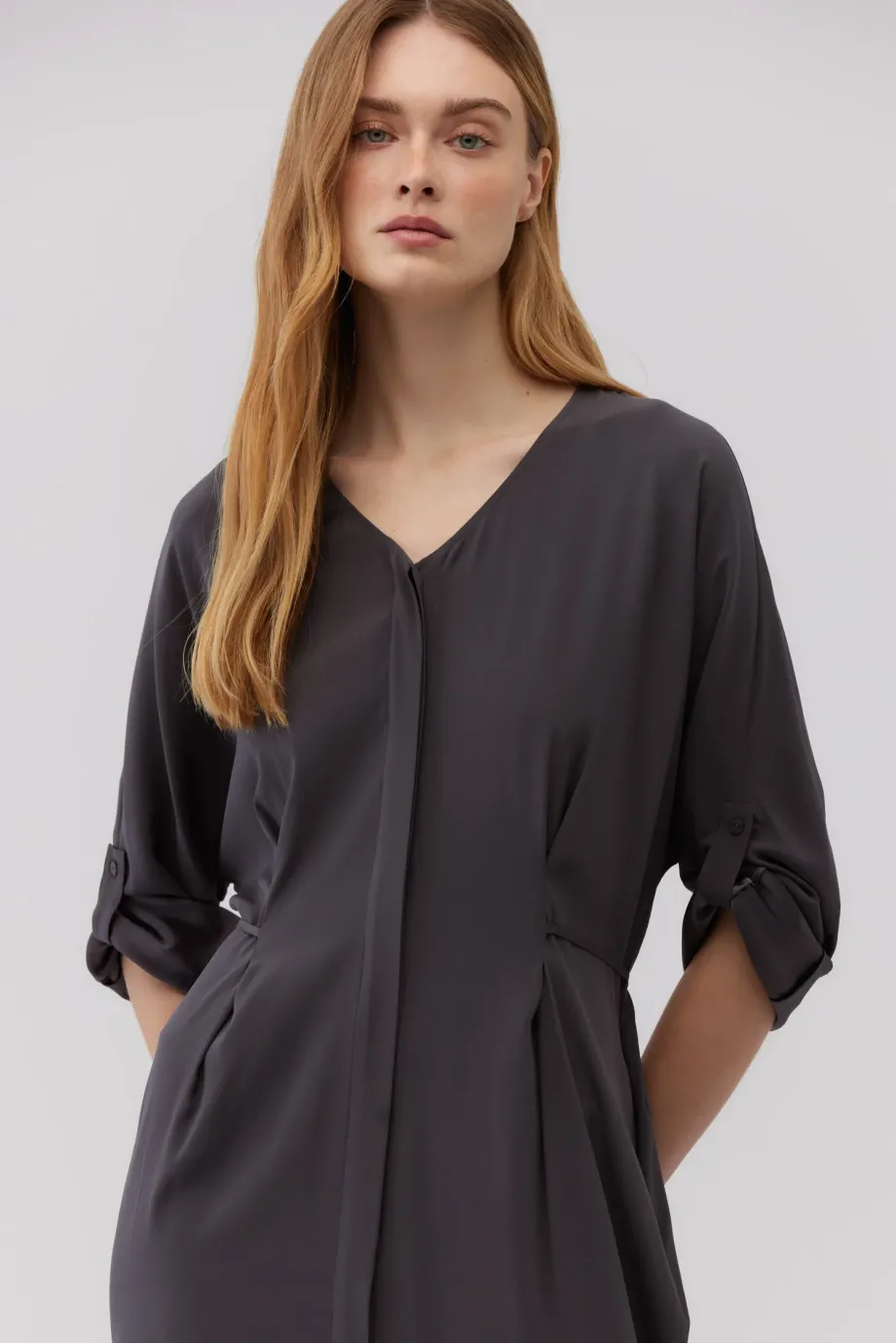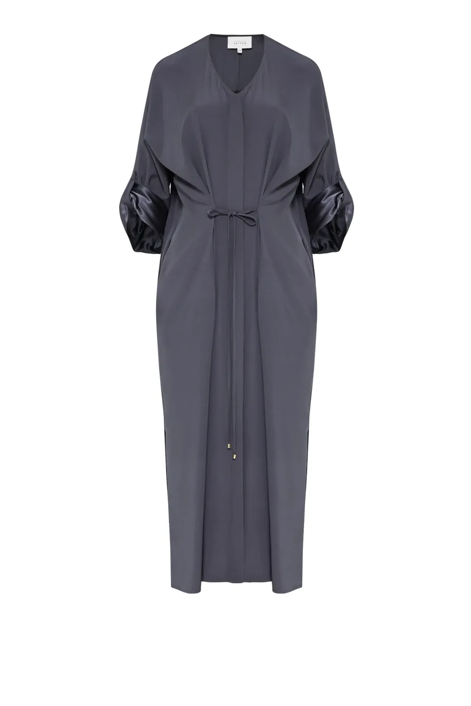 Šedé midi šaty s dlouhým rukávem. Výstřih do V. Zapínání pod légou vpředu. Nastavení v pase. Na zadní straně řasení. Rozparky po stranách. Rukávy lze zkrátit. Vyrobeno z lehkého, splývavého hedvábí.