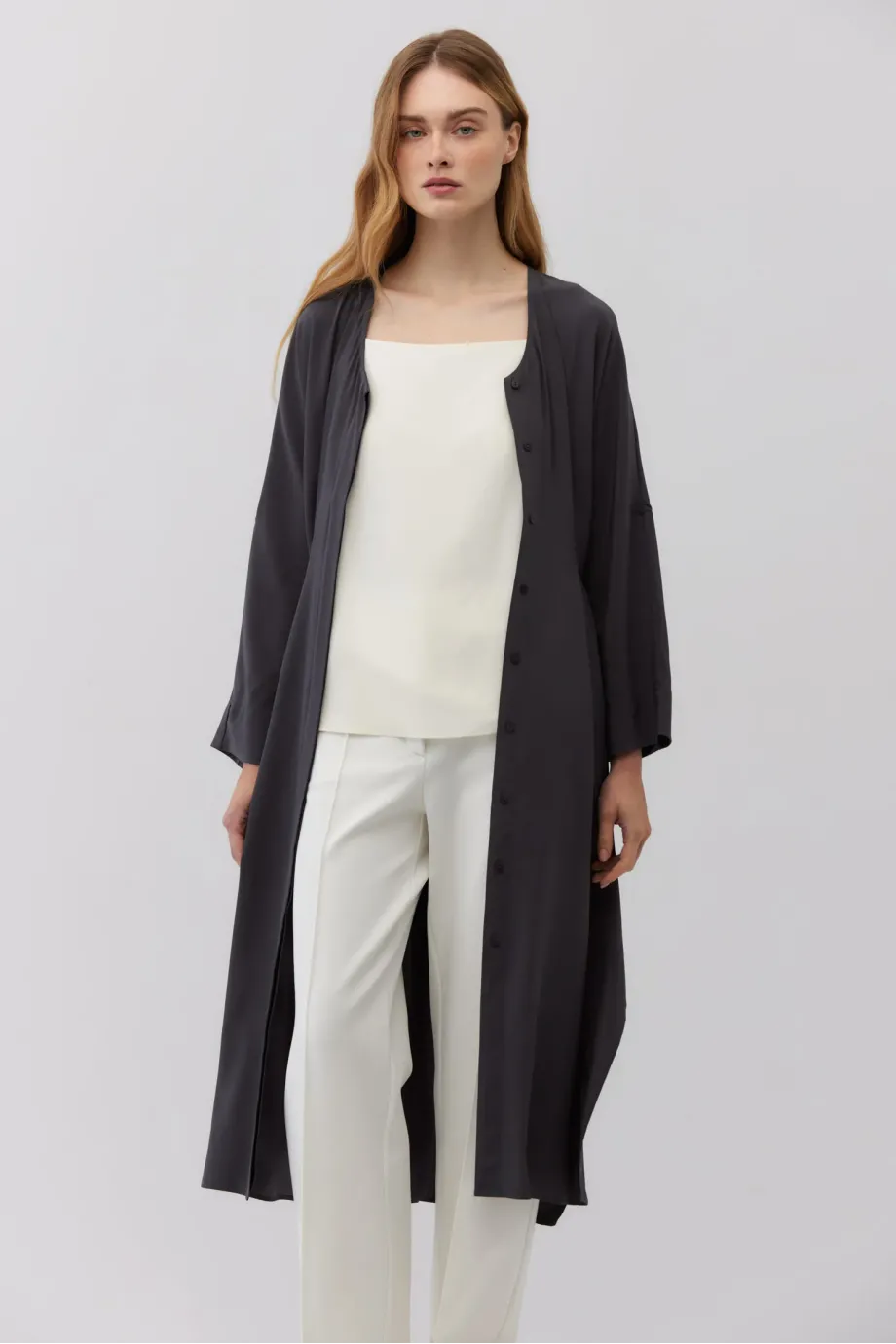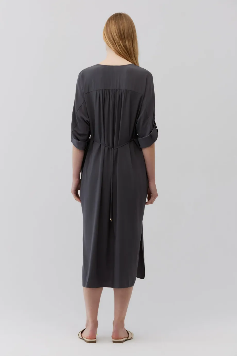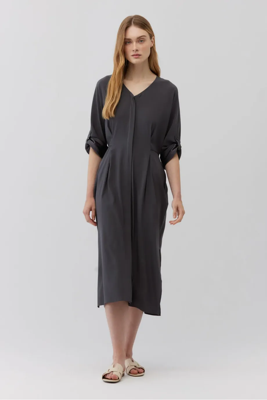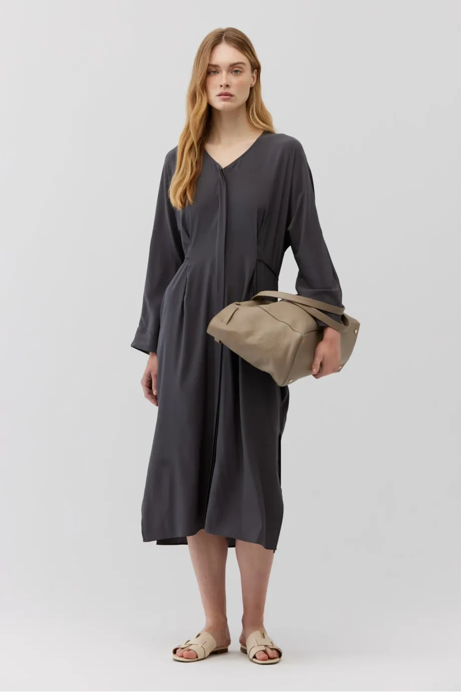 Šedé midi šaty s dlouhým rukávem. Výstřih do V. Zapínání pod légou vpředu. Nastavení v pase. Na zadní straně řasení. Rozparky po stranách. Rukávy lze zkrátit. Vyrobeno z lehkého, splývavého hedvábí.