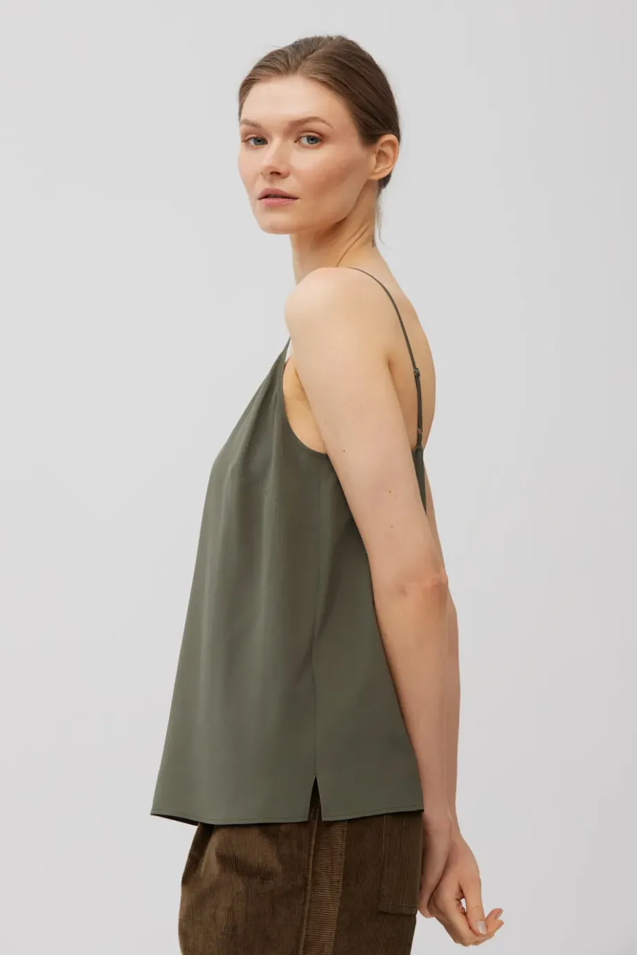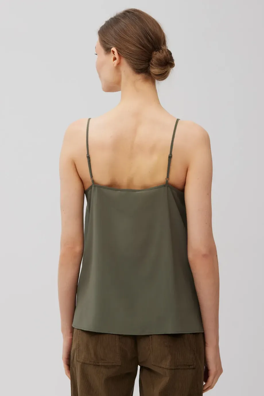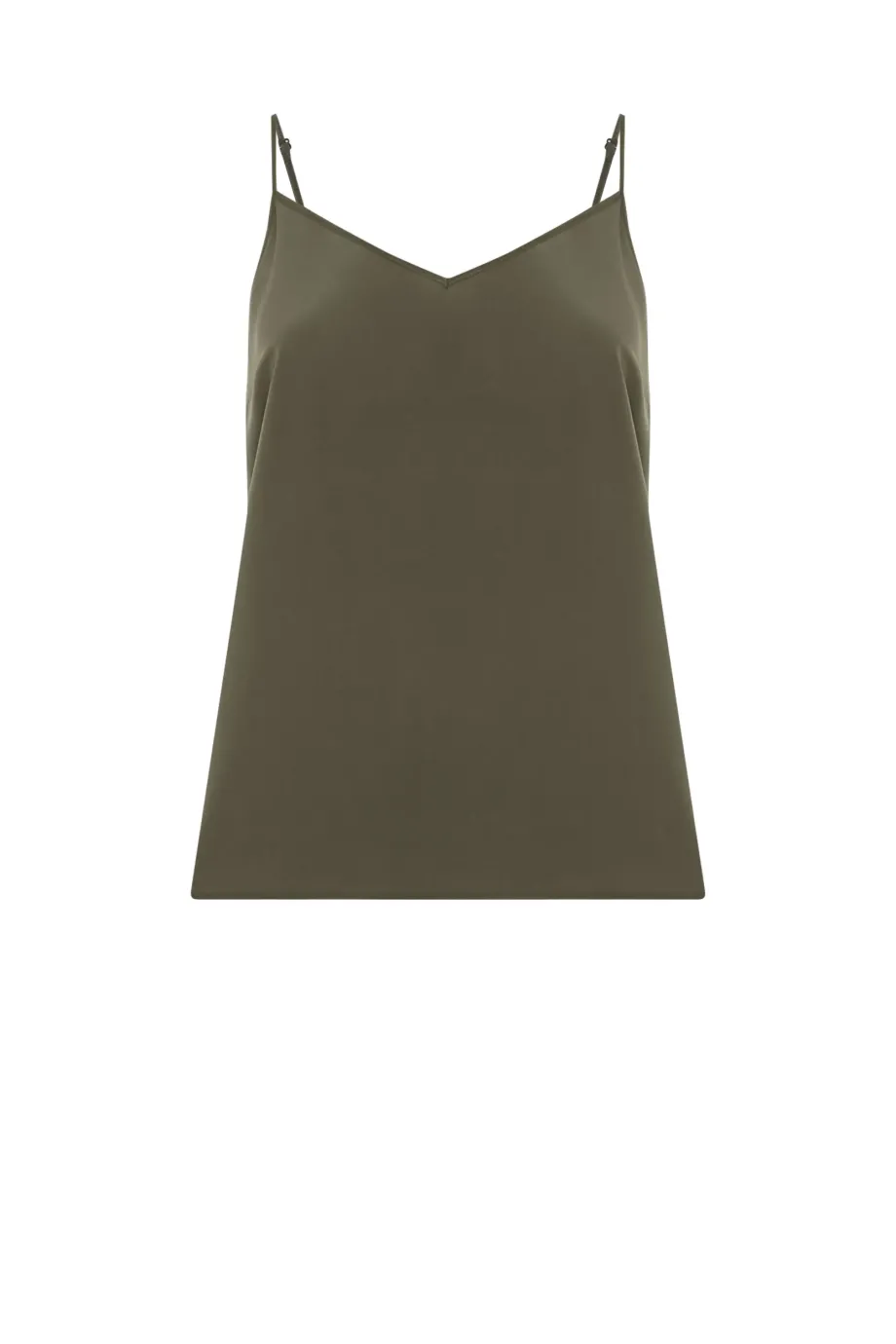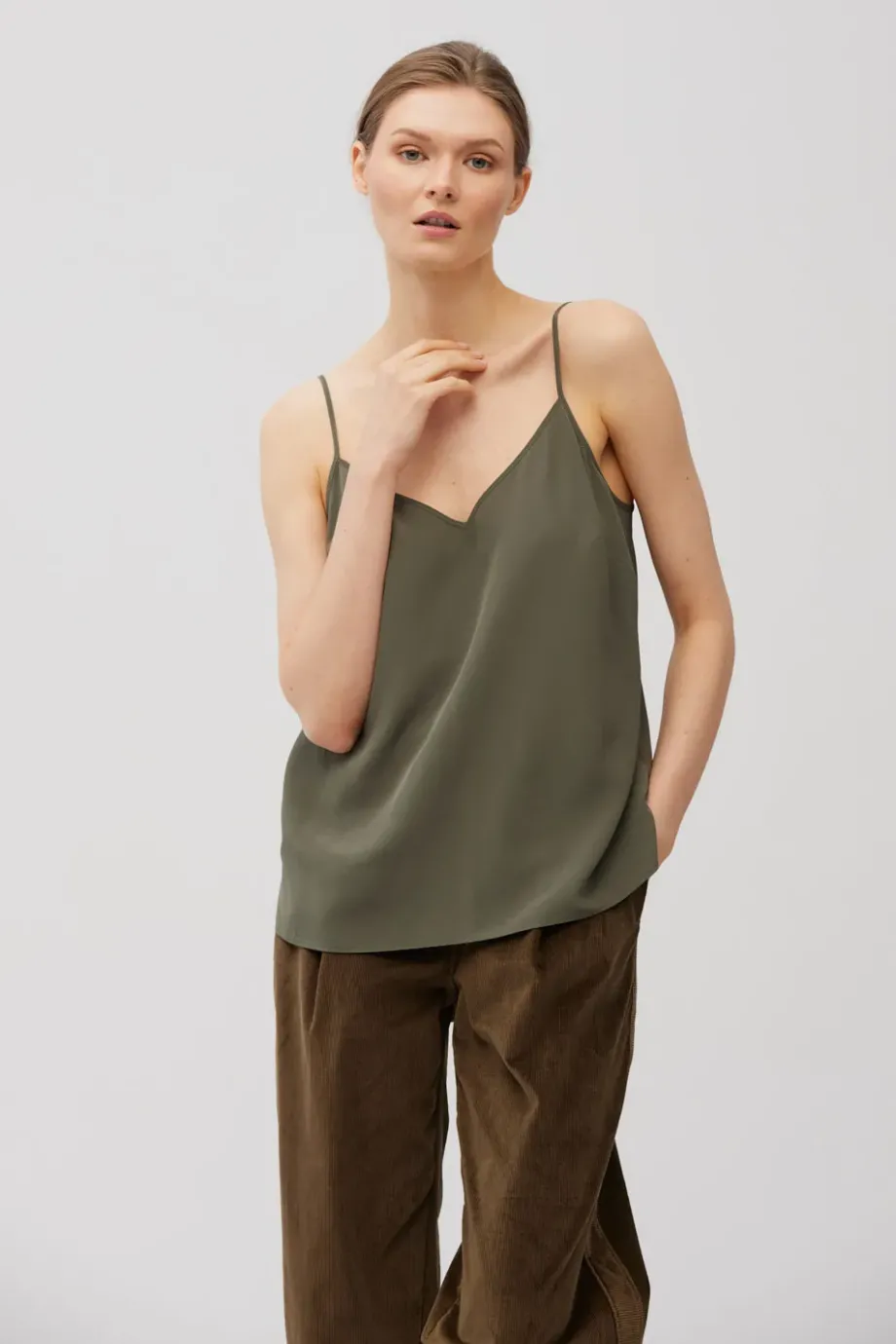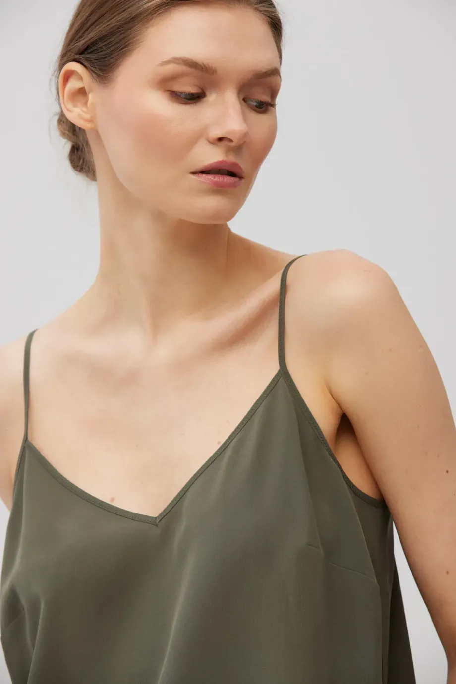 Top na tenkých, nastavitelných ramínkách. Vyrobeno ze 100 % hedvábí - lehké, hladké. Volný střih, výstřih ve tvaru písmene V. Barva tmavě zelená.