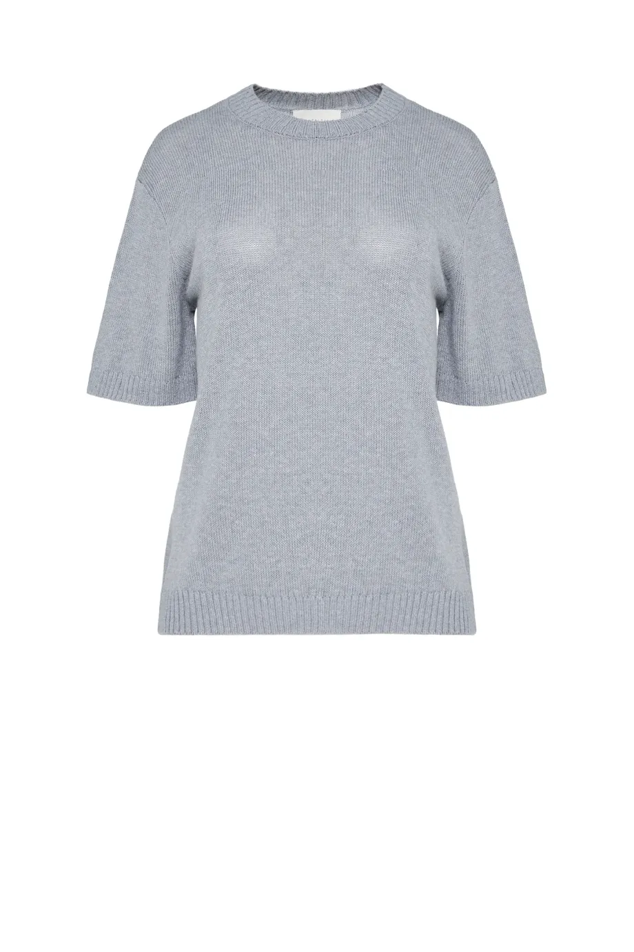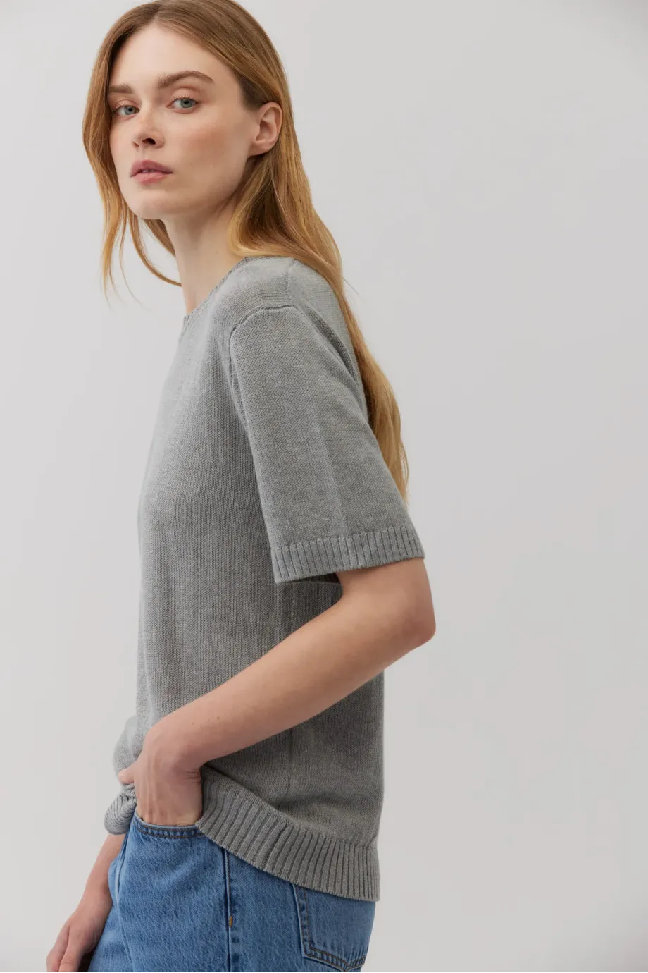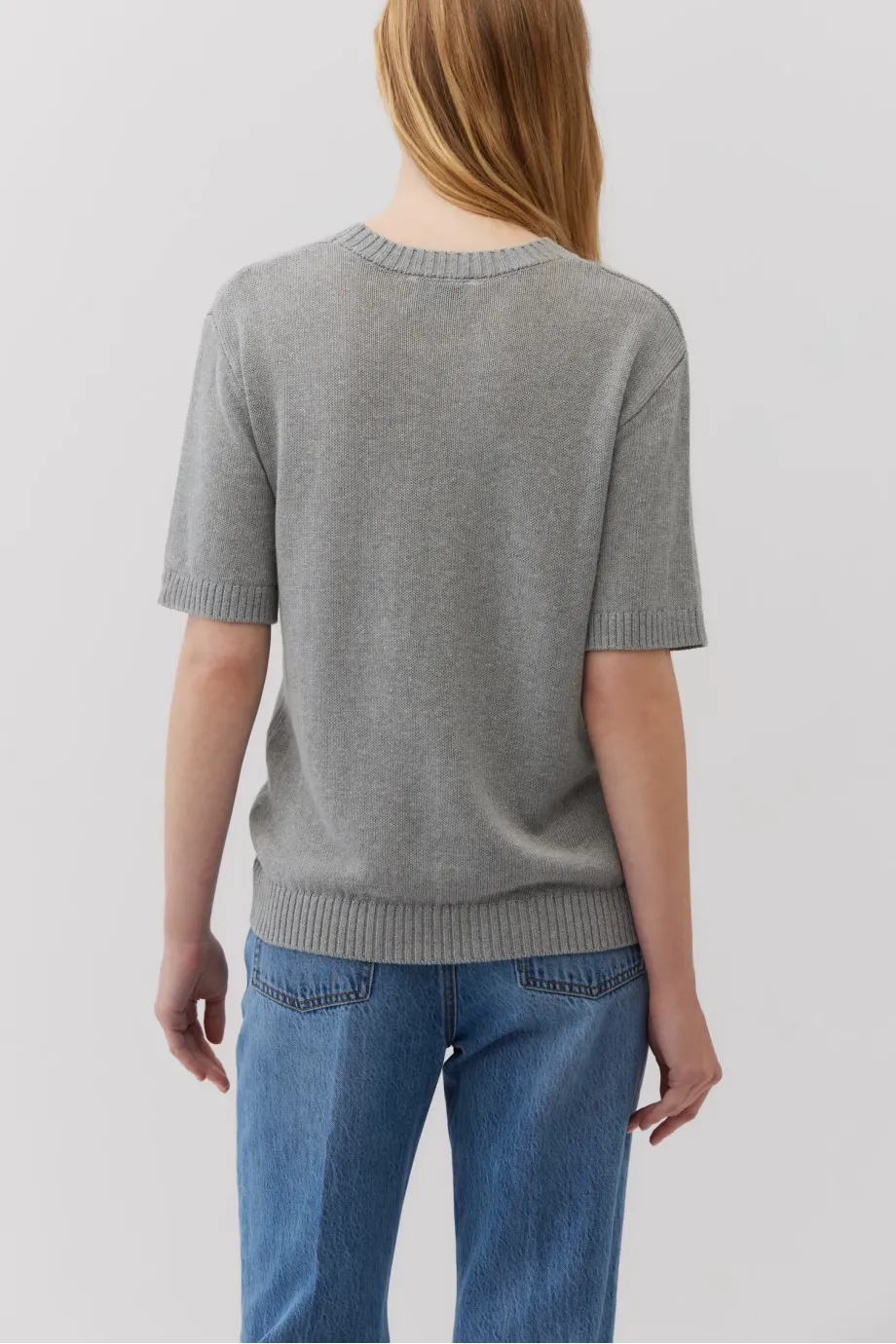 Šedé tričko s krátkým rukávem. Kulatý výstřih. Jednoduchý, volný střih. Měkká tkanina ze směsi lyocellu, bavlny a lnu. Volná struktura plochého úpletu. Model ve 2 barvách.