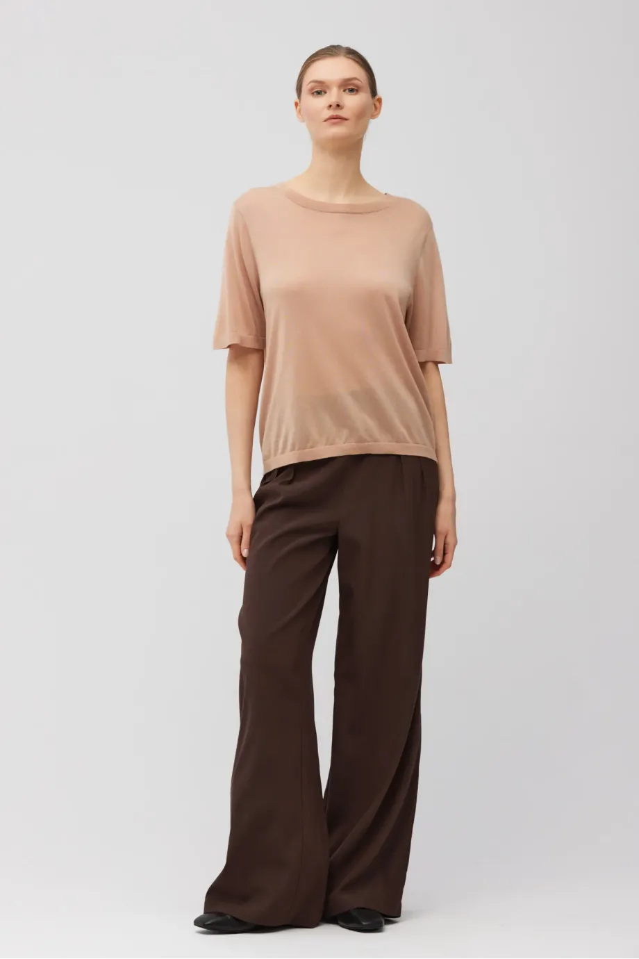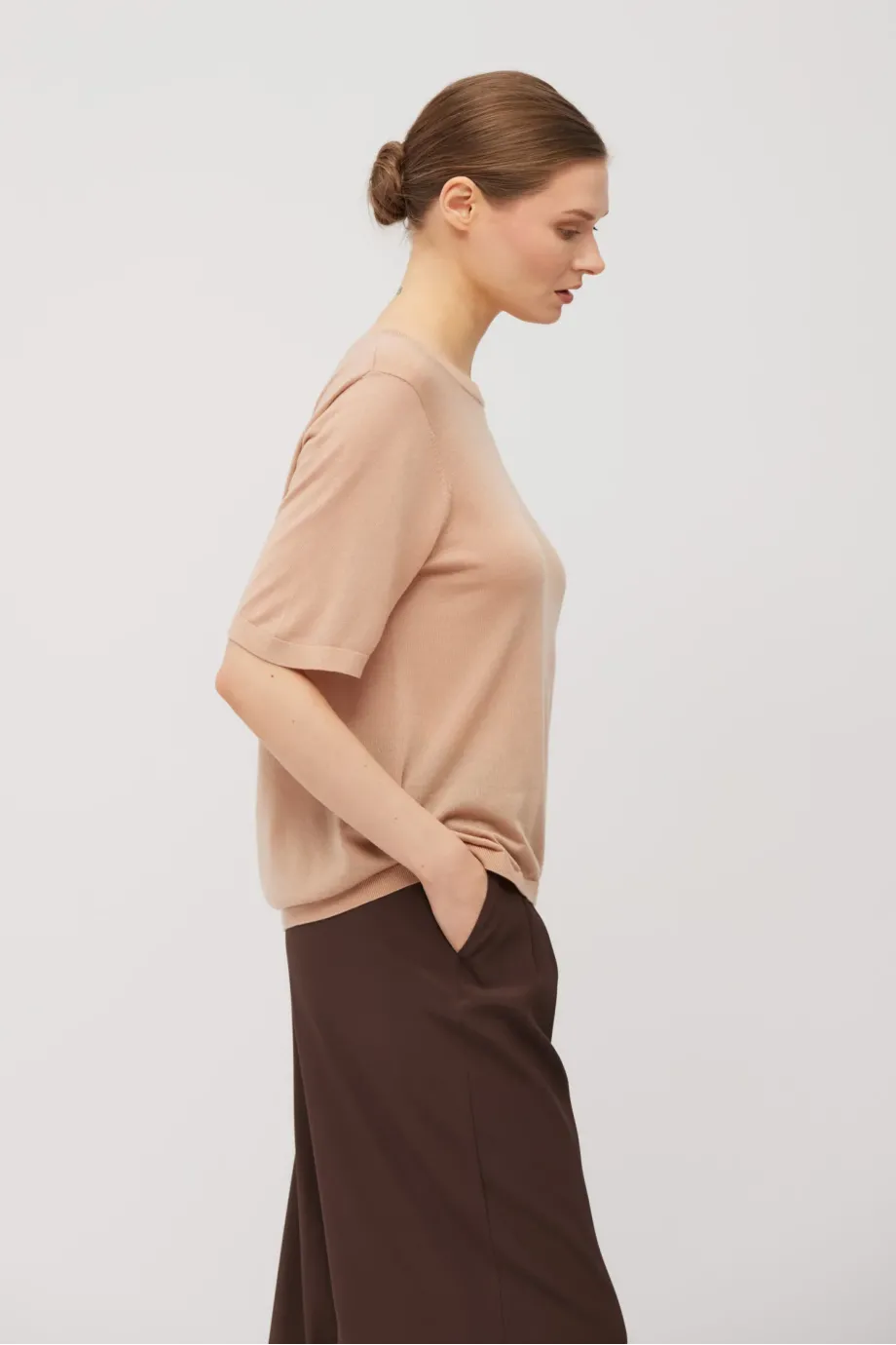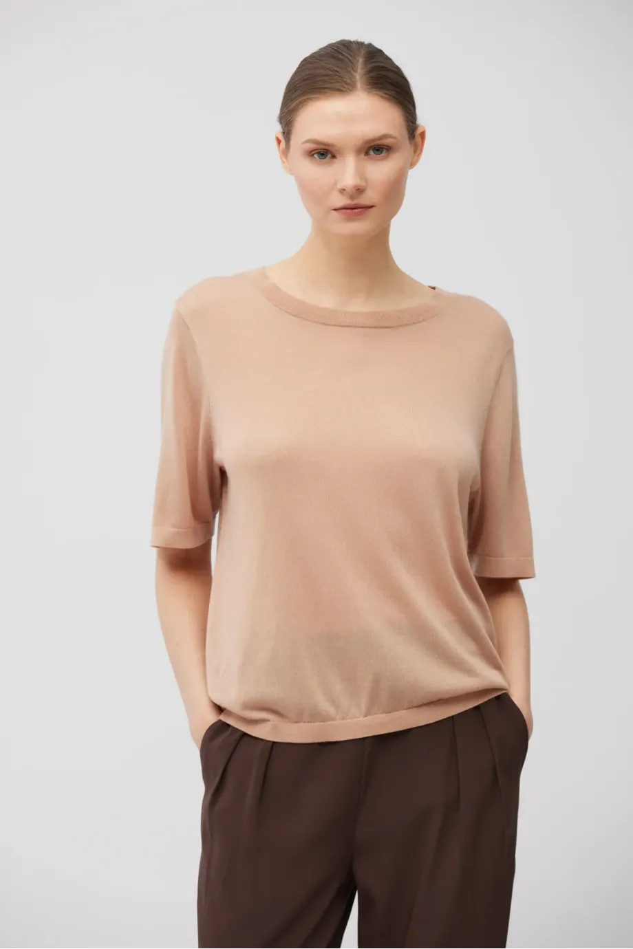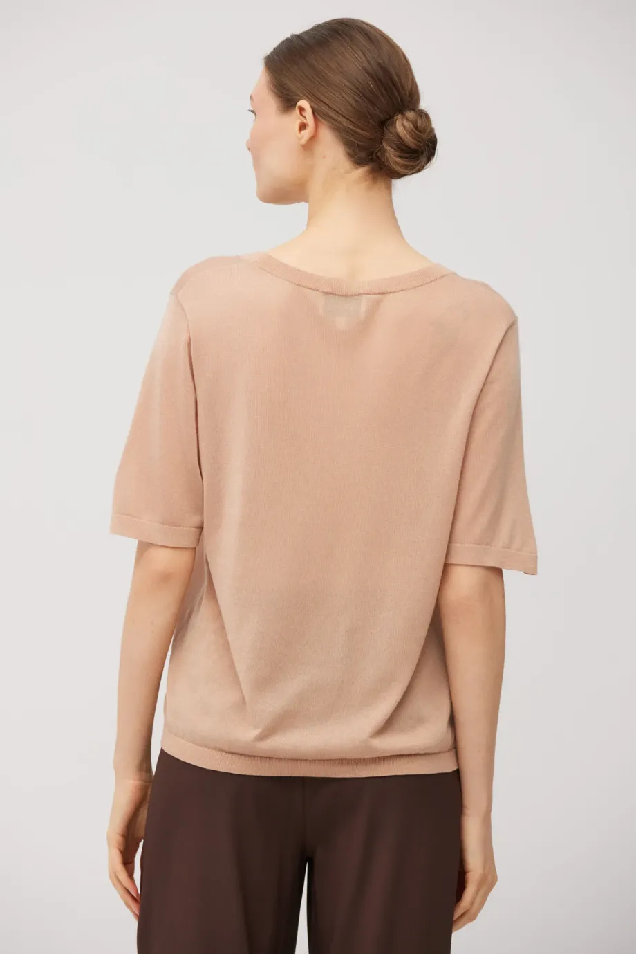 Pletené tričko v pudrové růžové. Jemná směs kašmíru a lyocellu. Měkká a prodyšná pletenina s velmi jemným úpletem single jersey, připravena na stroji s uigením 16 GG. Krátký rukáv, kulatý výstřih, klasická forma.