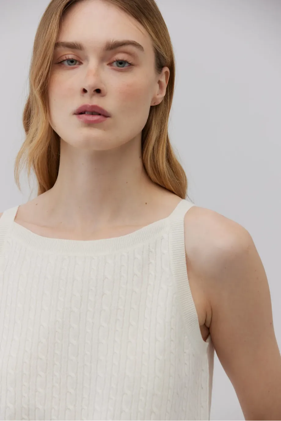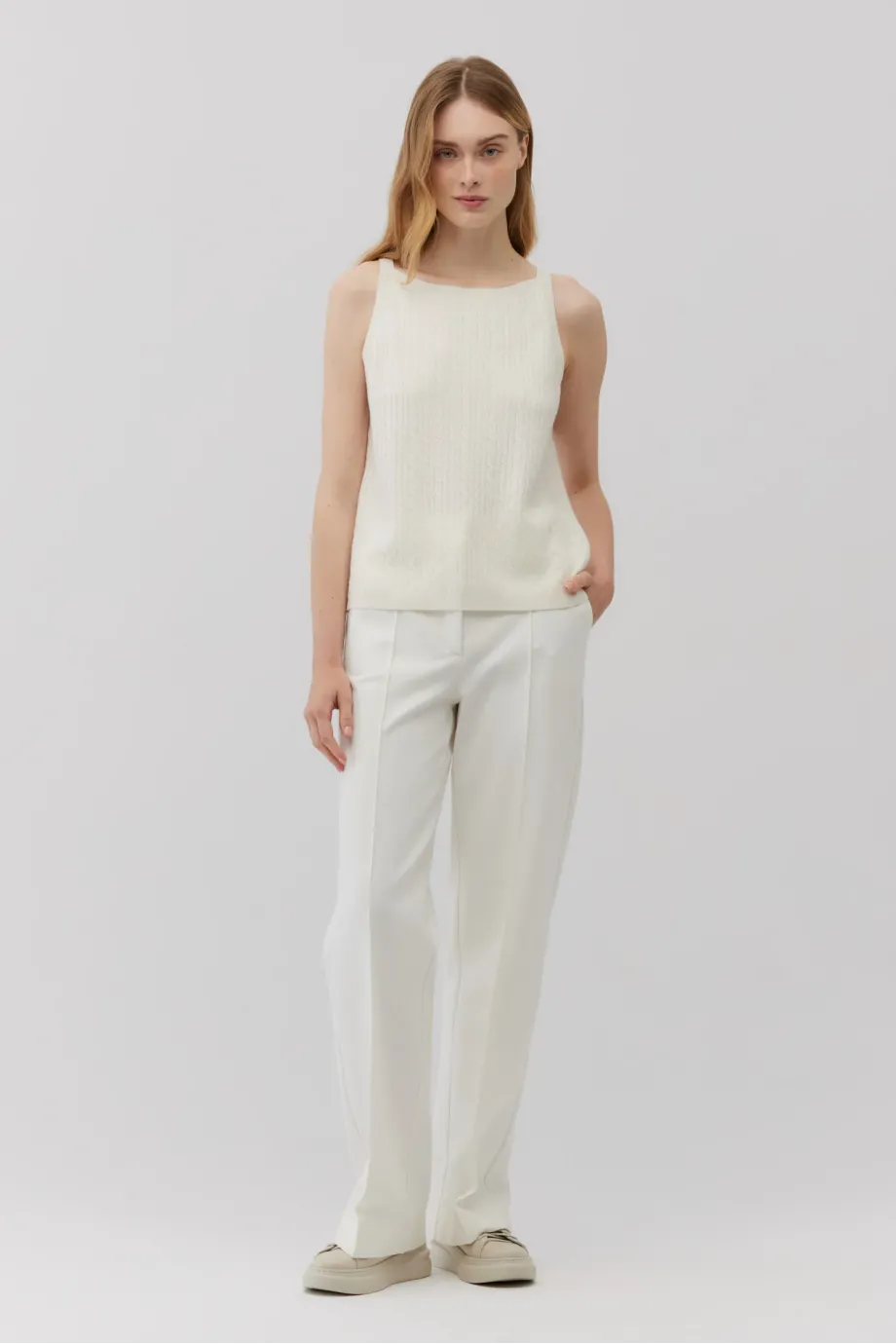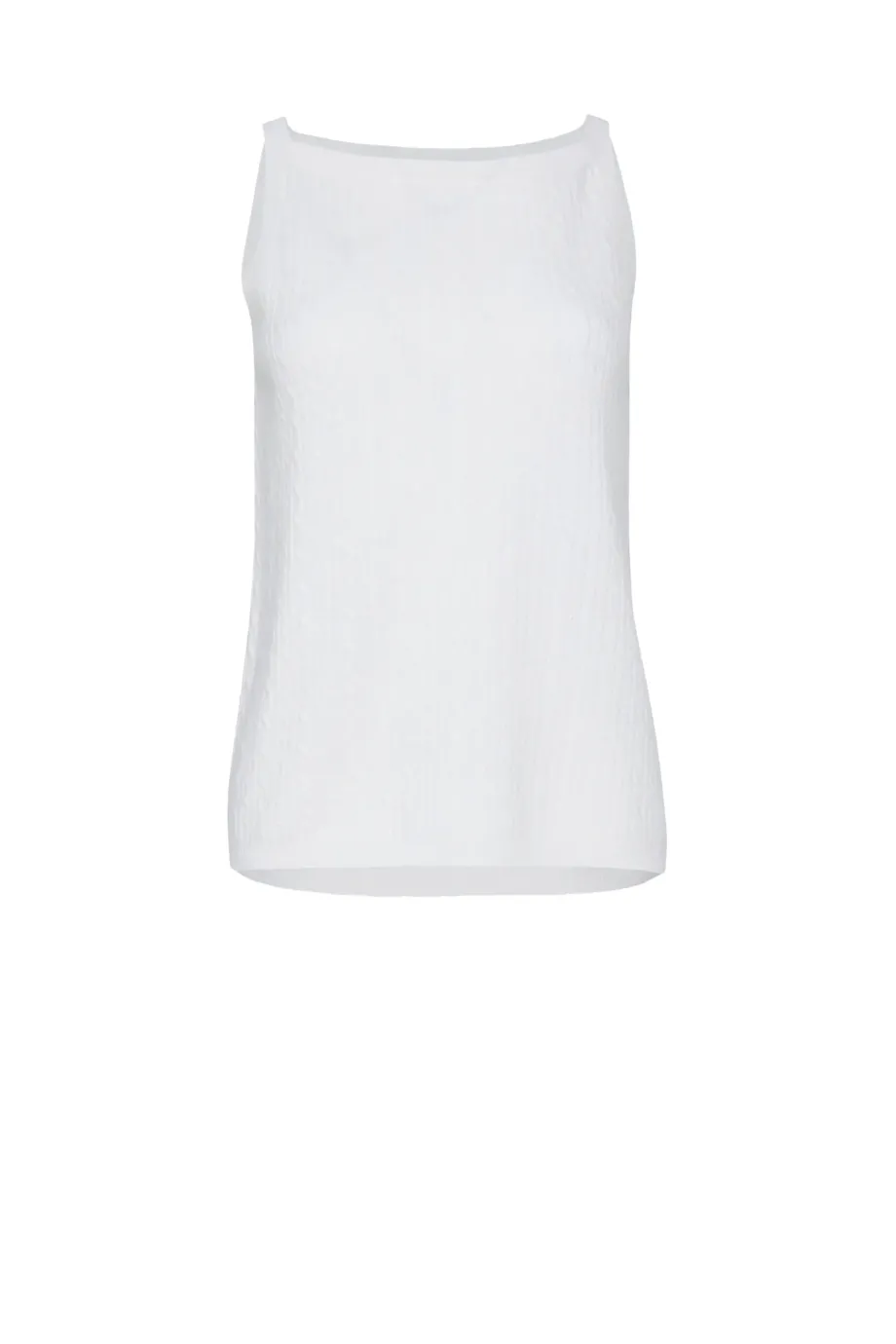 Bílý pletený top bez rukávů. Halter výstřih. Jemný pletený vzor. Klasický, mírně přiléhavý střih. Pletenina s měkkým dotykem.
