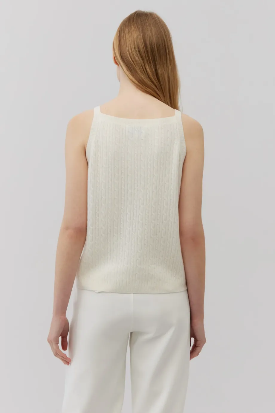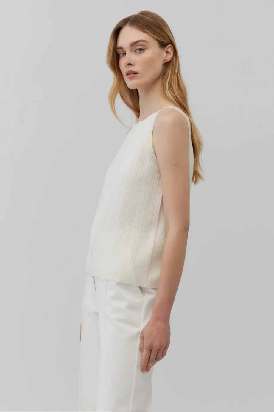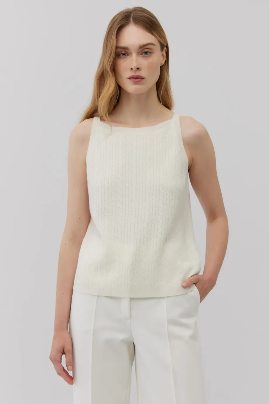 Bílý pletený top bez rukávů. Halter výstřih. Jemný pletený vzor. Klasický, mírně přiléhavý střih. Pletenina s měkkým dotykem.
