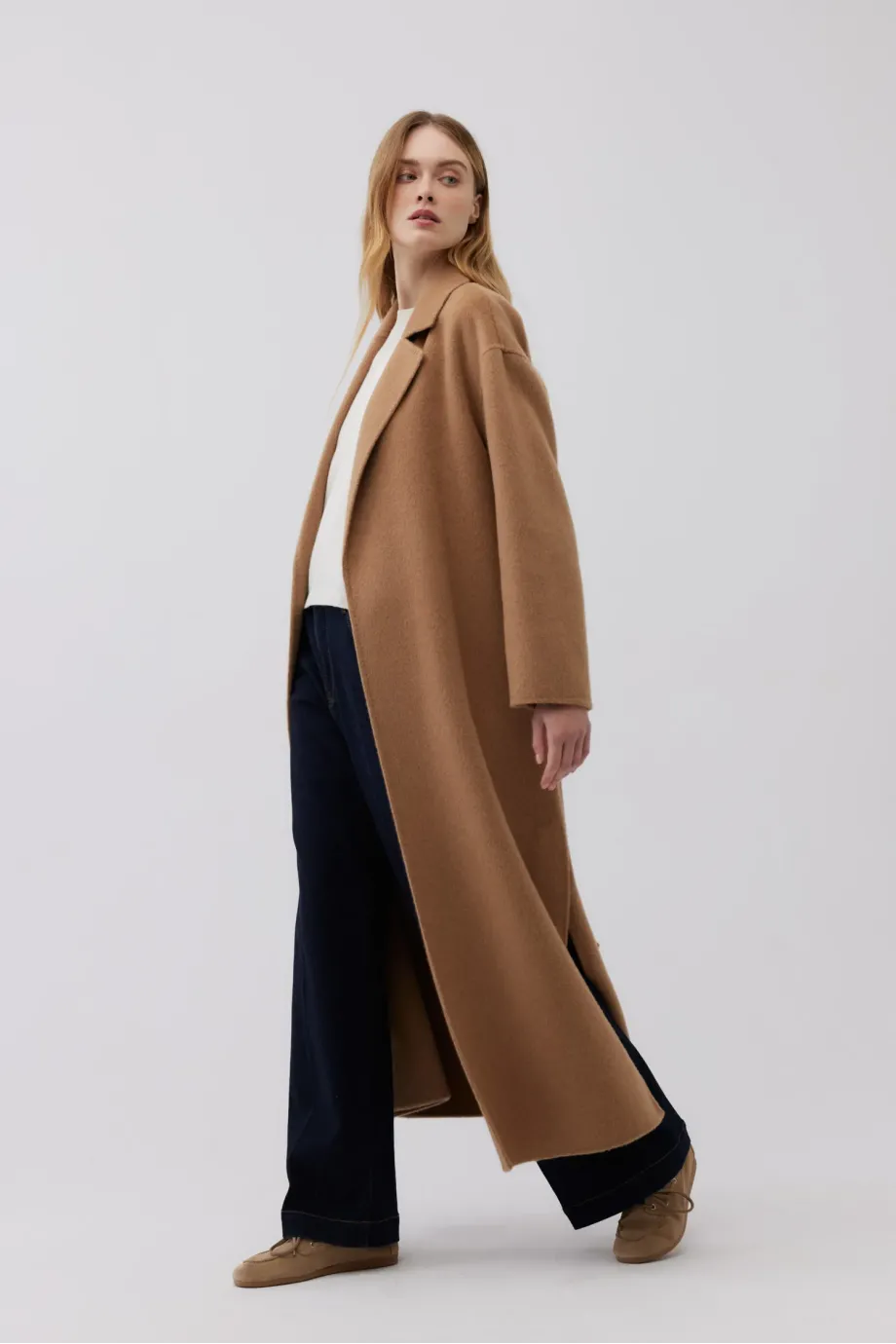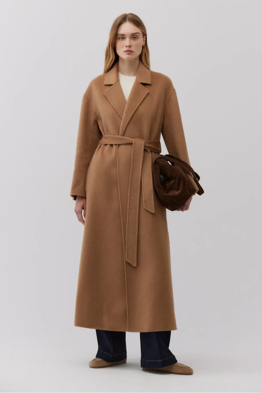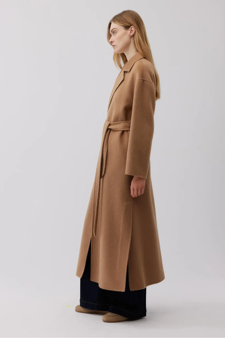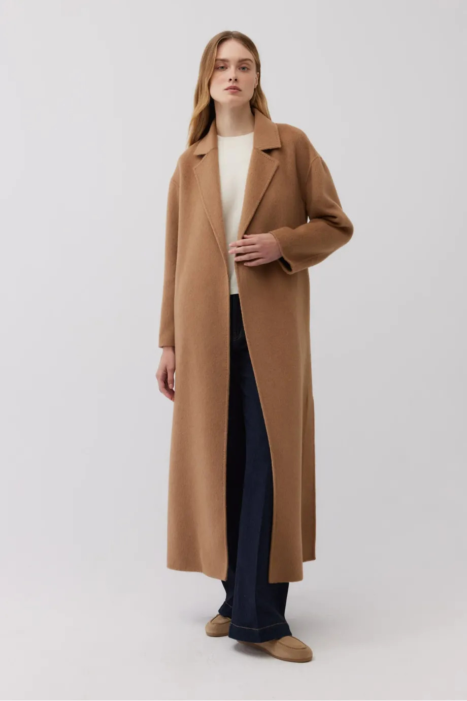 Dlouhý plášť z velbloudí vlny - doubleface. Klasický střih s límcem a páskem na vázání v pase. Dekorativní prošívání na okrajích pláště. Bez podšívky – lehký a teplý. Přirozená barva camel. Na přechodné období a zimu.
