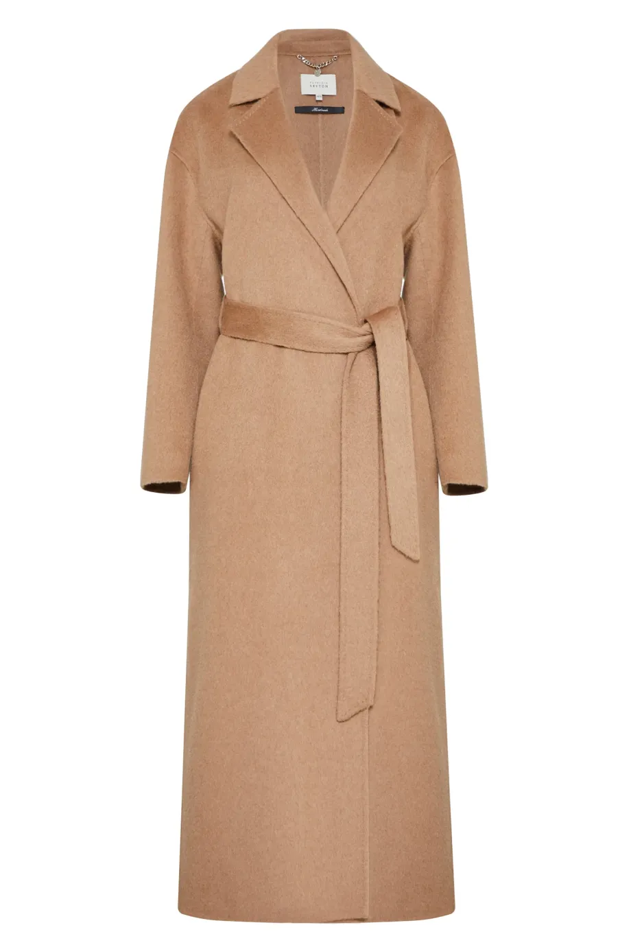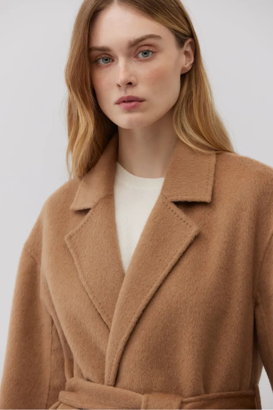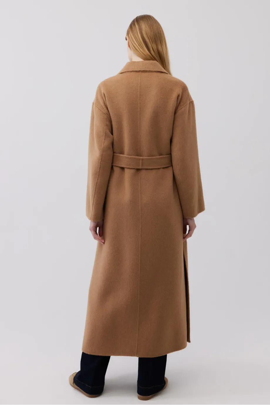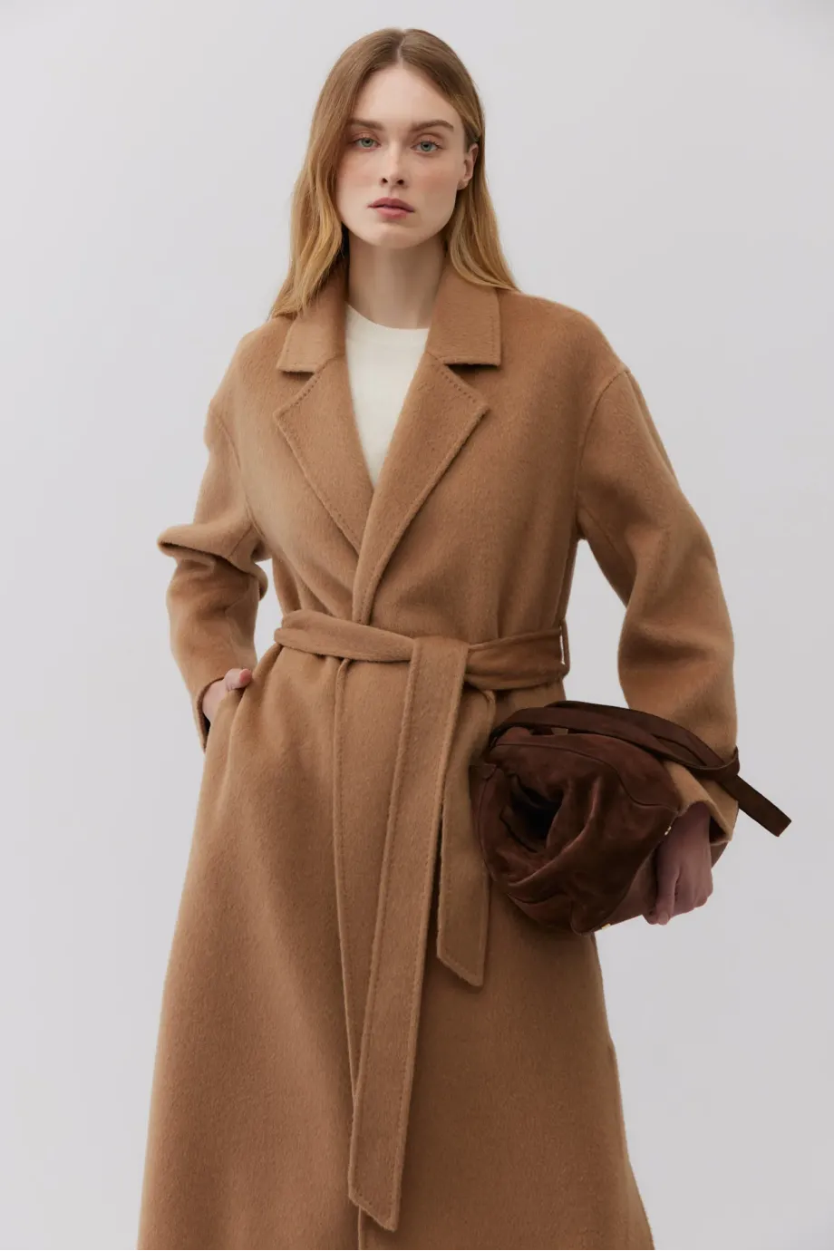 Dlouhý plášť z velbloudí vlny - doubleface. Klasický střih s límcem a páskem na vázání v pase. Dekorativní prošívání na okrajích pláště. Bez podšívky – lehký a teplý. Přirozená barva camel. Na přechodné období a zimu.