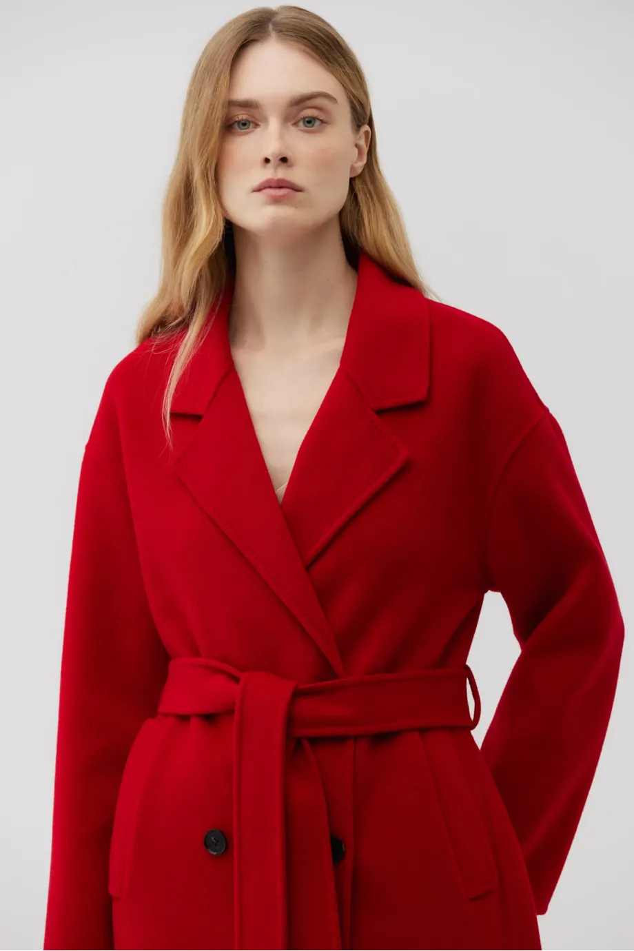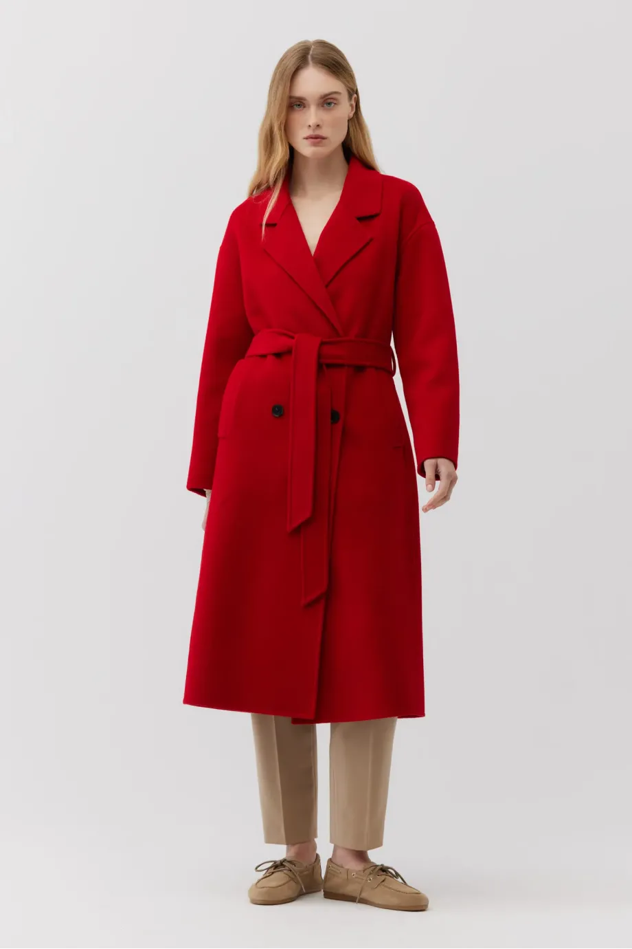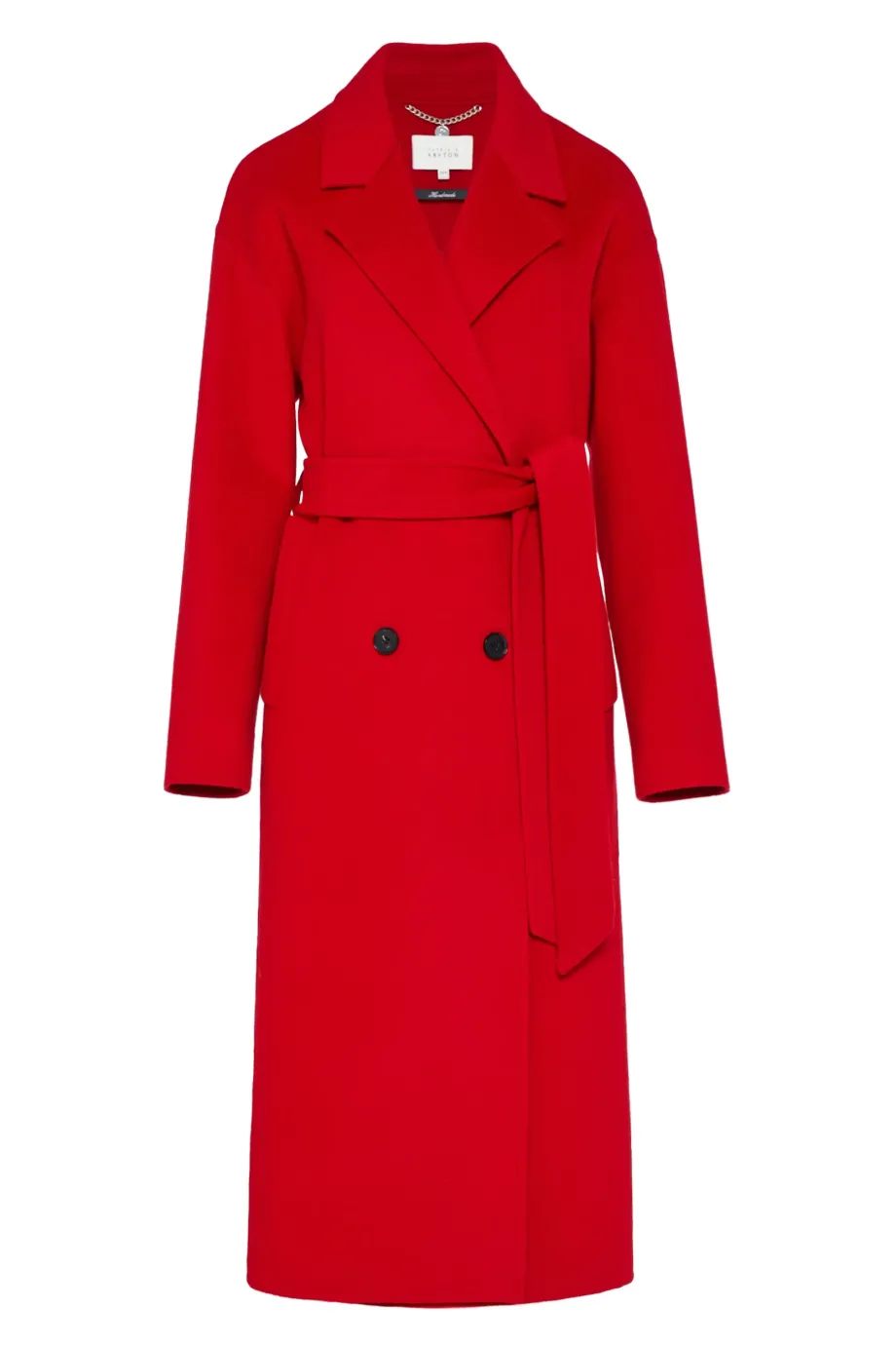 Dvouřadový kabát z tkaniny doubleface - směs vlny a hedvábí. Délka nad kolena, pásek v pase, klopový límec. Lehký, nepodšitý. Na zadní straně rozvent. Barva červená.