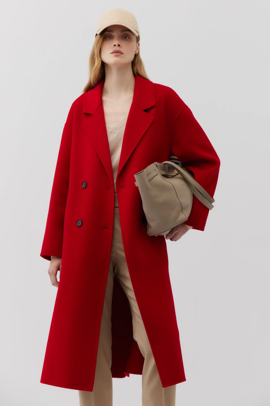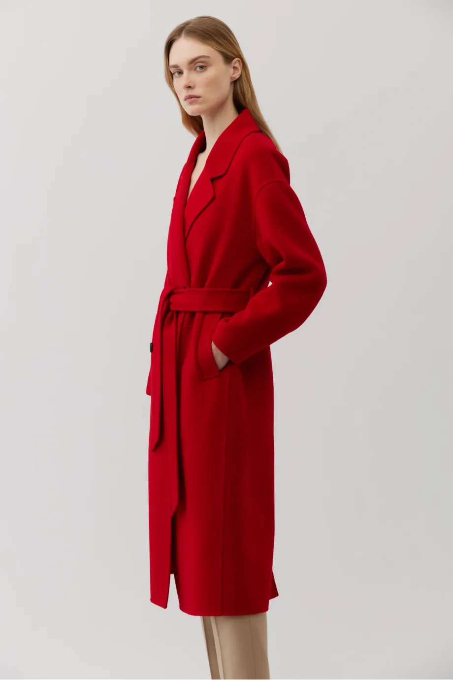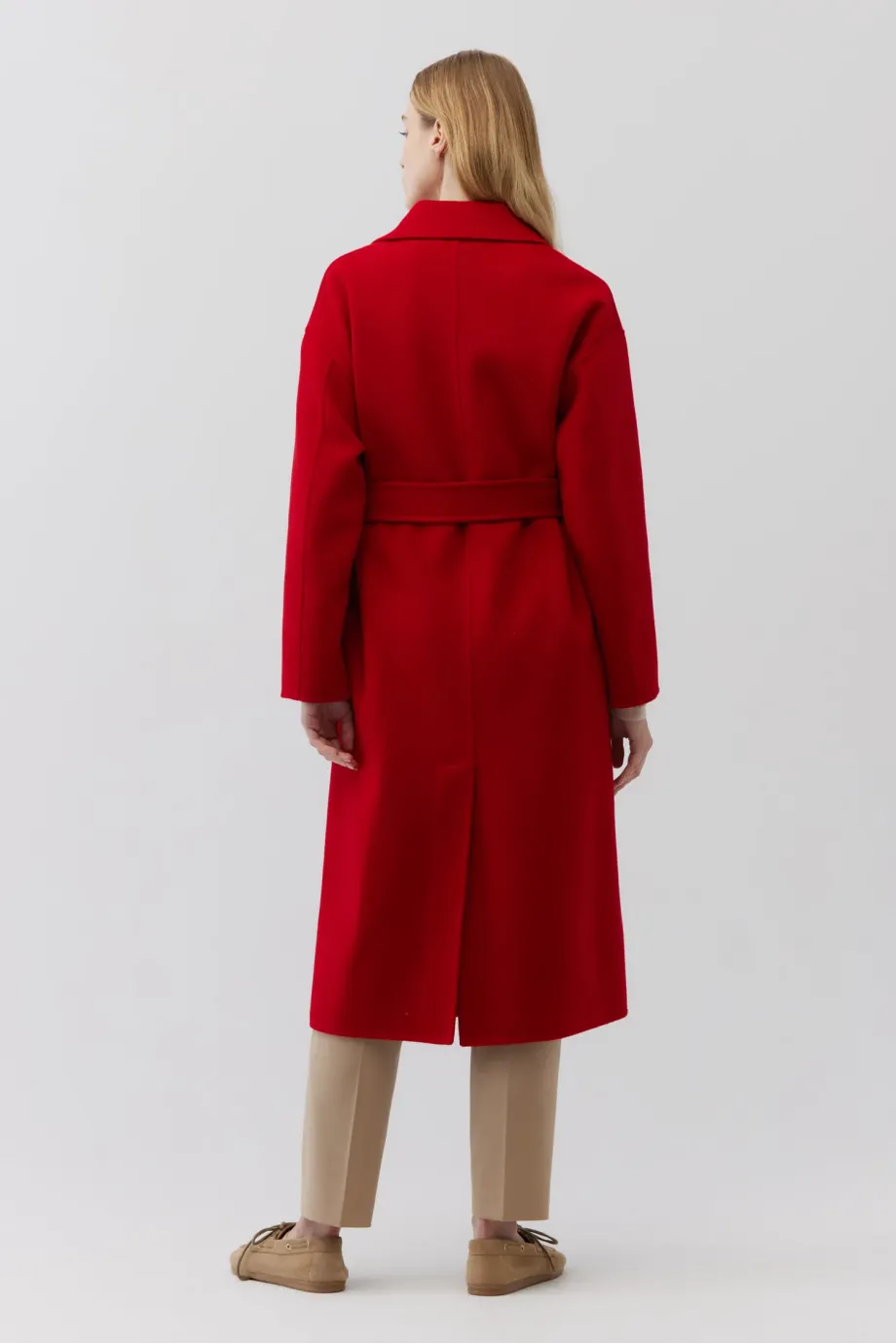 Dvouřadový kabát z tkaniny doubleface - směs vlny a hedvábí. Délka nad kolena, pásek v pase, klopový límec. Lehký, nepodšitý. Na zadní straně rozvent. Barva červená.