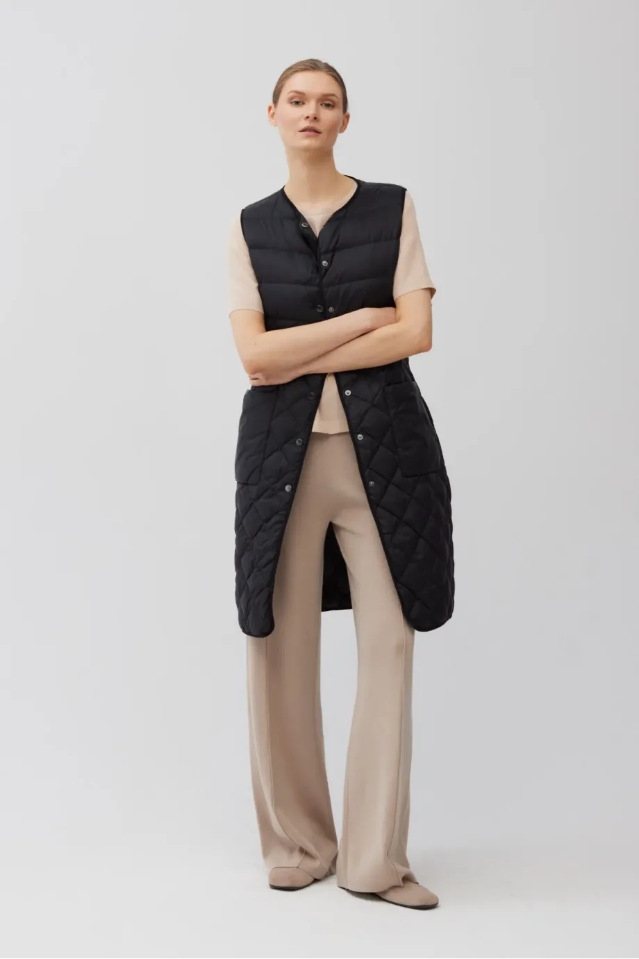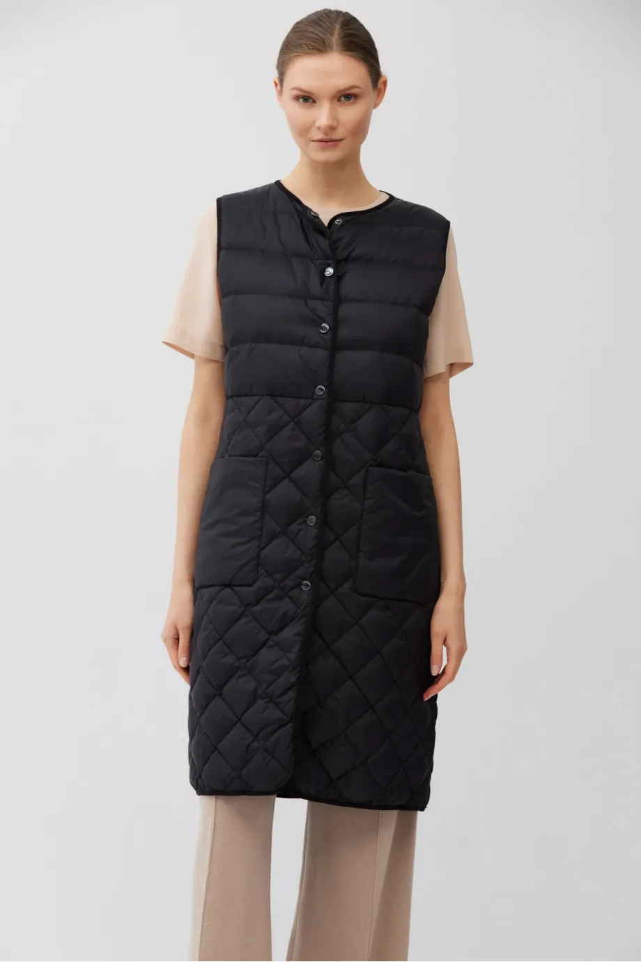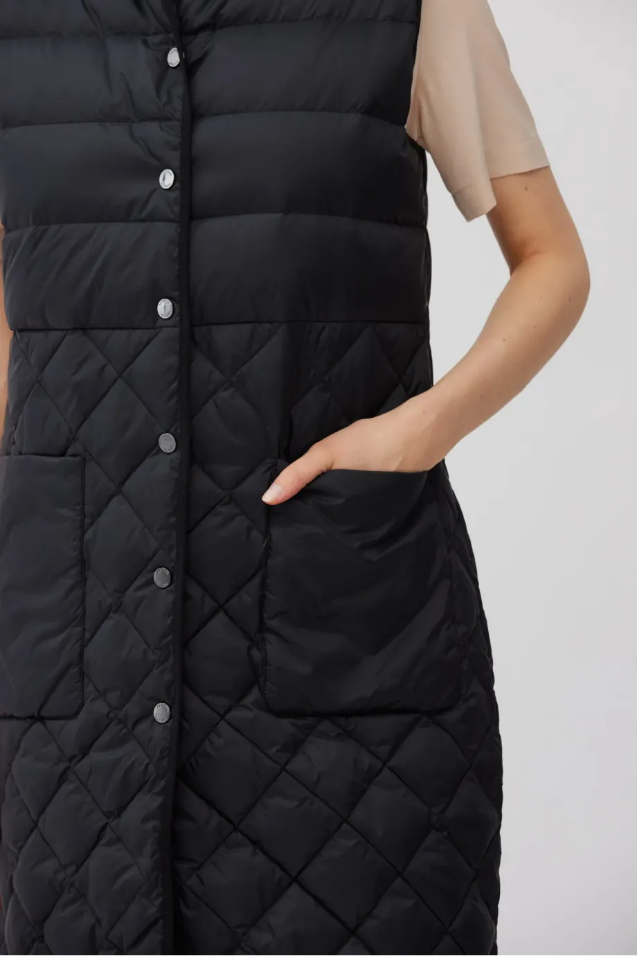 Lehká vesta s přírodním péřovým výplní. Zapínání na patentky. Přední našité kapsy. Jednoduchý střih – na samostatné nošení nebo jako vrstvení pod kabát. Barva černá.