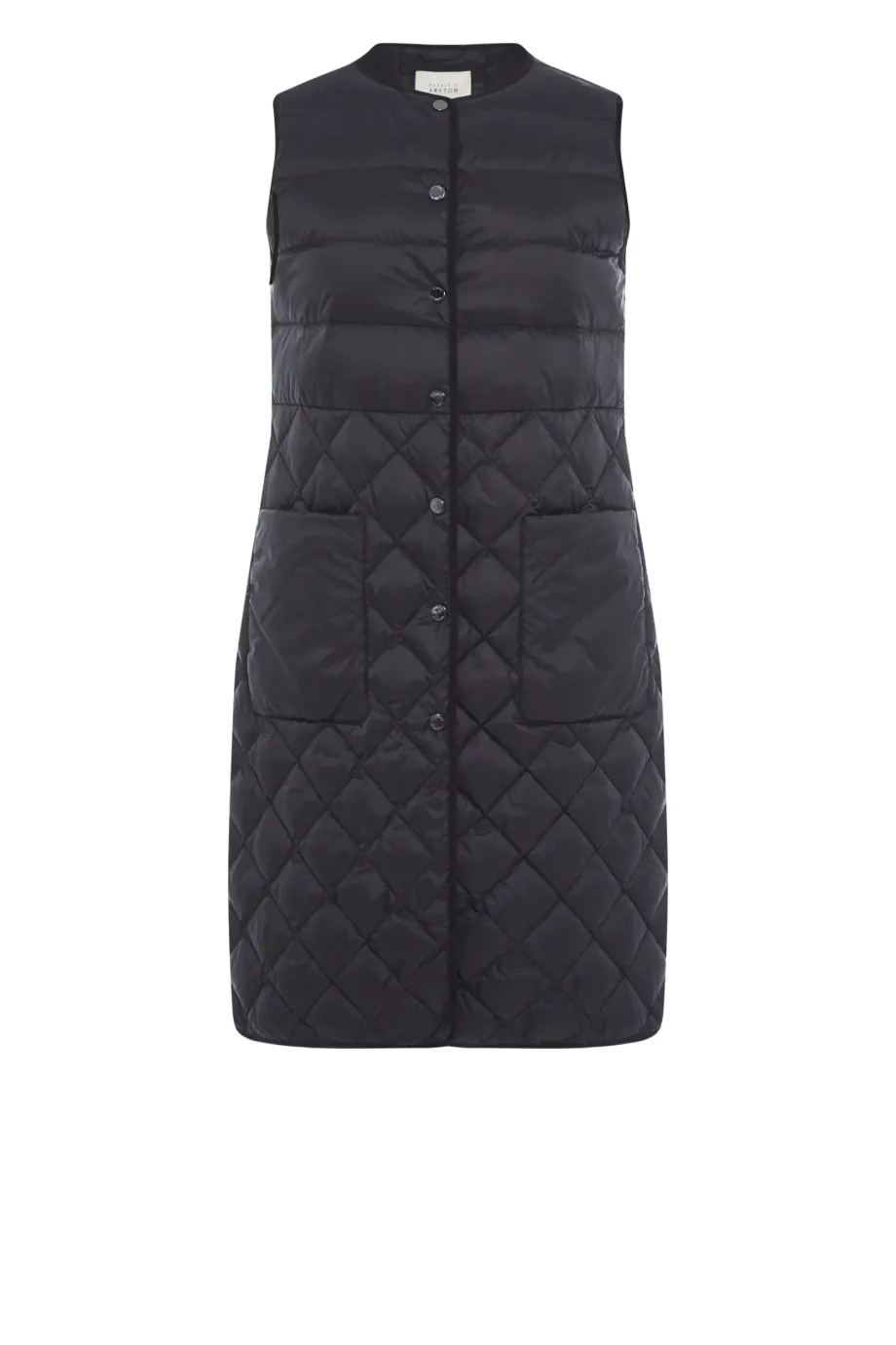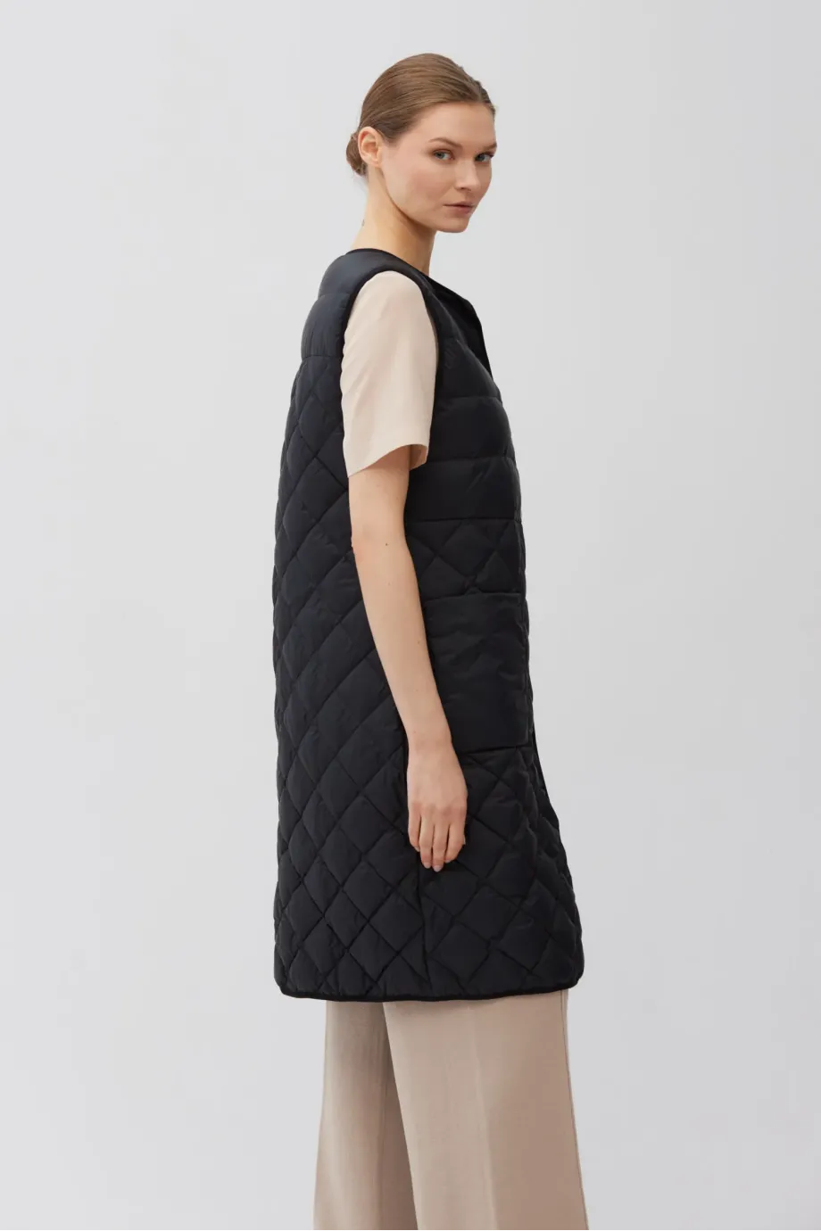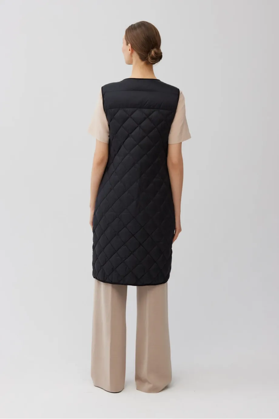 Lehká vesta s přírodním péřovým výplní. Zapínání na patentky. Přední našité kapsy. Jednoduchý střih – na samostatné nošení nebo jako vrstvení pod kabát. Barva černá.