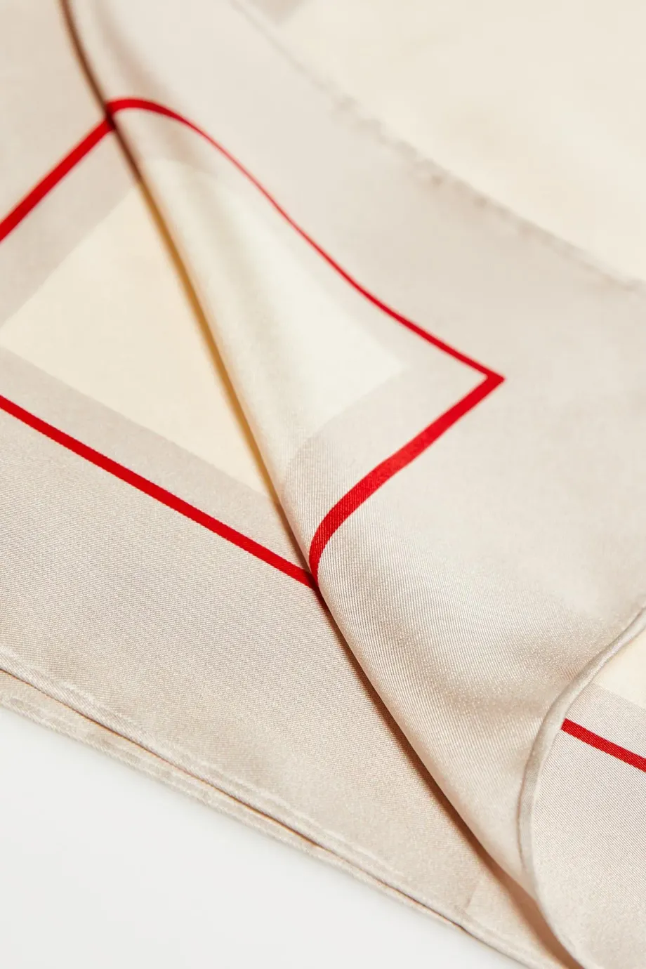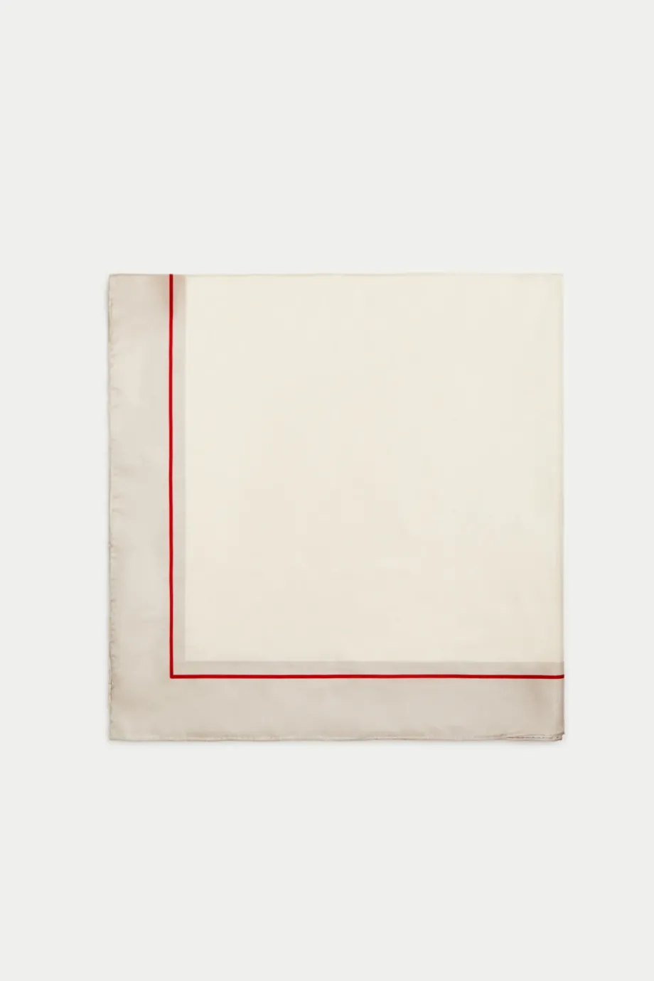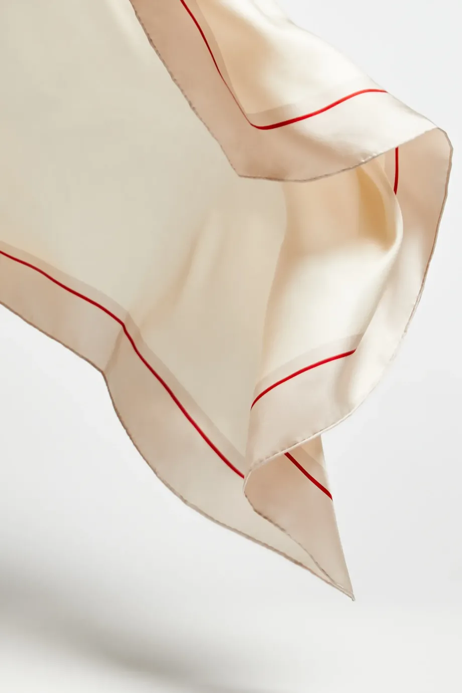 Hedvábný šátek v minimalistické paletě - odstíny béžové s kontrastním akcentem červené.