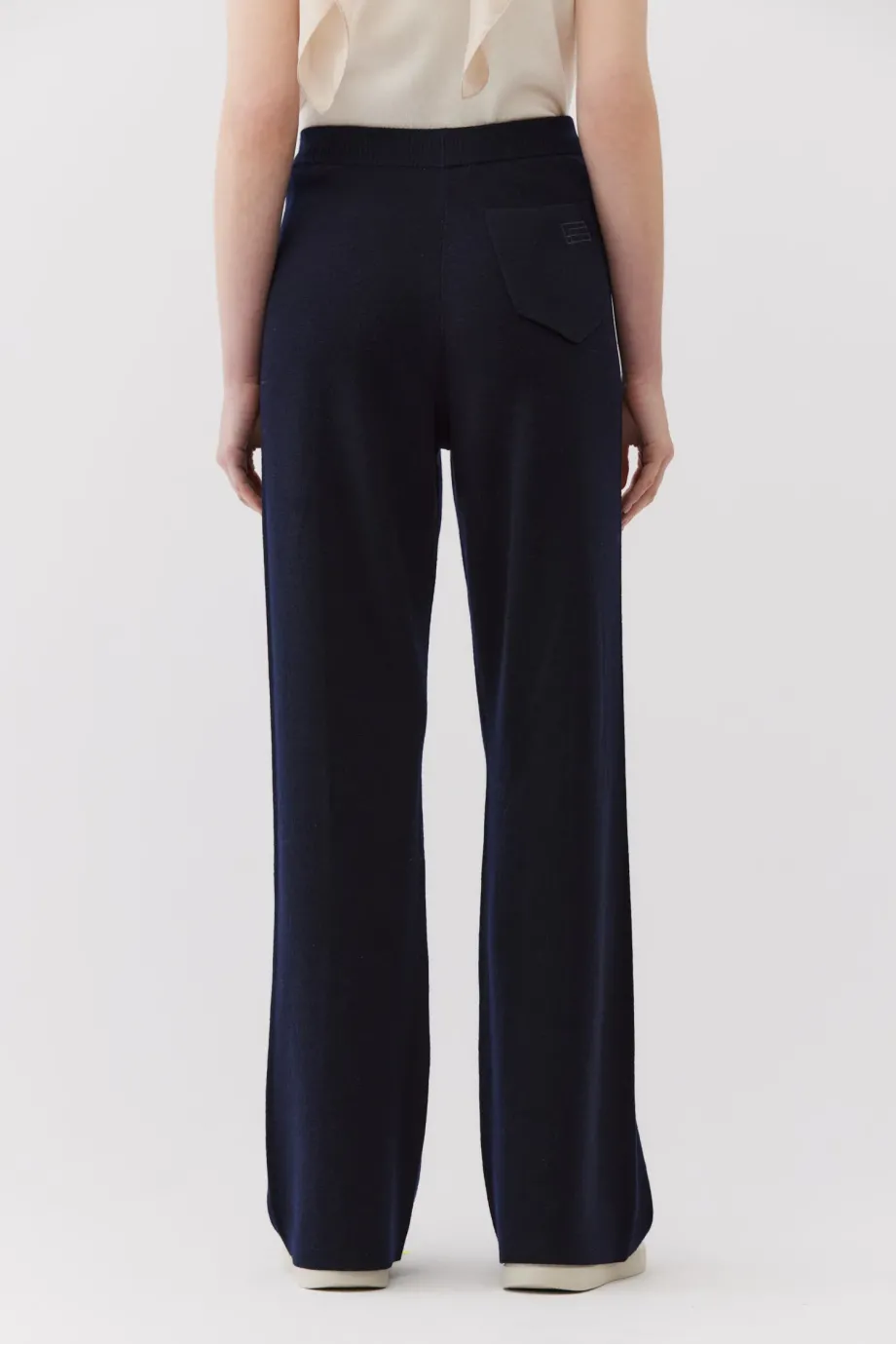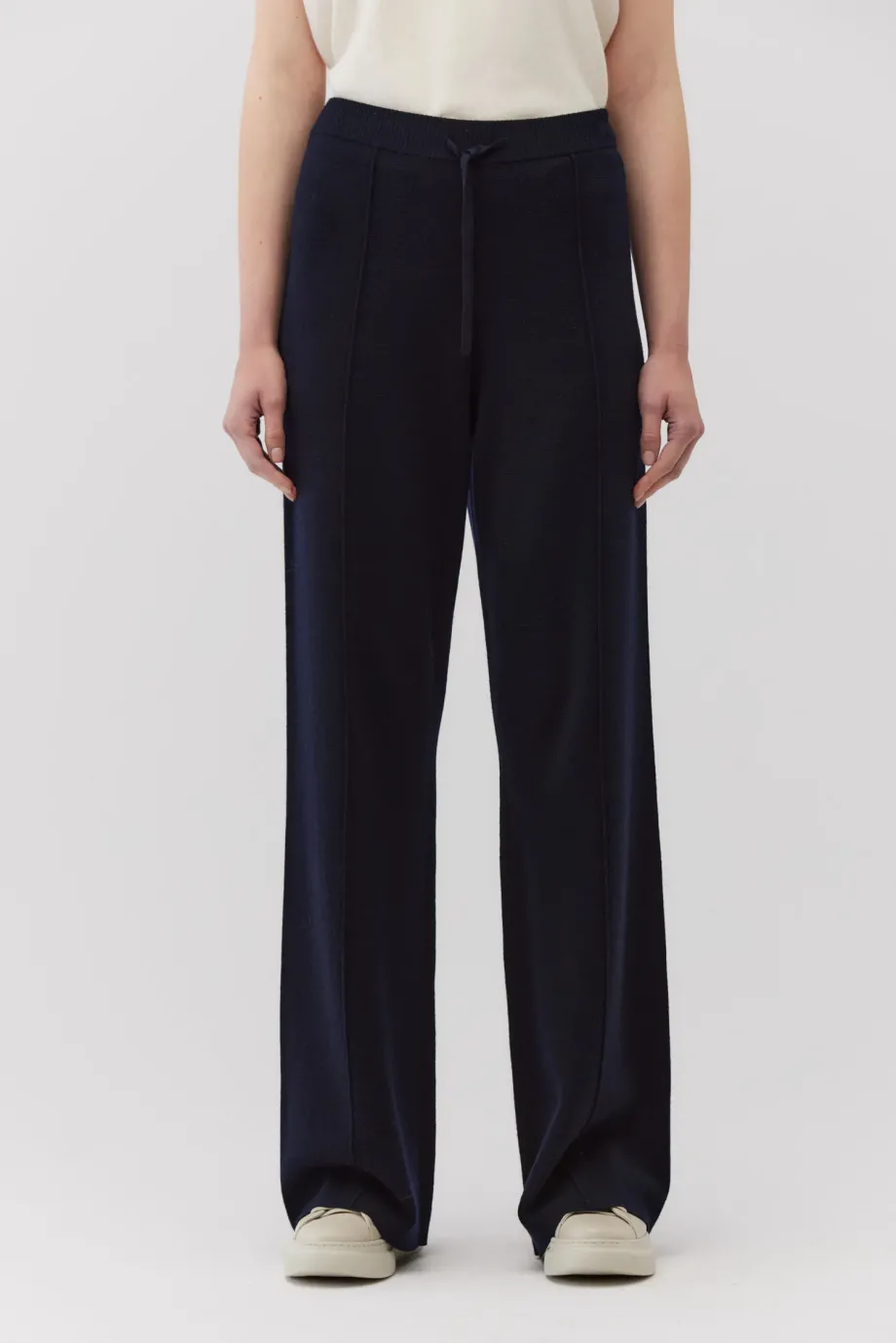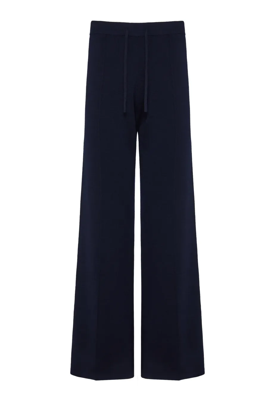 Kalhoty z merino vlny. Široké nohavice. Barva námořnická modř. Pletenina s hustým vzorem full milano. Elastický pas s regulací.