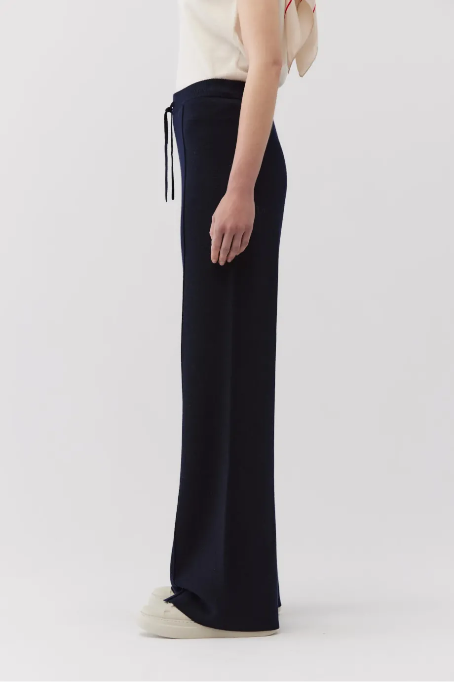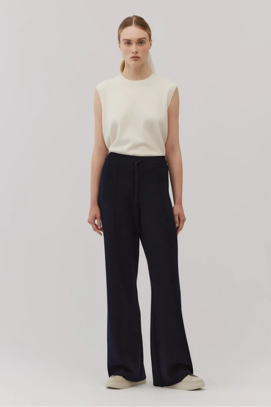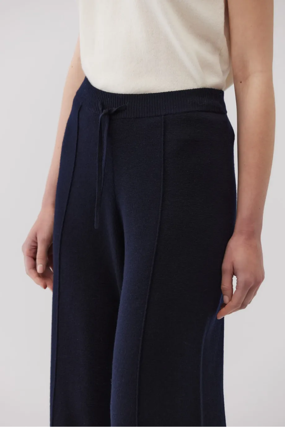 Kalhoty z merino vlny. Široké nohavice. Barva námořnická modř. Pletenina s hustým vzorem full milano. Elastický pas s regulací.
