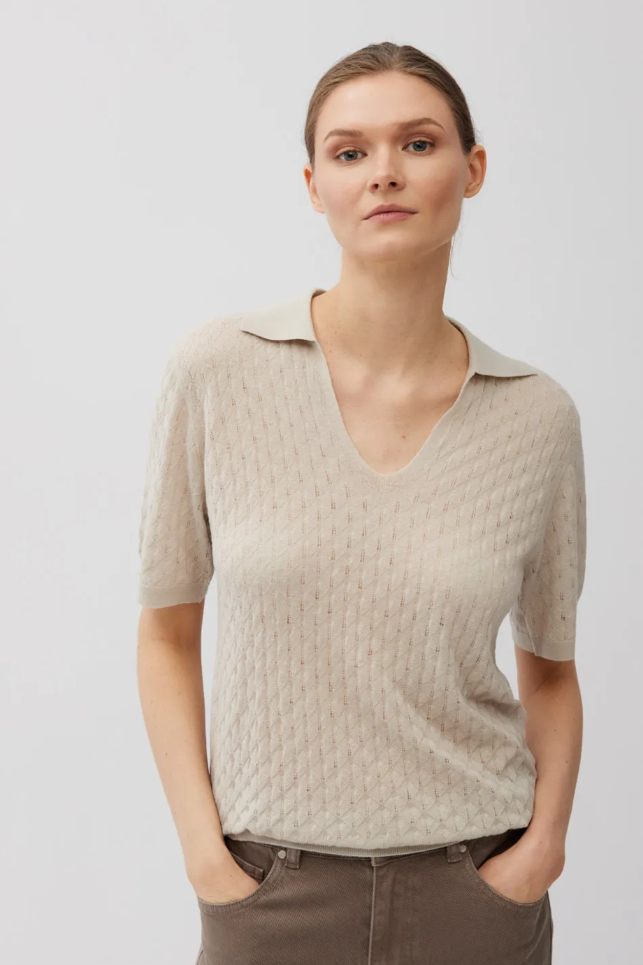 Halenka z merino vlny, s jemným úpletem, připravená na stroji s jemností 18 GG. Ozdobný vzor pointelle. Krátký rukáv, výstřih do V s límečkem. Barva béžová.