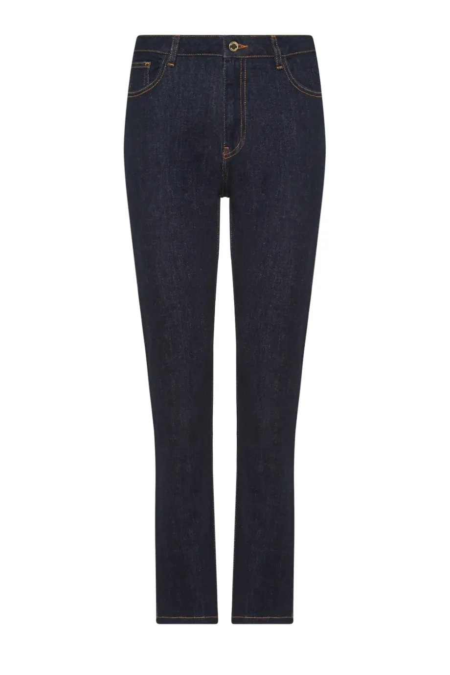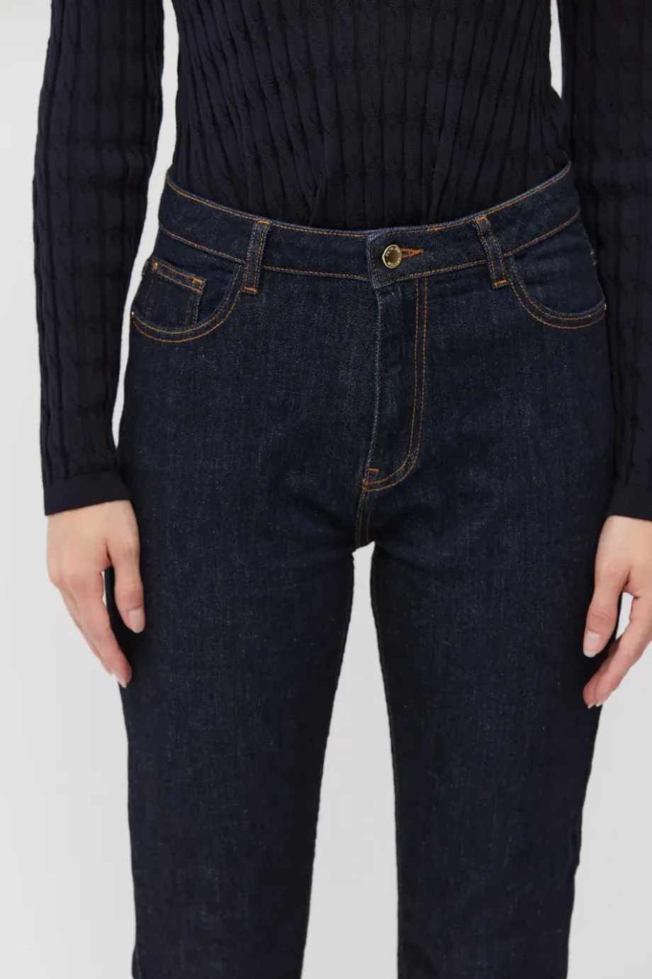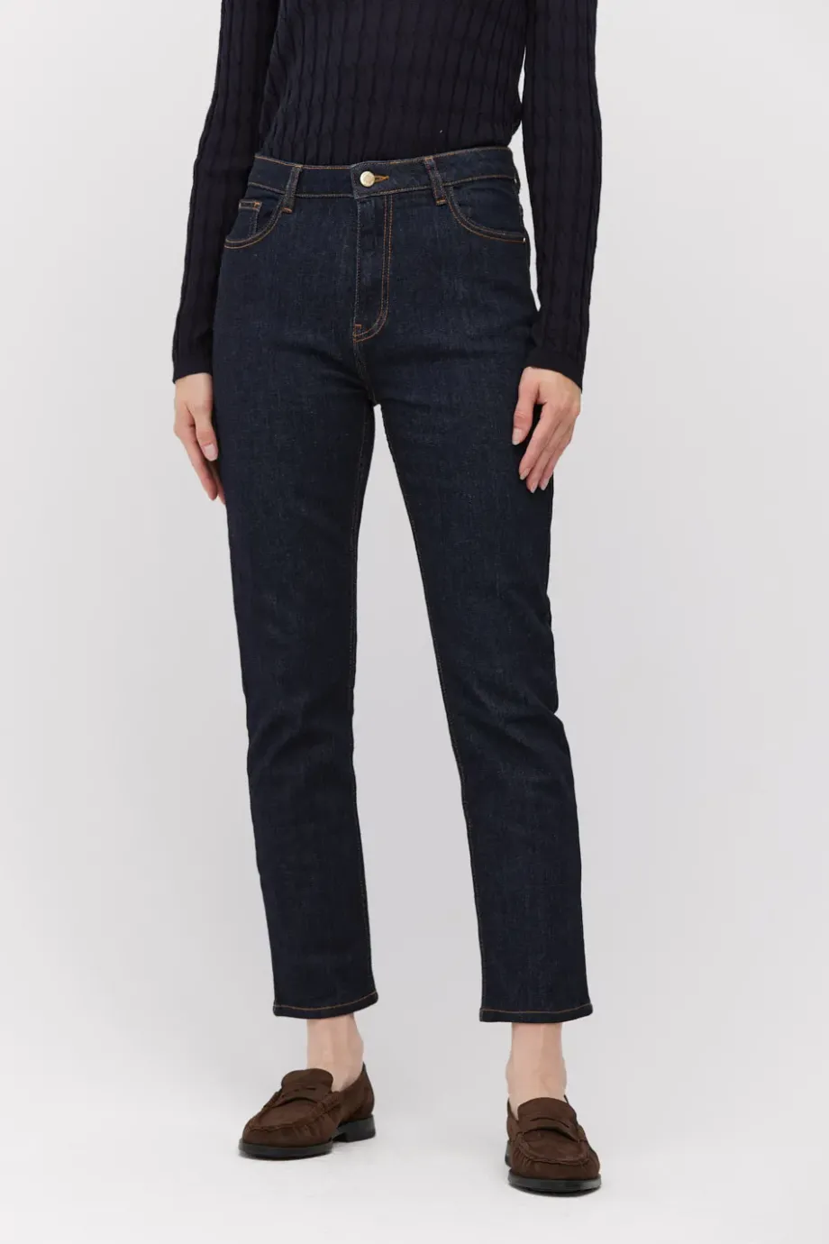 Straight fit jeans. Classic cut with five pockets. High waist. Zipper and metal button fastening. Made of cotton with a blend of elastane – soft and comfortable to wear. Color dark blue.