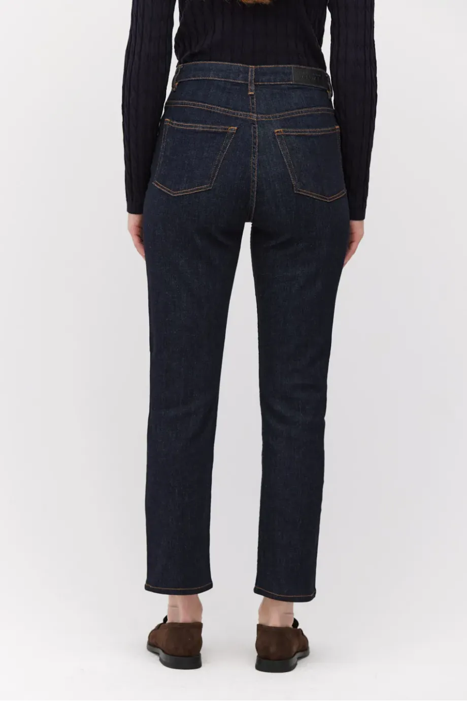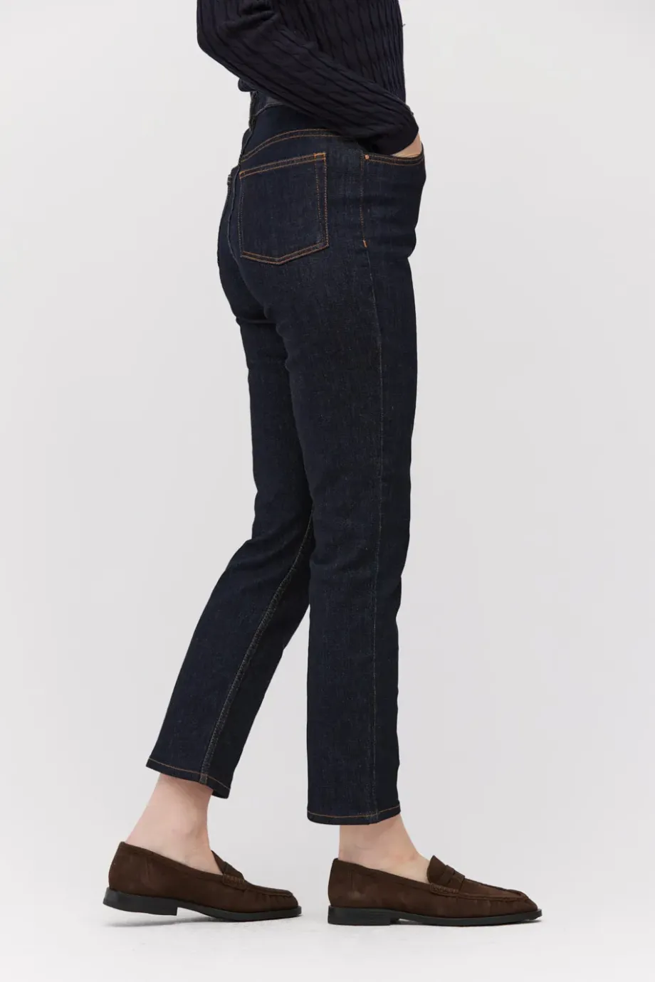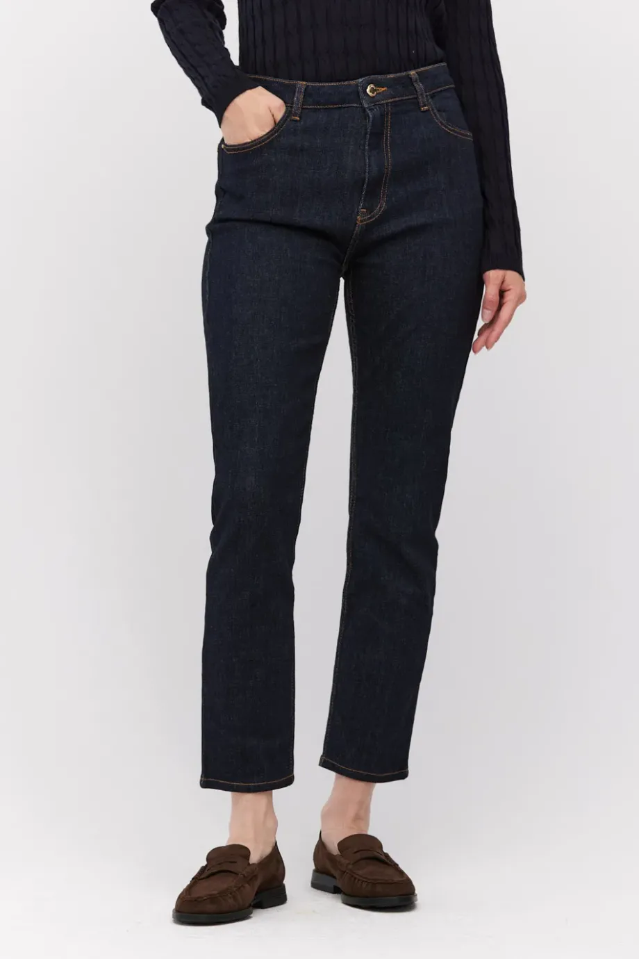 Straight fit jeans. Classic cut with five pockets. High waist. Zipper and metal button fastening. Made of cotton with a blend of elastane – soft and comfortable to wear. Color dark blue.