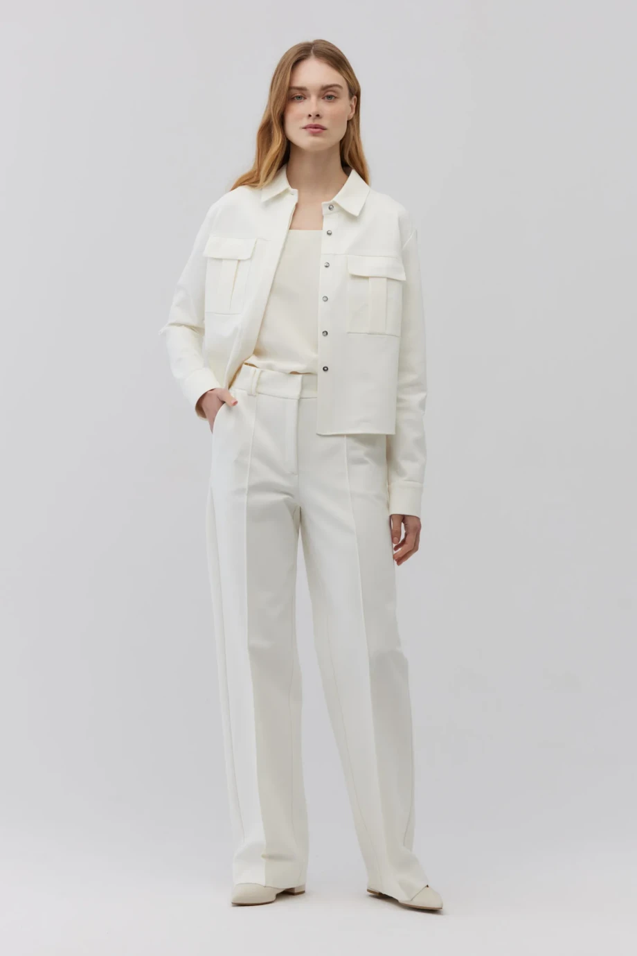 Bílý košilový blejzr. Jednoduchý, mírně boxový střih. Kapsy s klopami. Zapínání na patentky. K dispozici kalhoty.