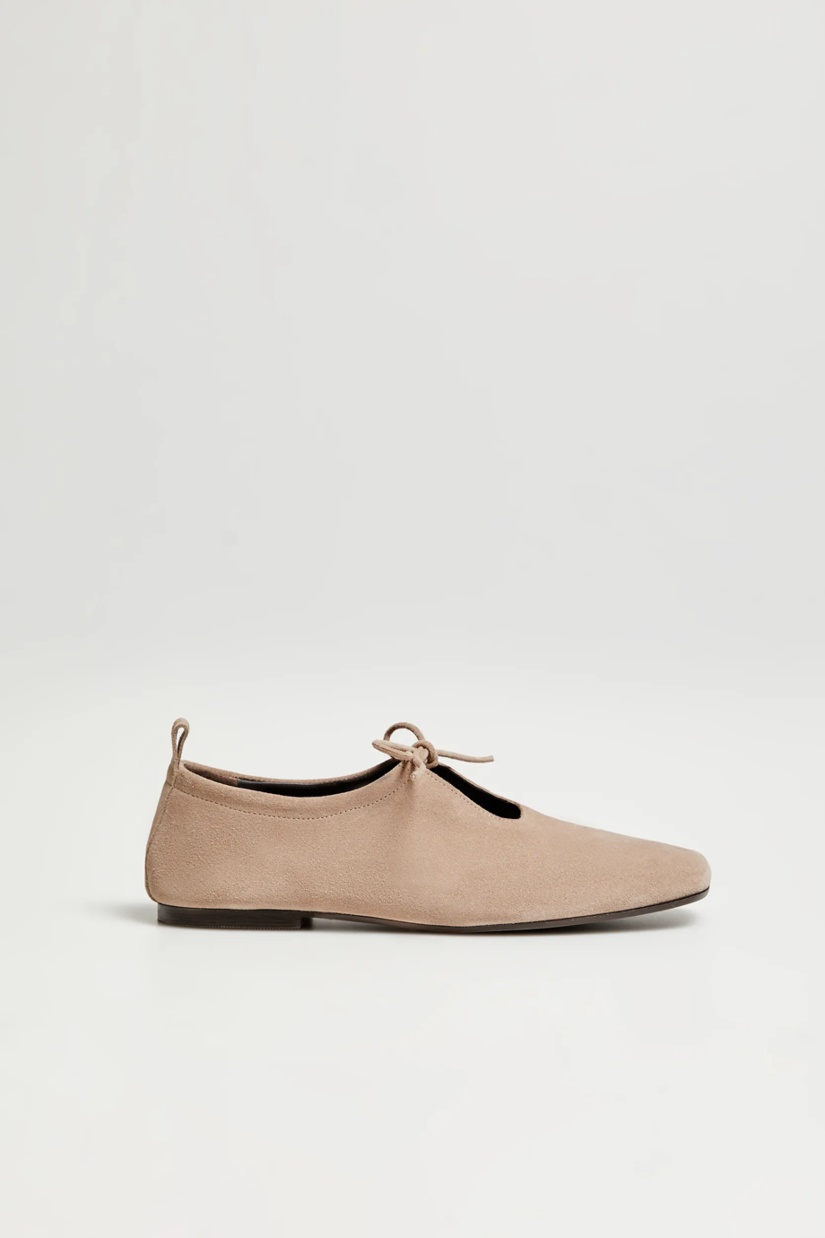 Soft natural suede leather. Laced model, on a flat sole. Color beige. Also available in red. Handcrafted in a Spanish workshop.