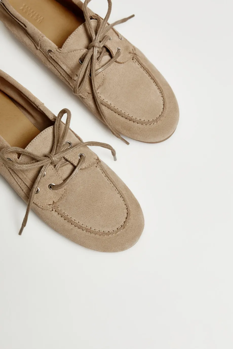 Buty typu lodní botyMěkká, přírodní paknová kůže. Kovové oko, ozdobné prošívání a kožené šněrování kolem svršku. Barva béžová. Ručně šité v portugalské manufaktuře.