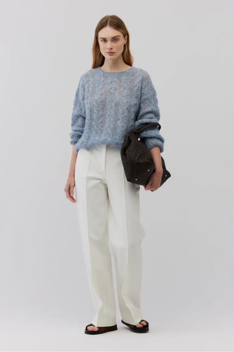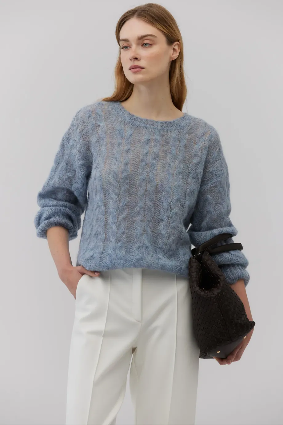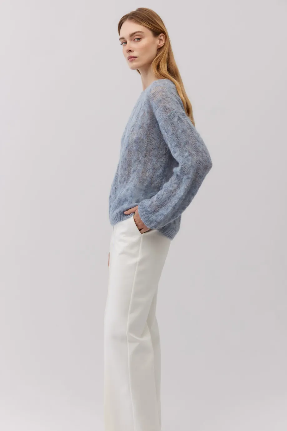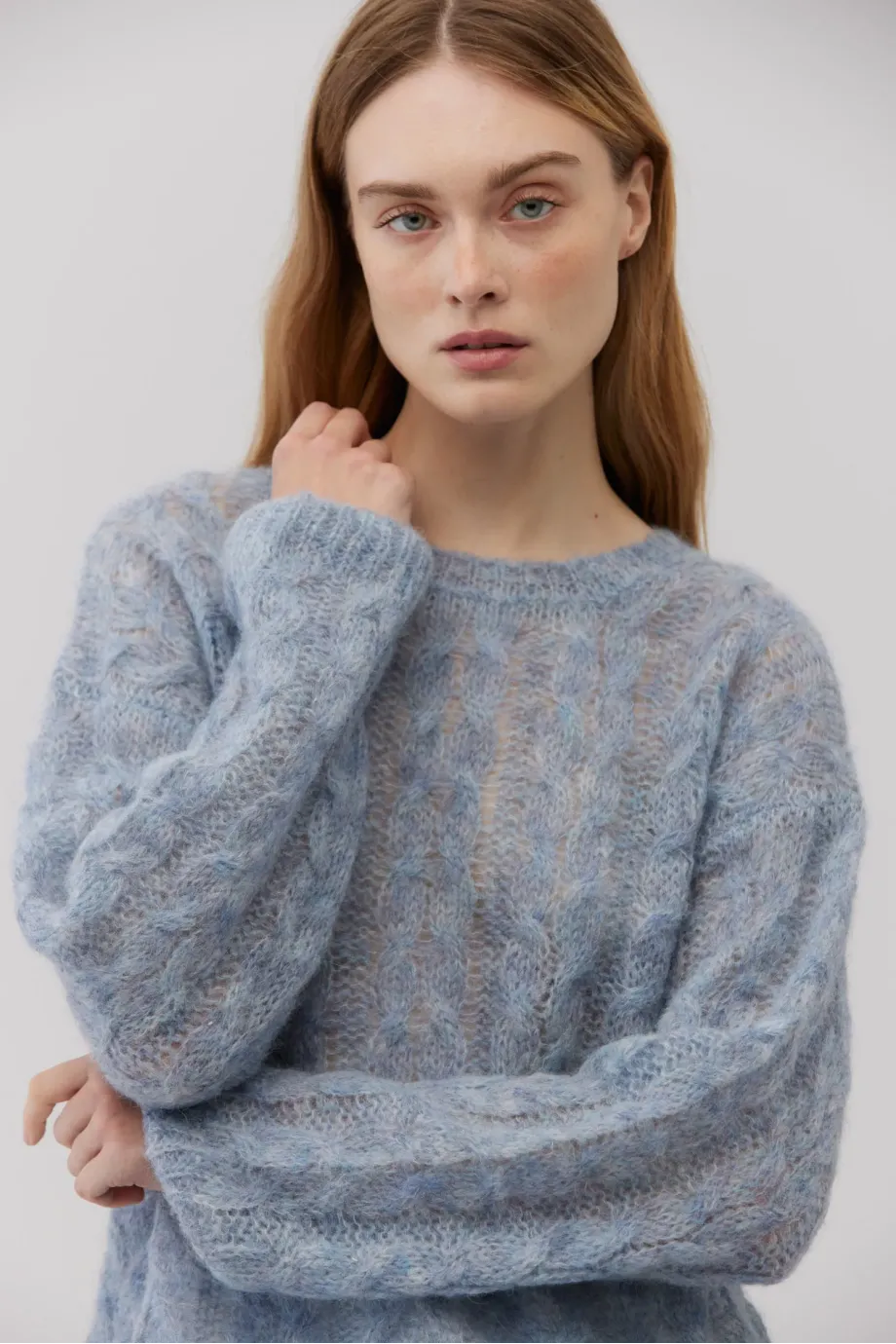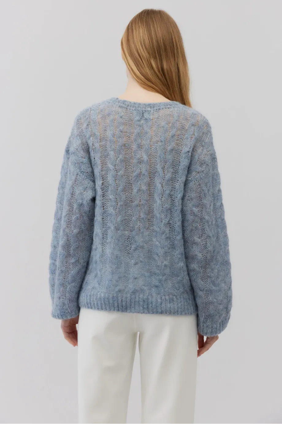 Měkký svetr klasického střihu. Kulatý výstřih. Dlouhé rukávy zakončené nápletem. Volná pletenina s copánkovým vzorem. s dlouhými vlasy vyrobený z alpaky. Barva světle modrá.