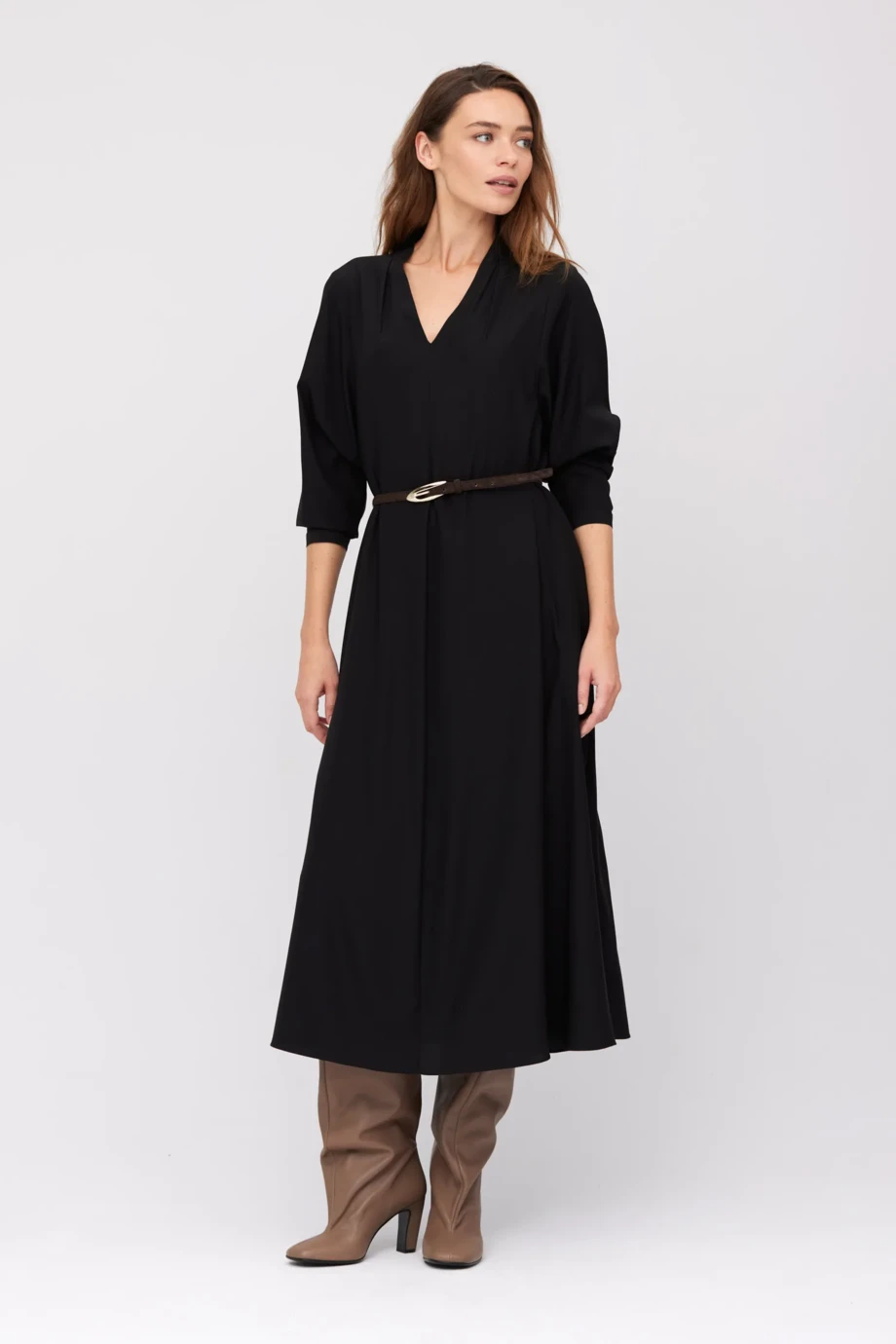 Černé midi šaty z hedvábí. Jemně rozšířený střih s výstřihem do V. Rukávy 3/4 s knoflíkovým zapínáním. Po stranách hluboké rozparky. Zadní knoflíkové zapínání. Kapsy v bočních švech.