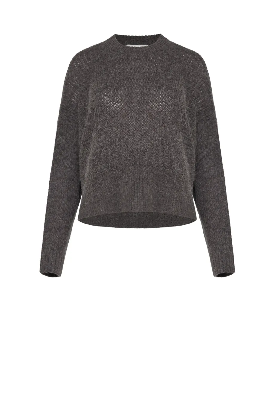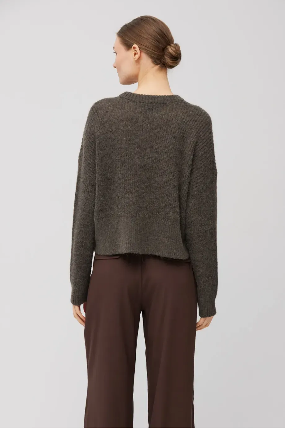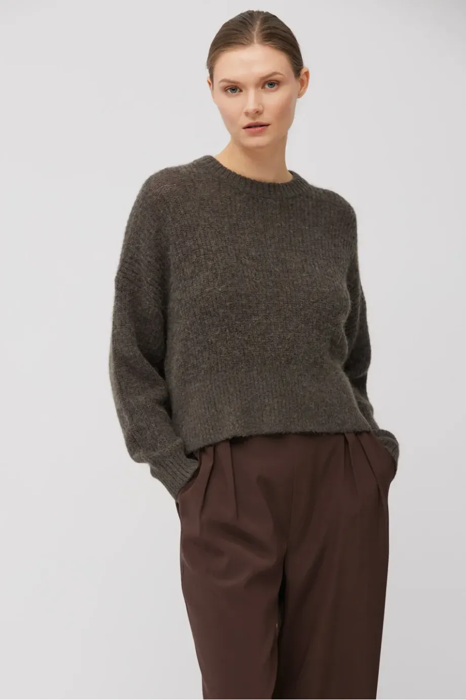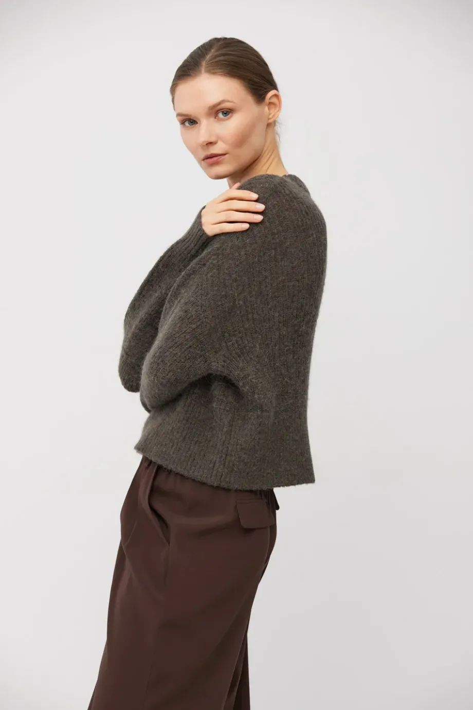 Doplněk s kulatým výstřihem a dlouhým rukávem. Vyrobeno z pleteniny plain knit na stroji o úhlu 3 GG. Pletenina s příměsí vlny alpak – teplá a nadýchaná. Barva tlumená hnědá.