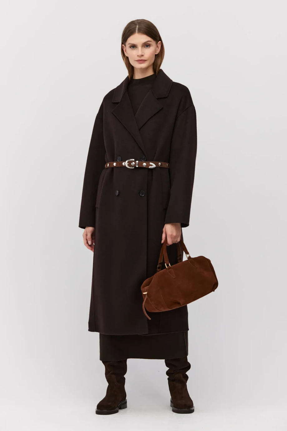 Dvouřadový kabát z doubleface tkaniny - směs vlny a hedvábí. Délka pod kolena, pásek v pase, klopový límec. Lehký, nepodšívkovaný. Na zadní straně rozvent. Barva hnědá.