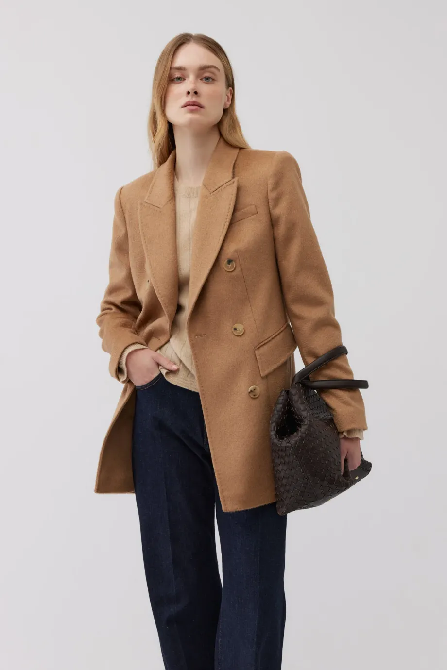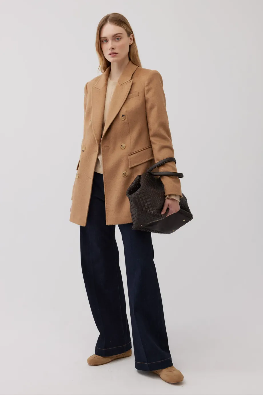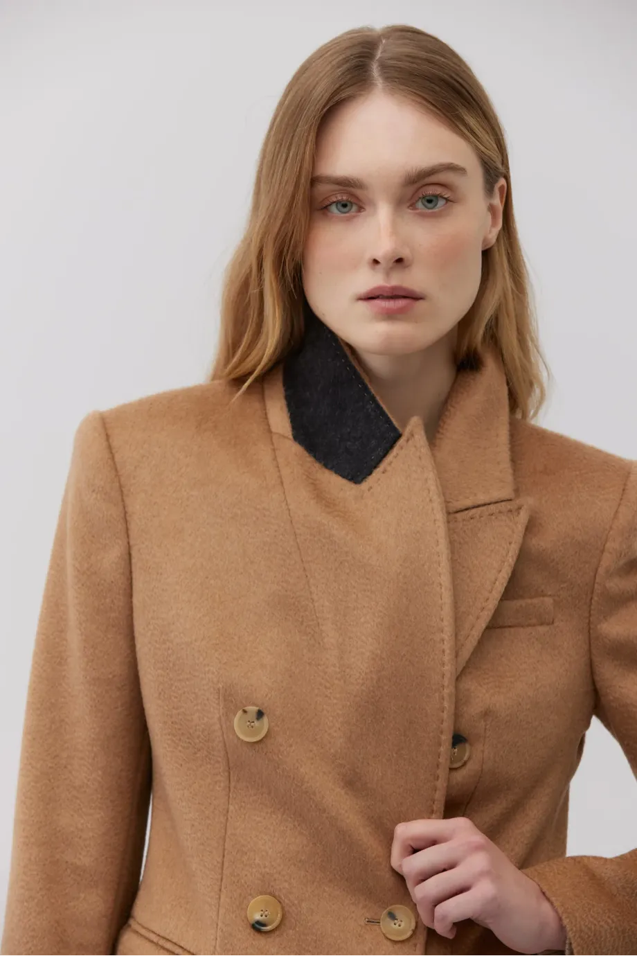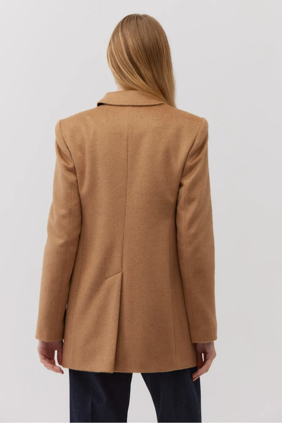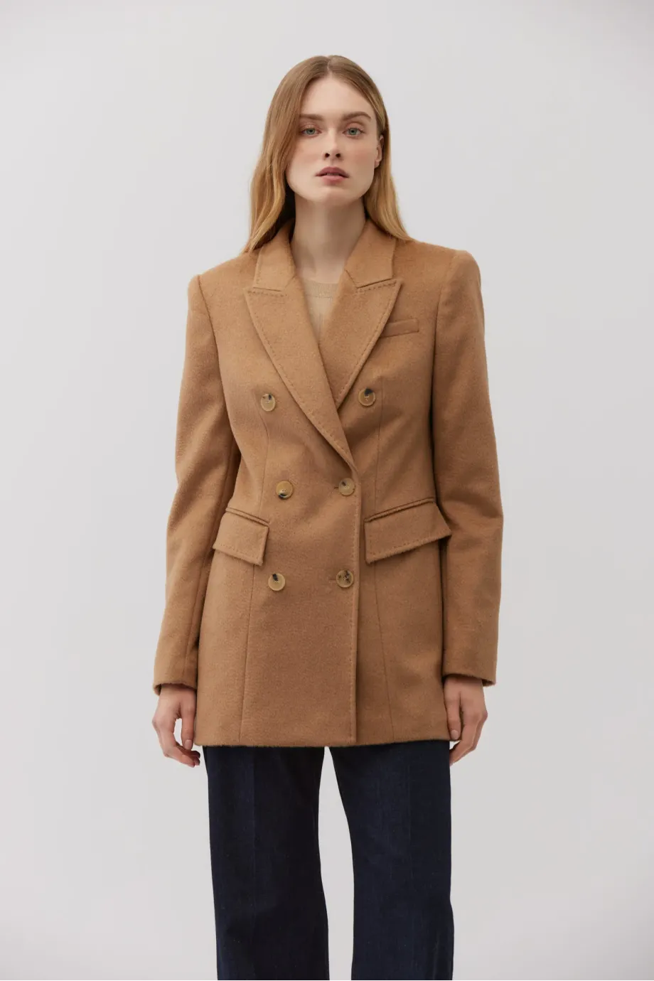 Kurtka z velbloudí vlny, lehce nařasená. Narysovaná linie ramen. Celá podšita. Vzadu rozparek. Dekorativní stehování a lemování. Vnější knoflíky z přírodního rohu, vnitřní – z přírodního ořechu. Barva přírodní kamel.