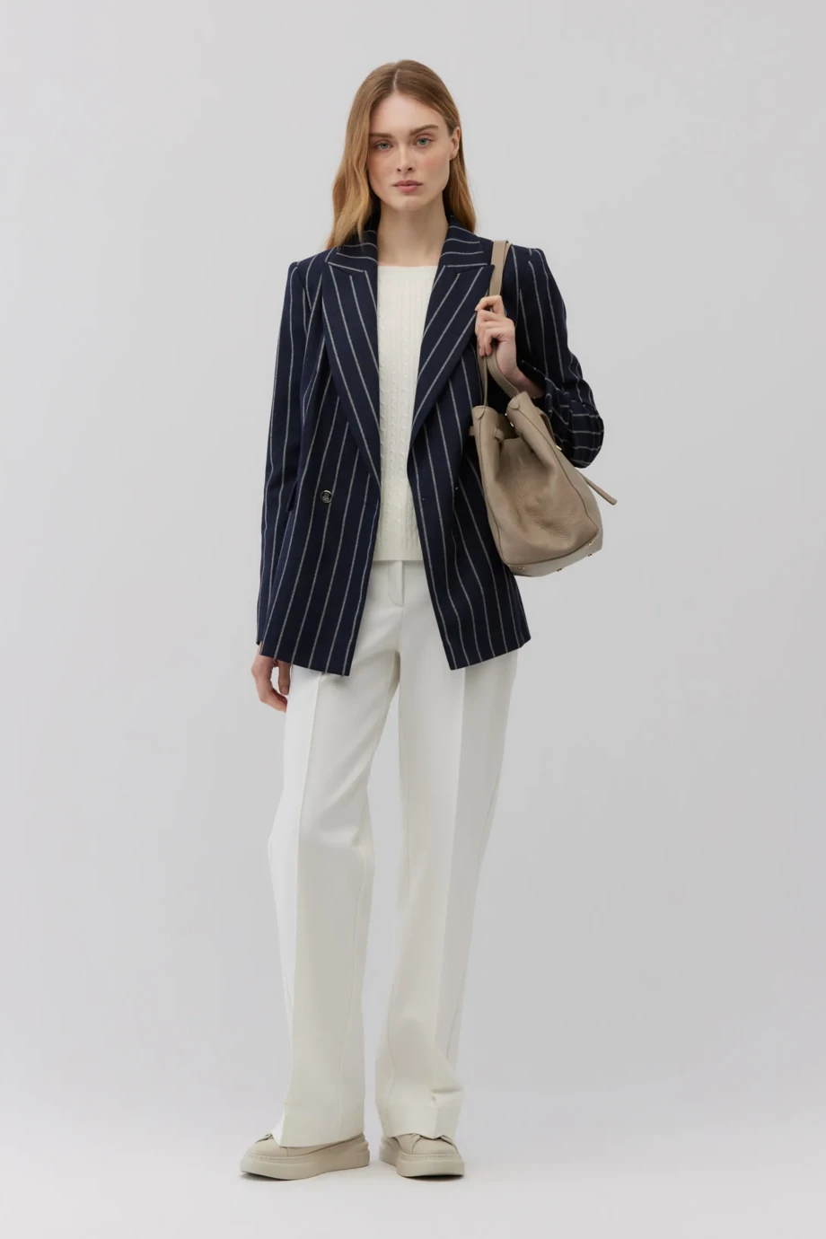 Tmavě modrý pruhovaný blejzr. Lehce vypasovaný. Dvouvrstvý. Dlouhé rukávy, kapsy. Vyrobeno z vlny s přídavkem kašmíru. Na polopodšívce. Z vnitřní strany lemování a lamino.