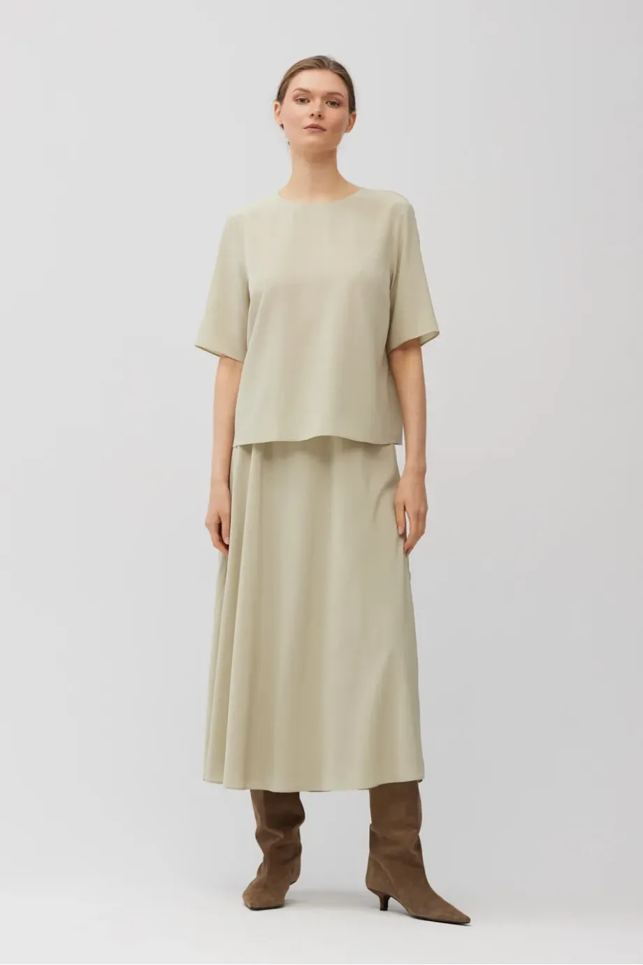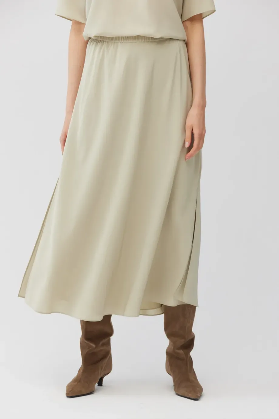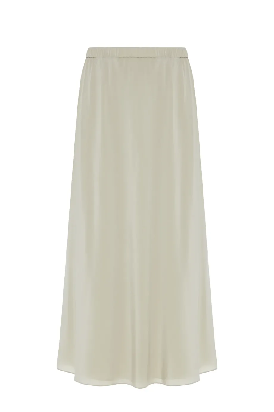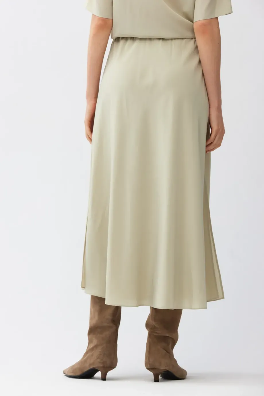 Hedvábná sukně v odstínu světlé zelené. Lehounká, volného střihu s elastickým pasem. Podšívka. Délka midi.
