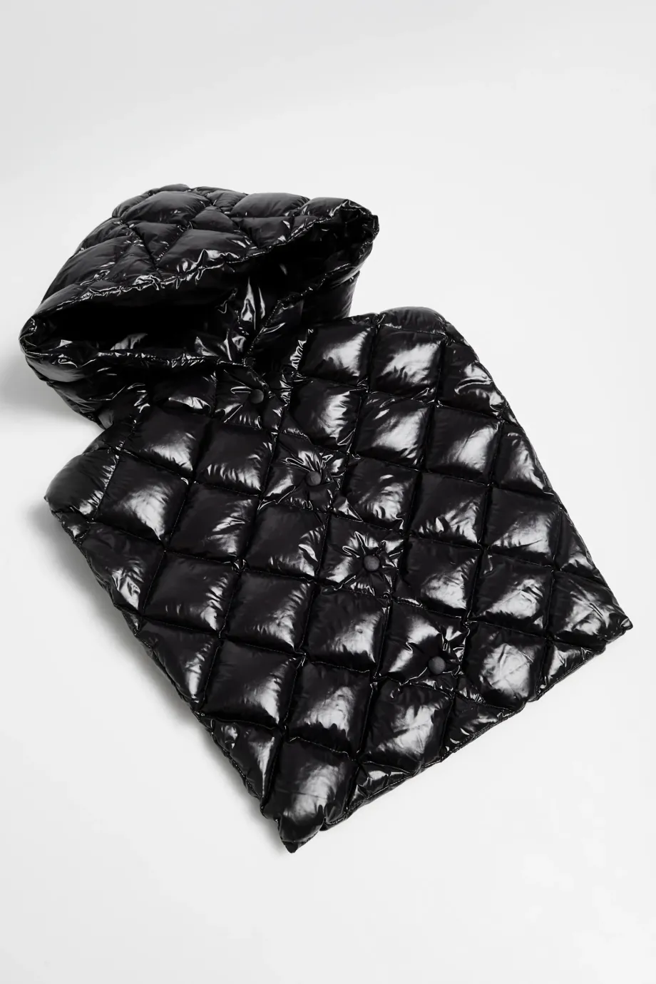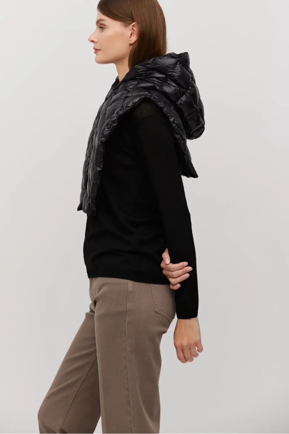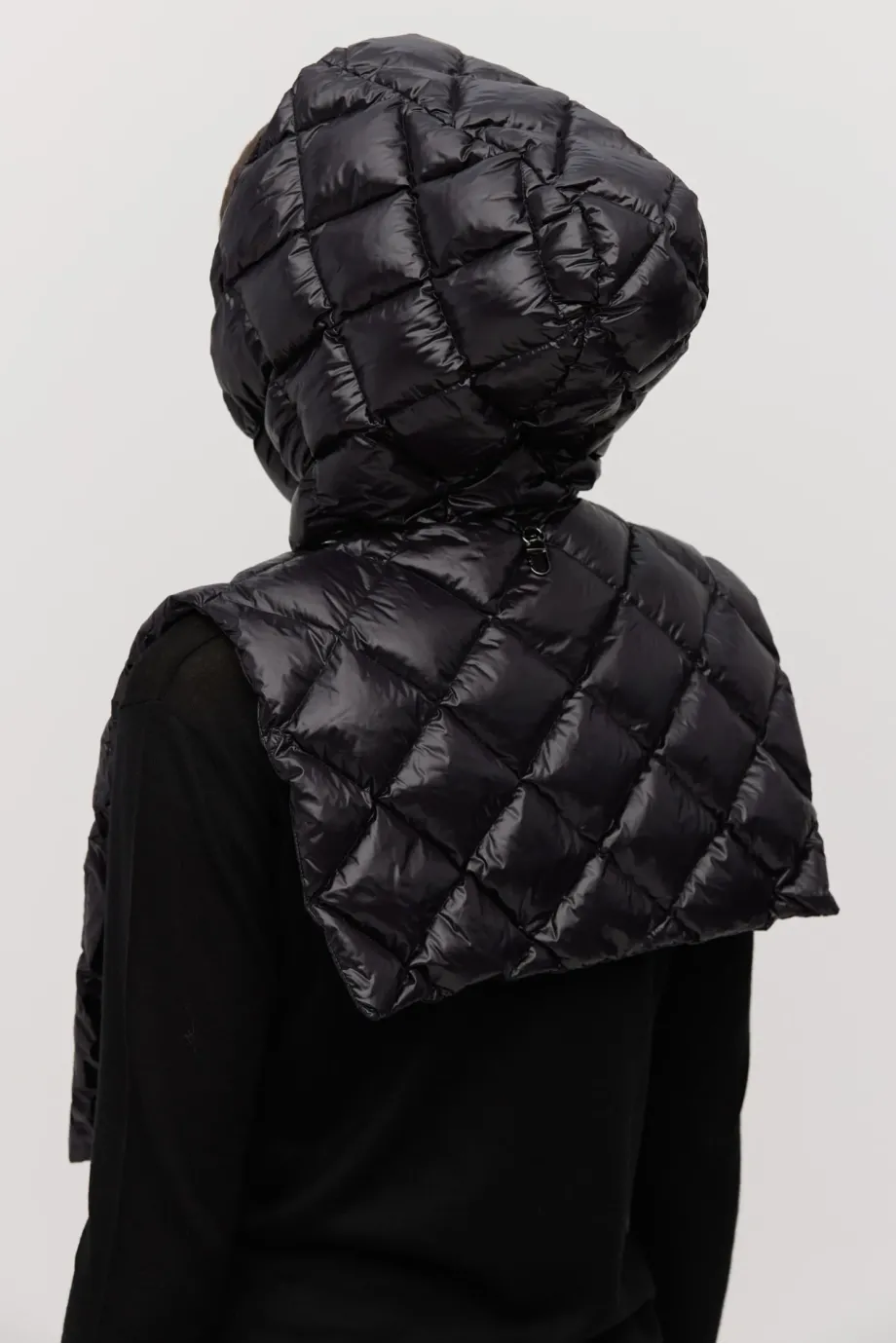Černá kapuce s přírodním výplněm, v jednom velikosti. Zapíná se vpředu na patentky, plní funkci zateplení kabátu.