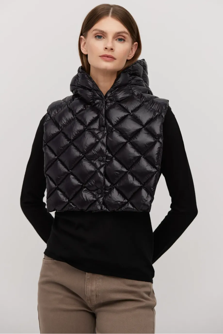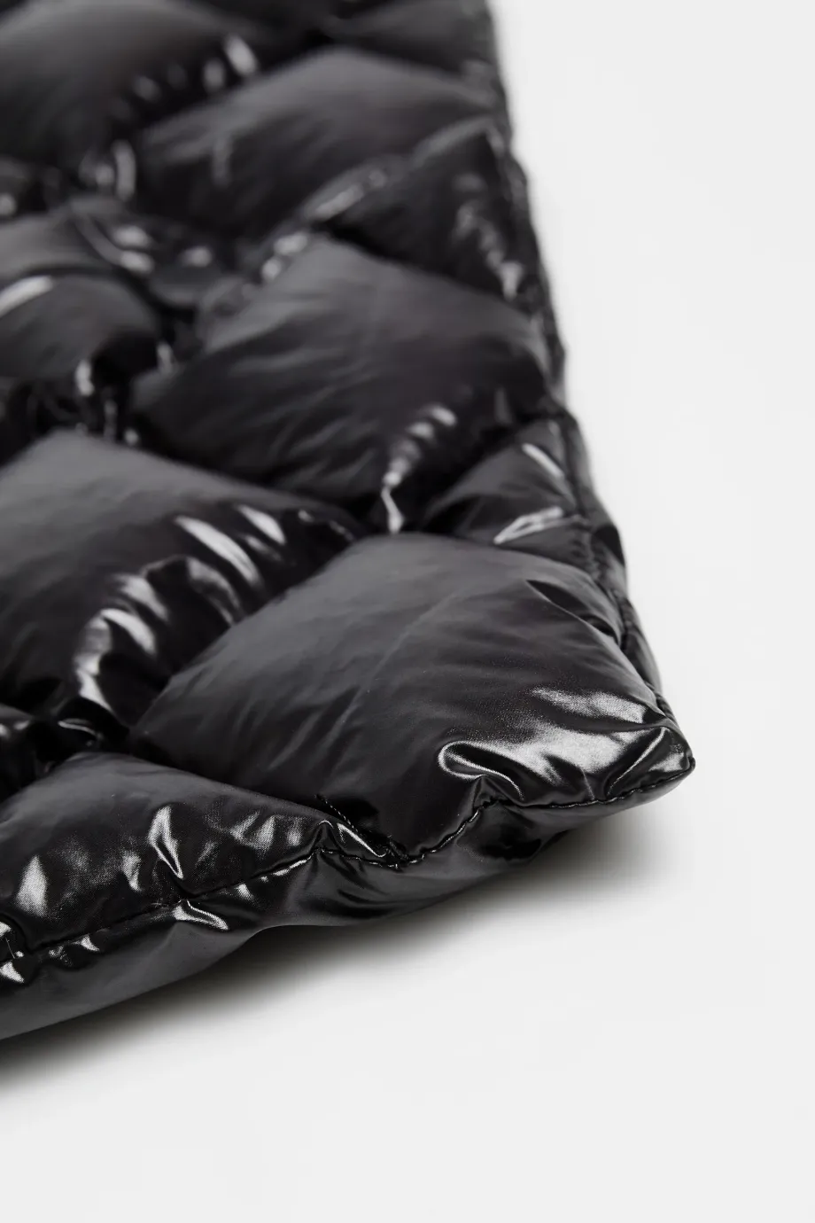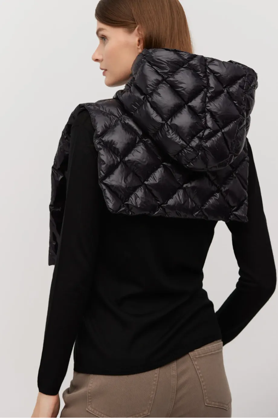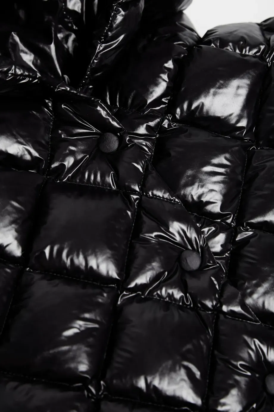 Černá kapuce s přírodním výplněm, v jednom velikosti. Zapíná se vpředu na patentky, plní funkci zateplení kabátu.