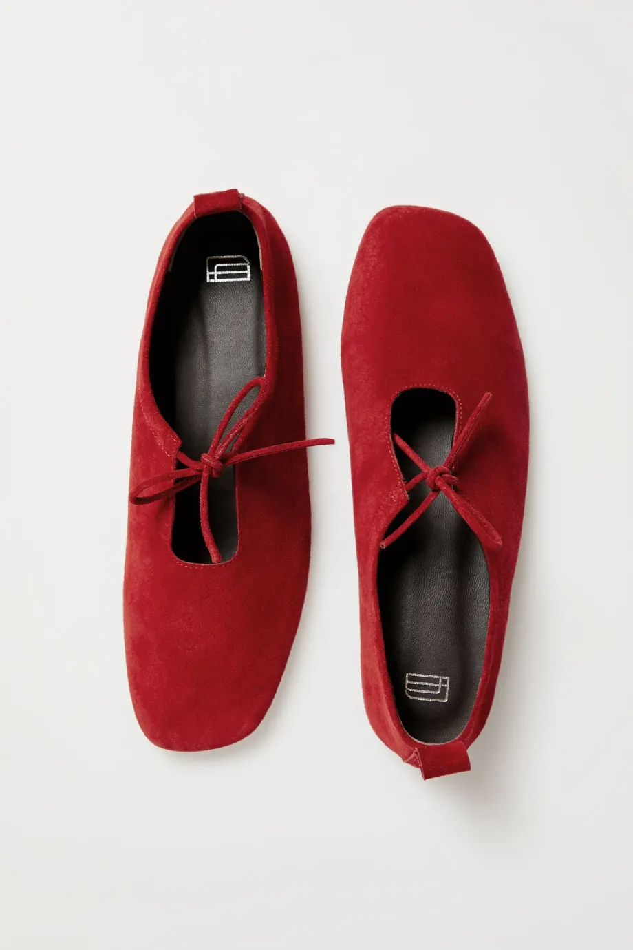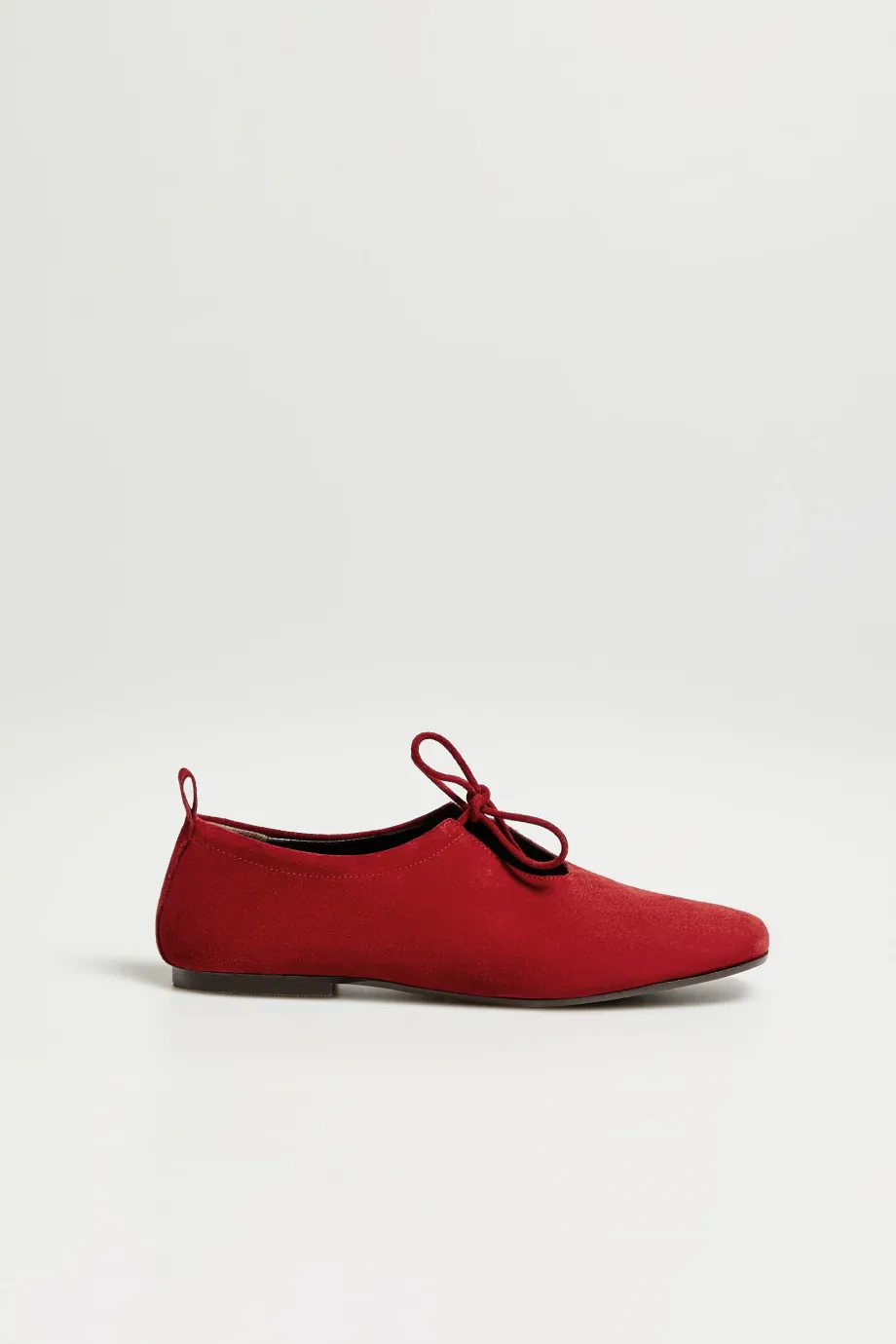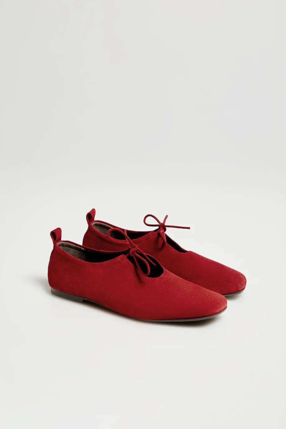 Měkká přírodní zamšová kůže. Model na šněrování, na ploché podrážce. Červená barva. K dispozici také v béžové. Ručně vyrobené ve španělské manufaktuře.