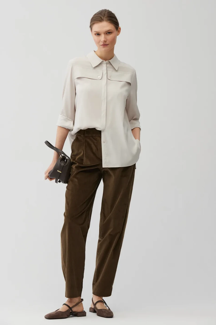 Kalhoty z měkké manšestrové tkaniny. Hnědá barva. Zúžené nohavice, elastický pas na zadní straně. Boční kapsy, vnitřní dekorativní detaily. Zapínání na ocelový háček a knoflík z přírodního ořechu corozo. Vyrobené z bavlny.