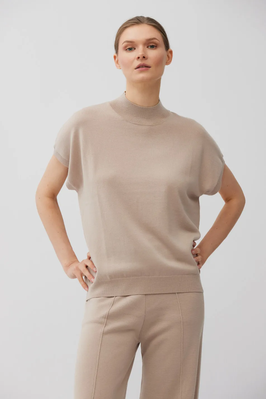 Halenka vyrobená z merinové vlny, v pletenině single jersey, uiglenie 14 GG. Krátký rukáv, kulatý výstřih, volný střih. Barva studená béžová. K doplnění soupravy kalhoty ze stejné pleteniny.