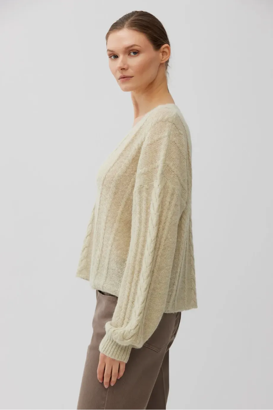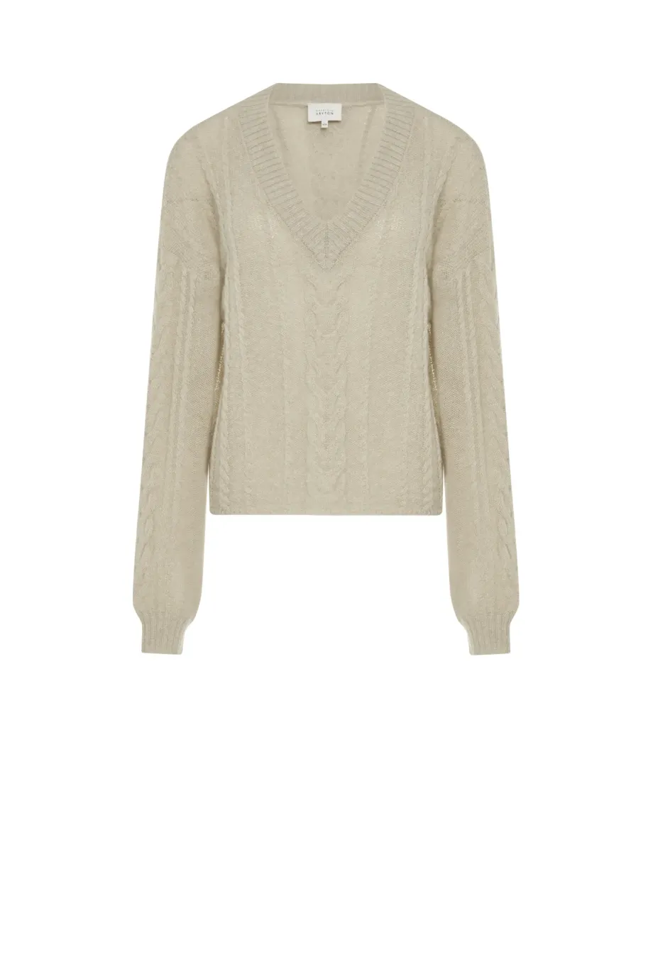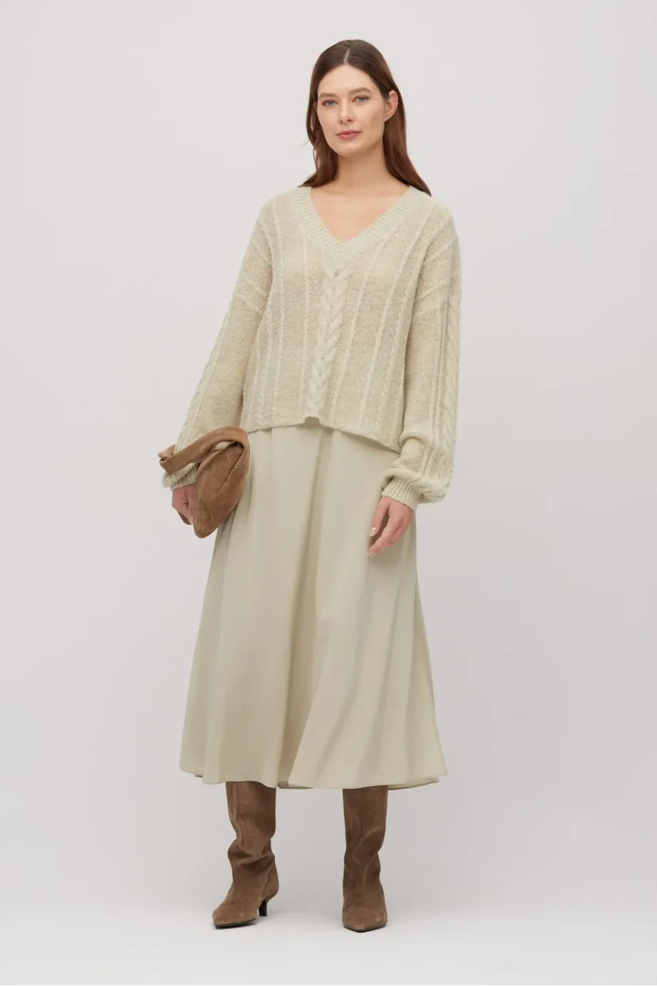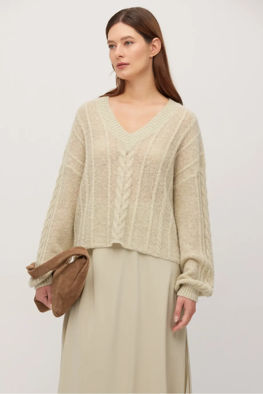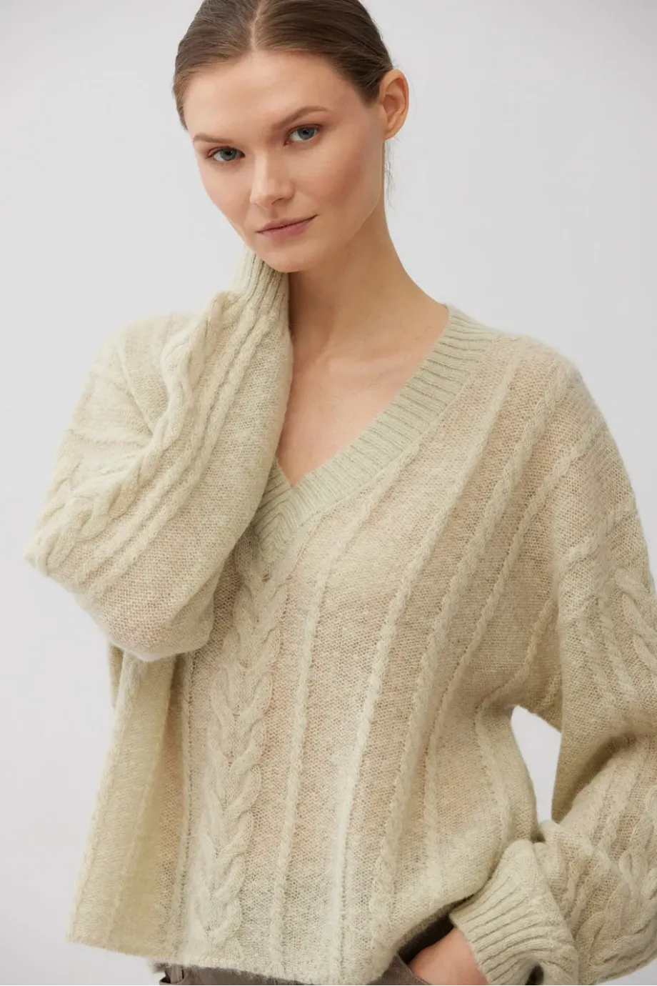 Svetr z alpaky. Volný střih s výstřihem do V. Vyrobený v pletenině typu cable knit s měkkou, prostornou strukturou. Pletenina připravená na stroji s jemností 7 GG. Barva světle zelená.