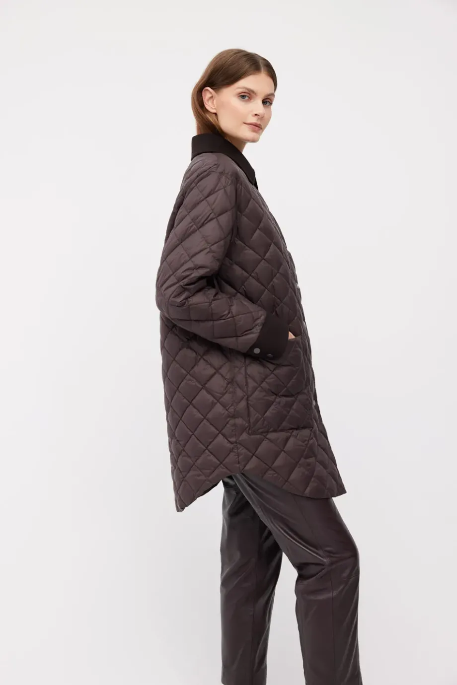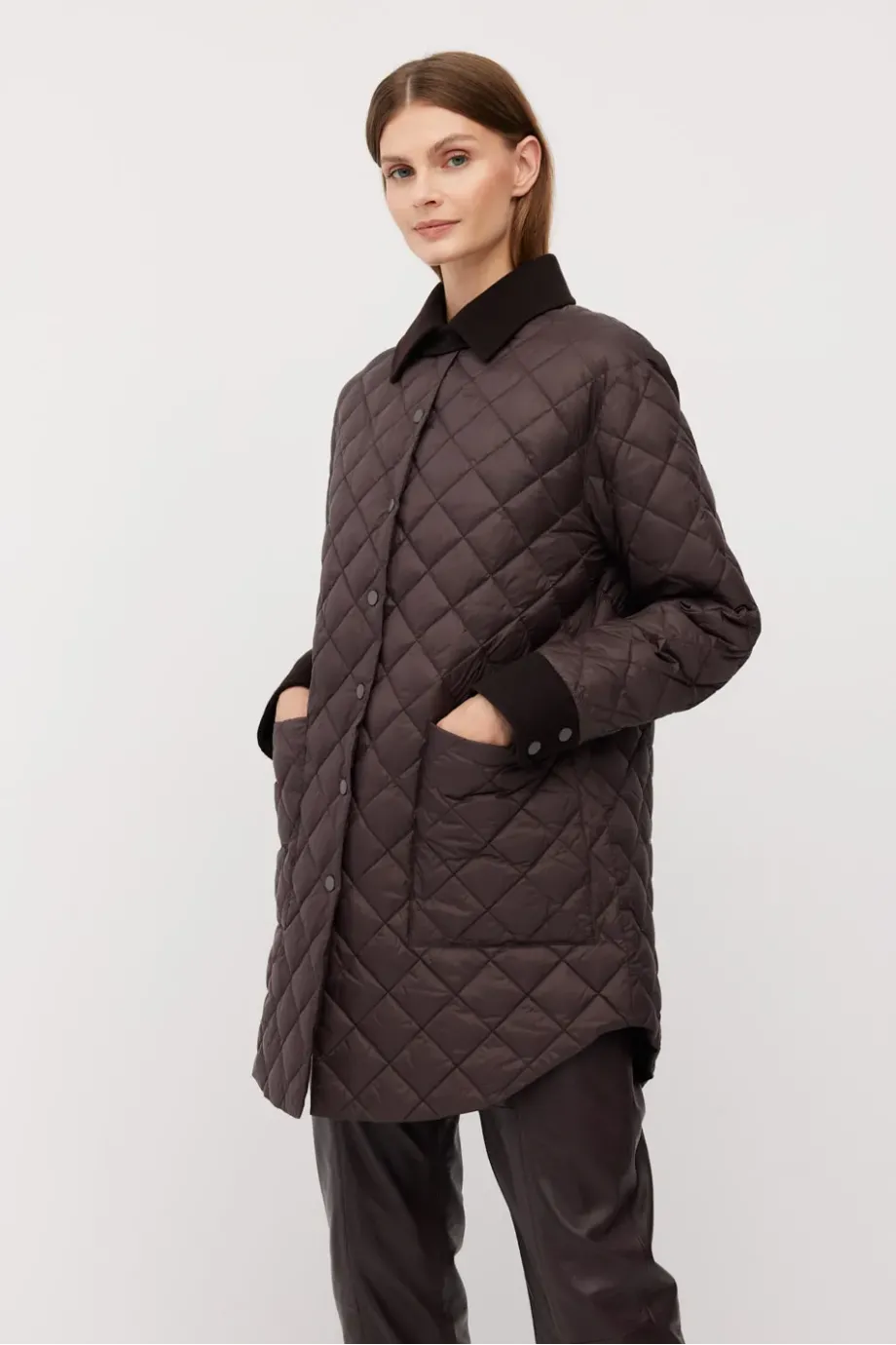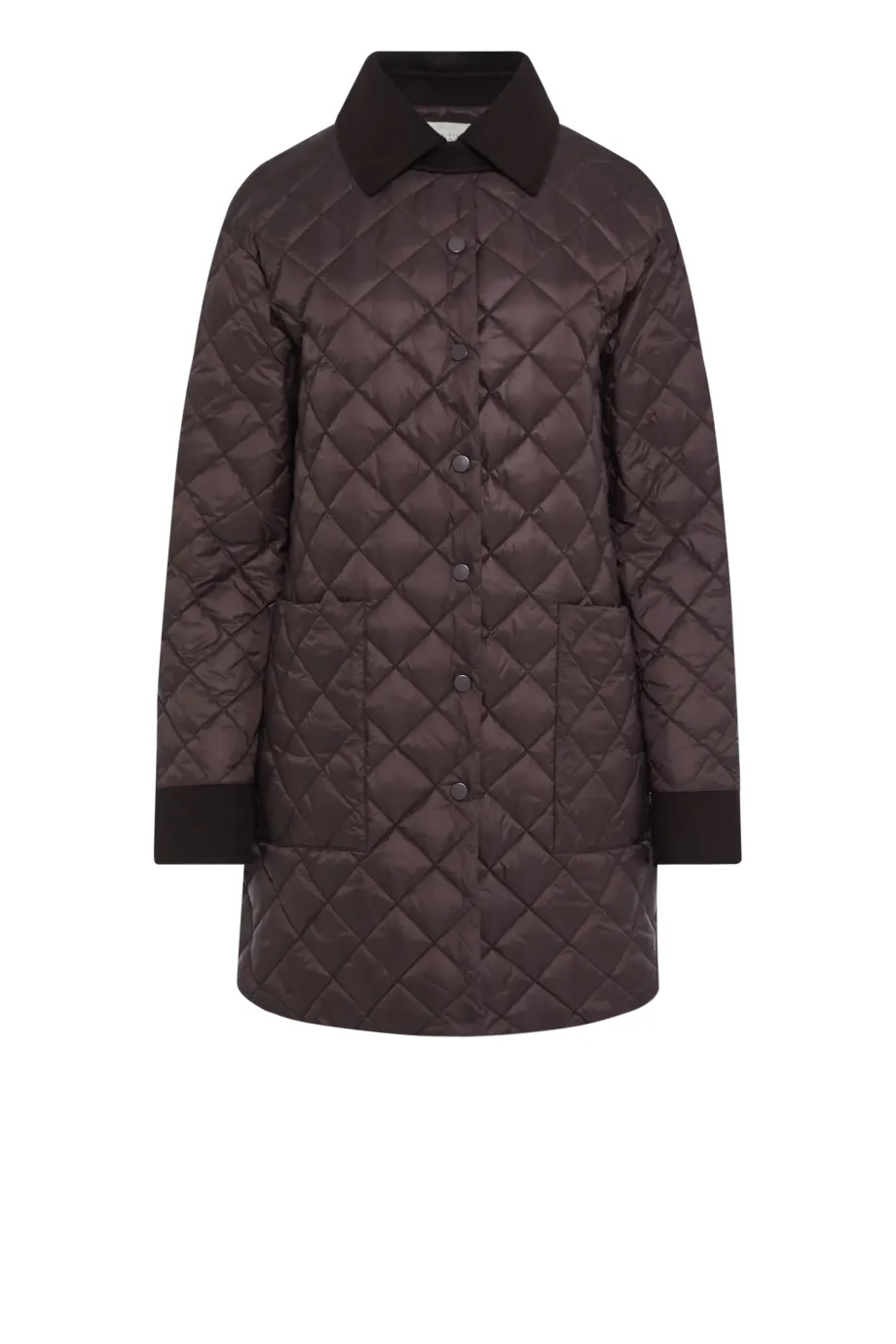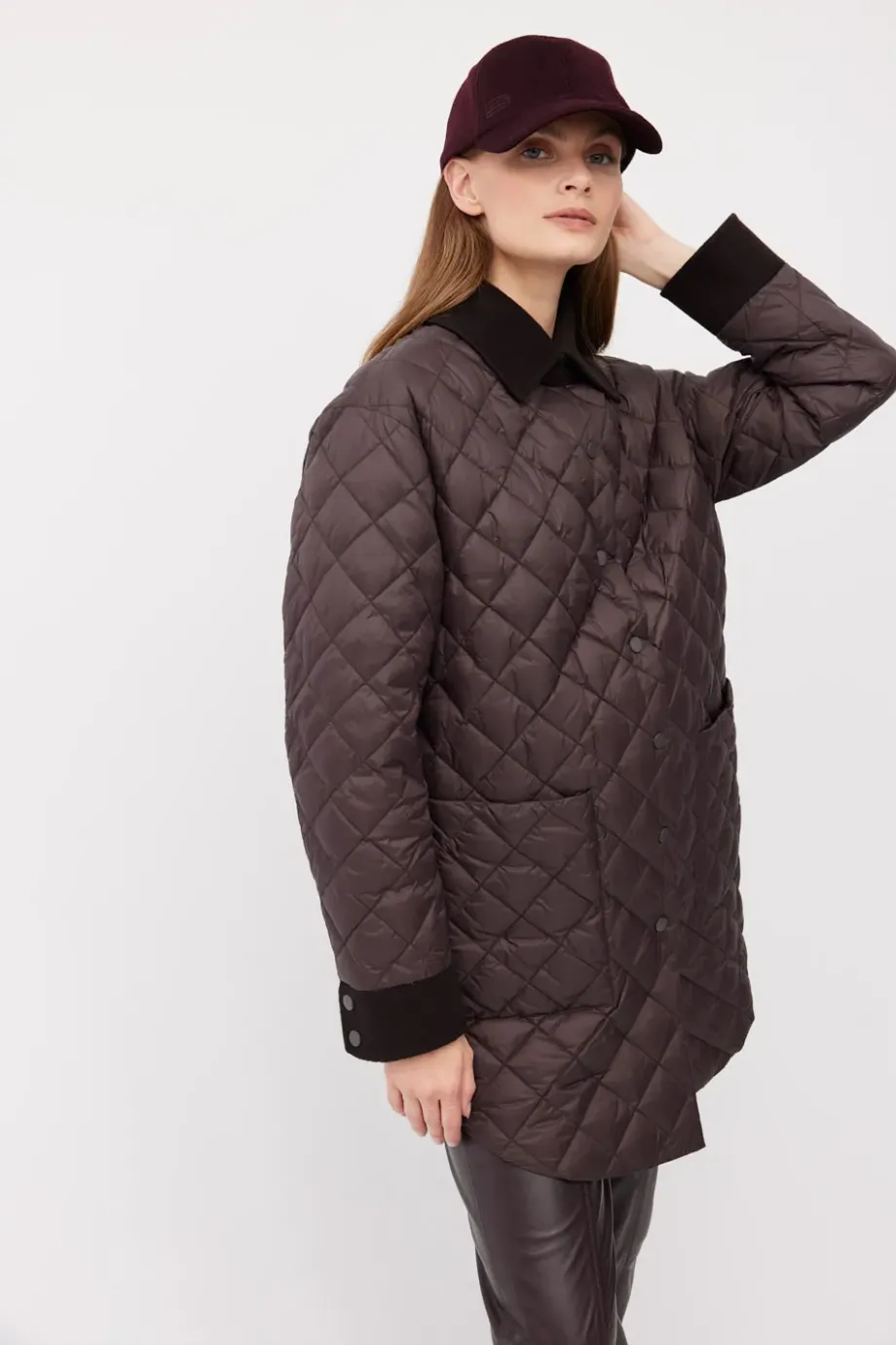 Pletená bunda na druky. Přírodní výplň. Jednoduchý a volný tvar. Kapsy s nášivkami. Límec a manžety z vlny. Hnědá barva.