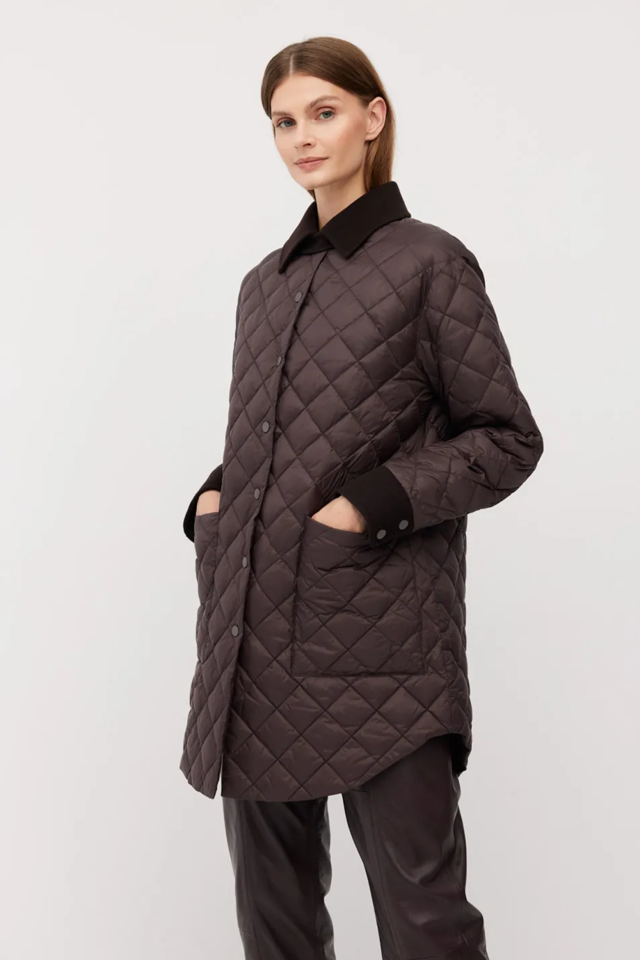 Hnědá prošívaná péřová bunda s límečkem