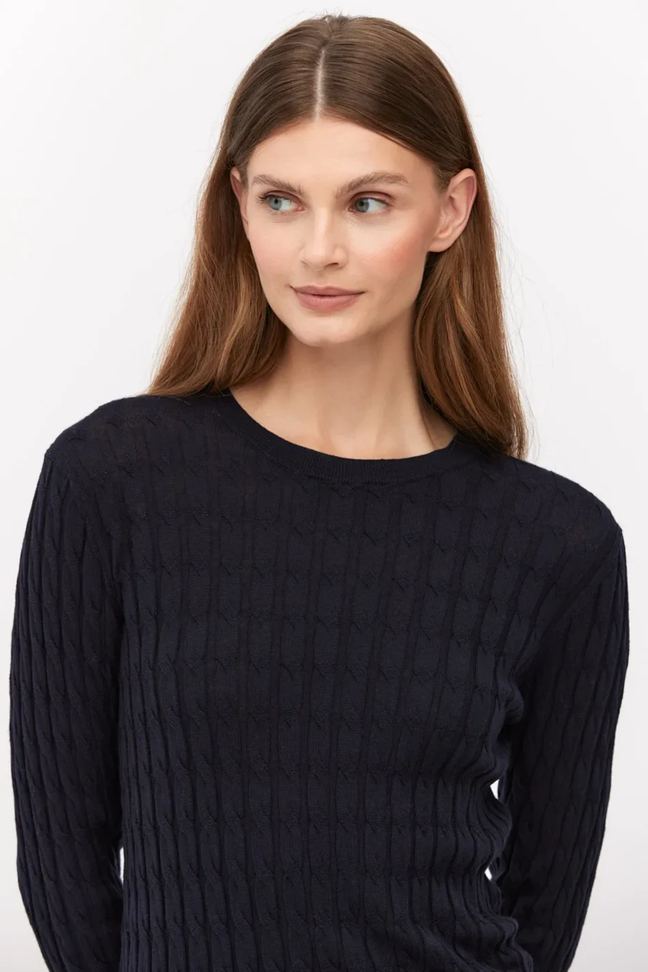 Tmavě modrá merino svetr. Přiléhavý střih, kulatý výstřih a dlouhý rukáv. Pletenina s kablovým vzorem, vyrobená na stroji s jemností 16 GG.