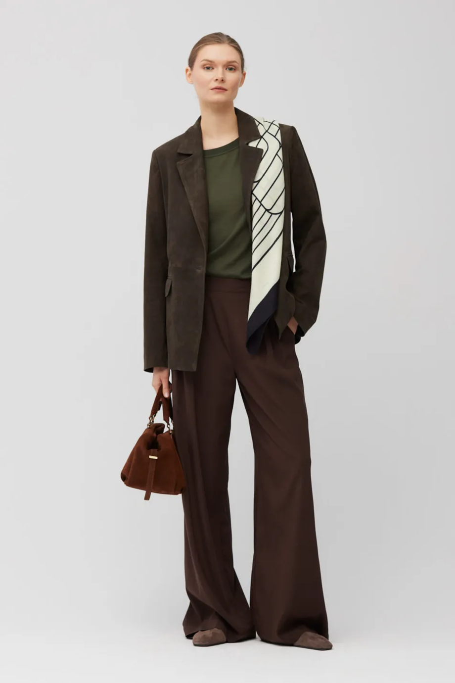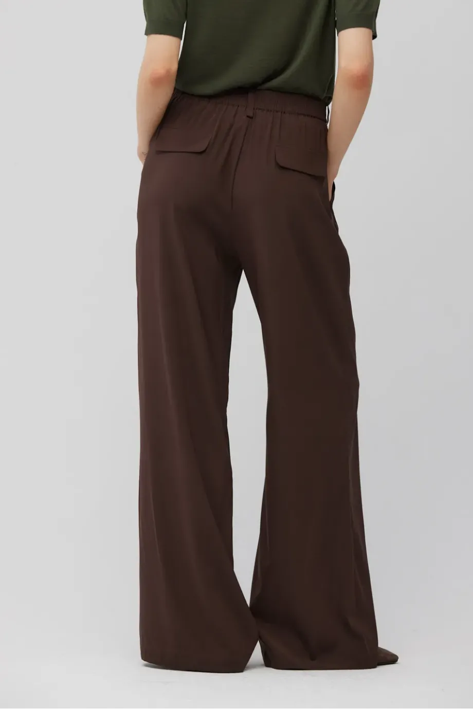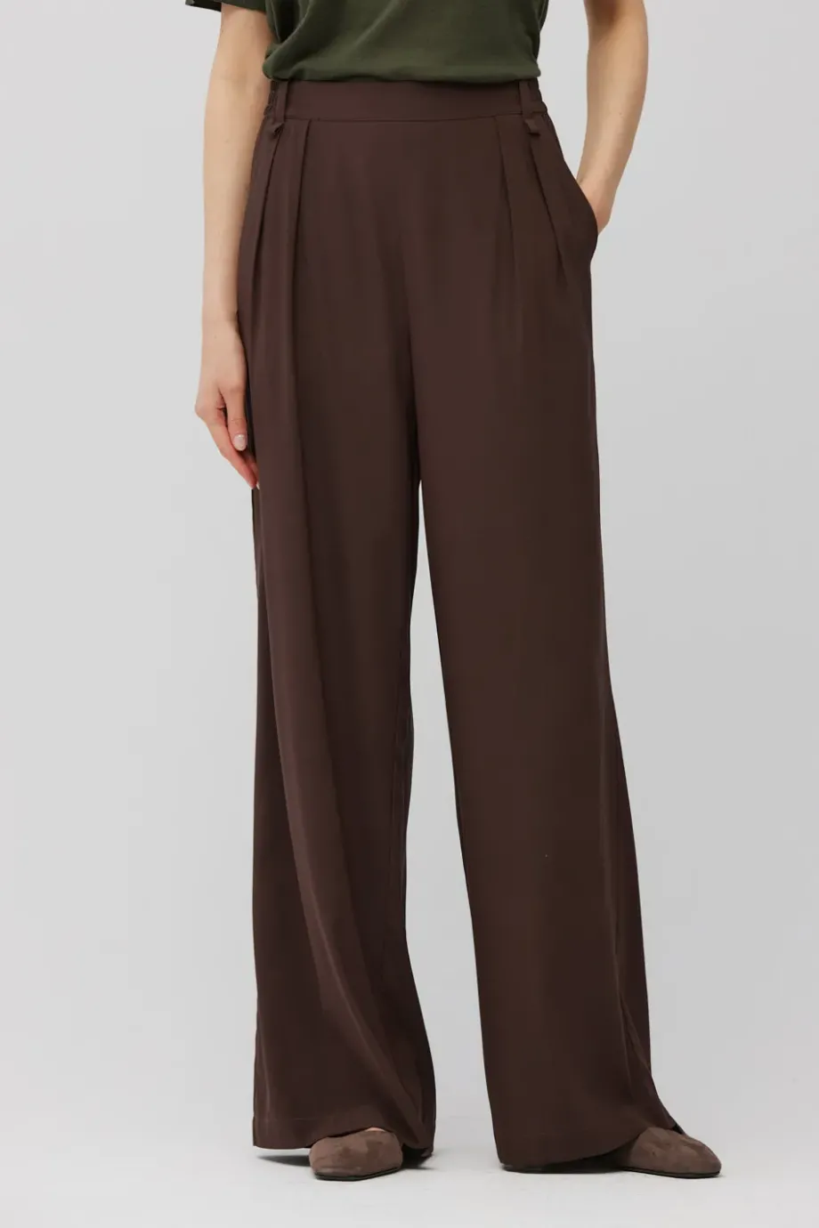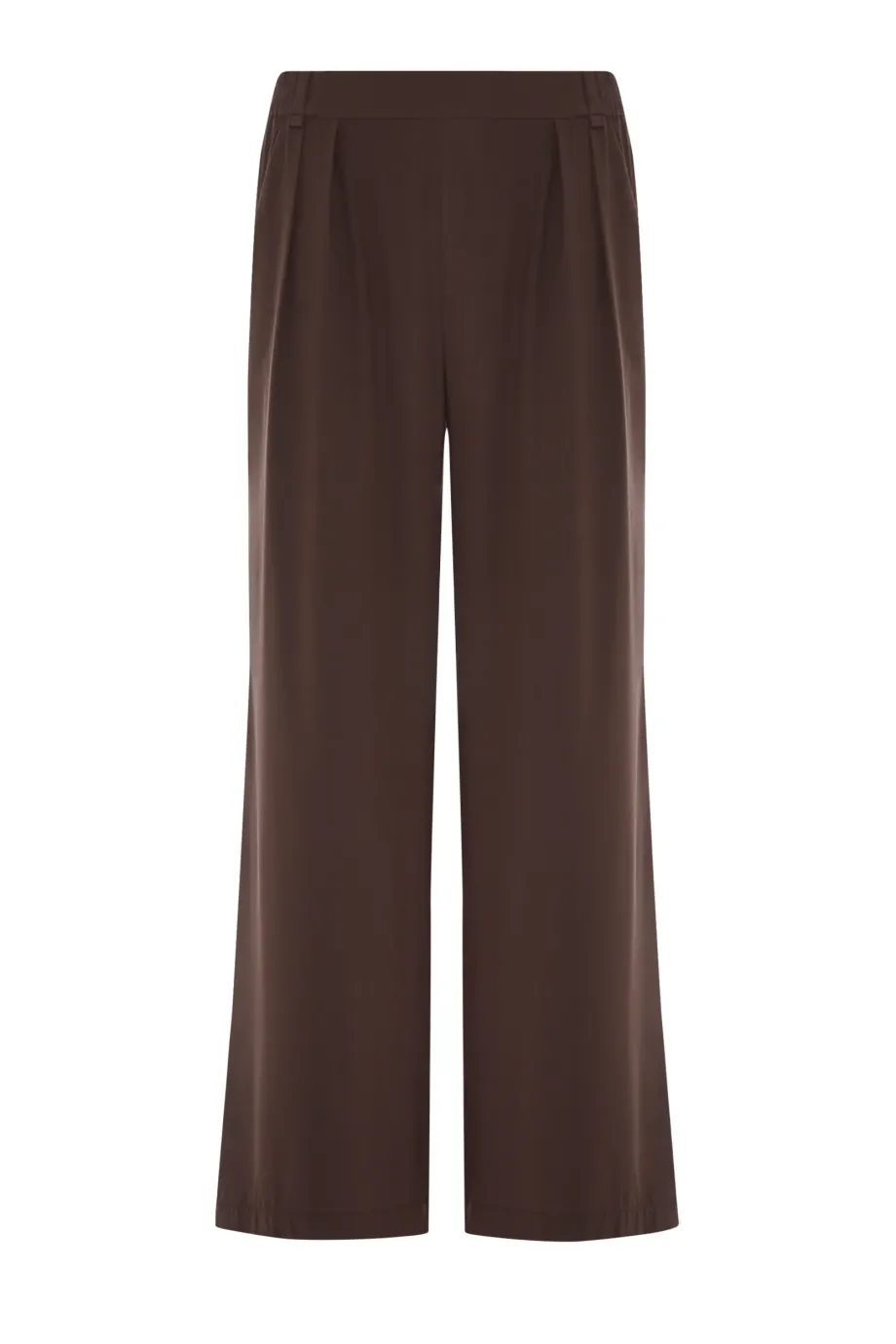 Hedvábné kalhoty s vysokým pasem a širokými nohavicemi. Přední záhyby. Boční kapsy a zadní kapsy s klopami. Zapínání na skrytý zip, háček a knoflík ze dřeva. Pásové poutka. Pečlivě zpracované švy z vnitřní strany. Barva hnědá.