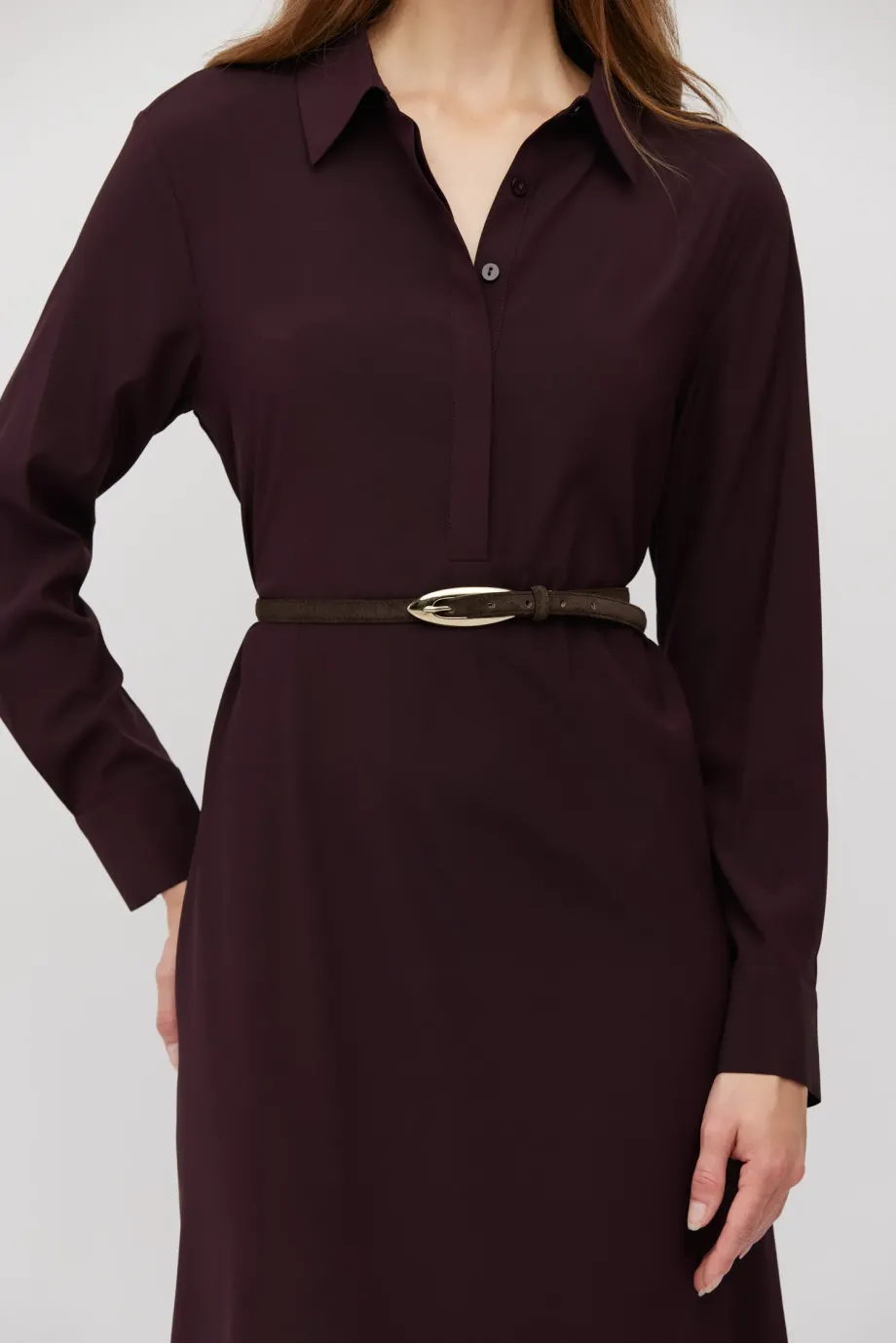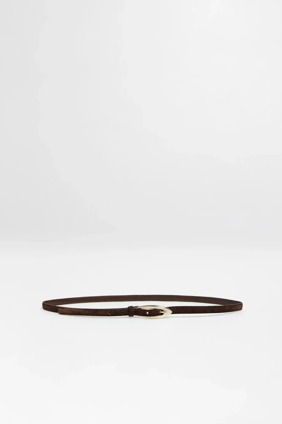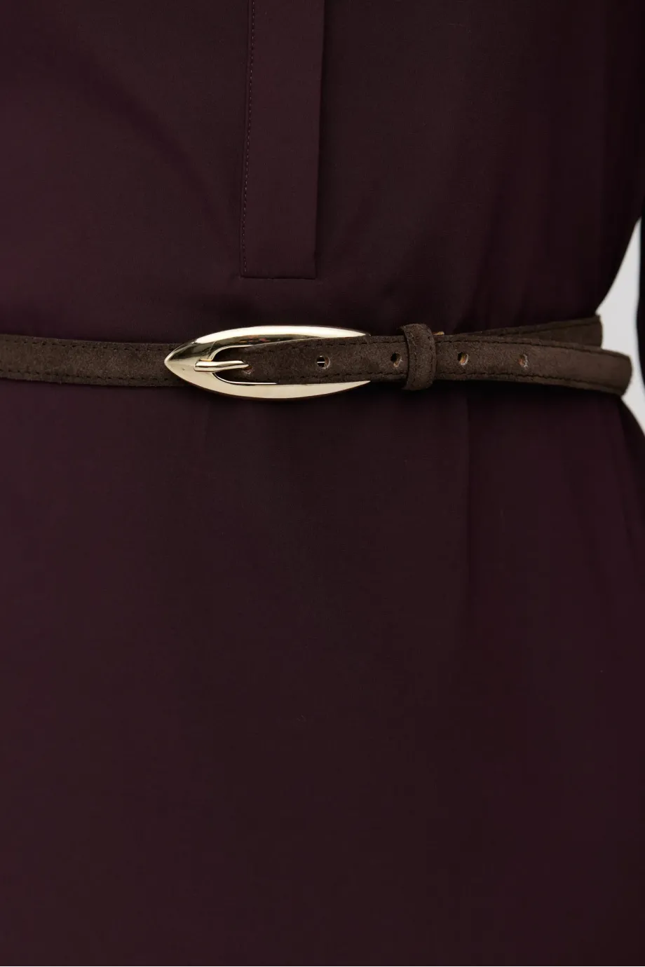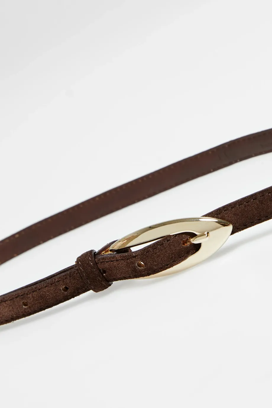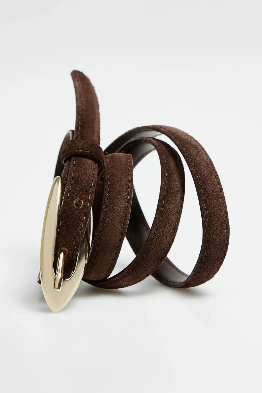 Hnědý, tenký pásek z přírodní nubukové kůže, s oválnou sponou v barvě zlata. Ručně vyrobený v polské manufaktuře.