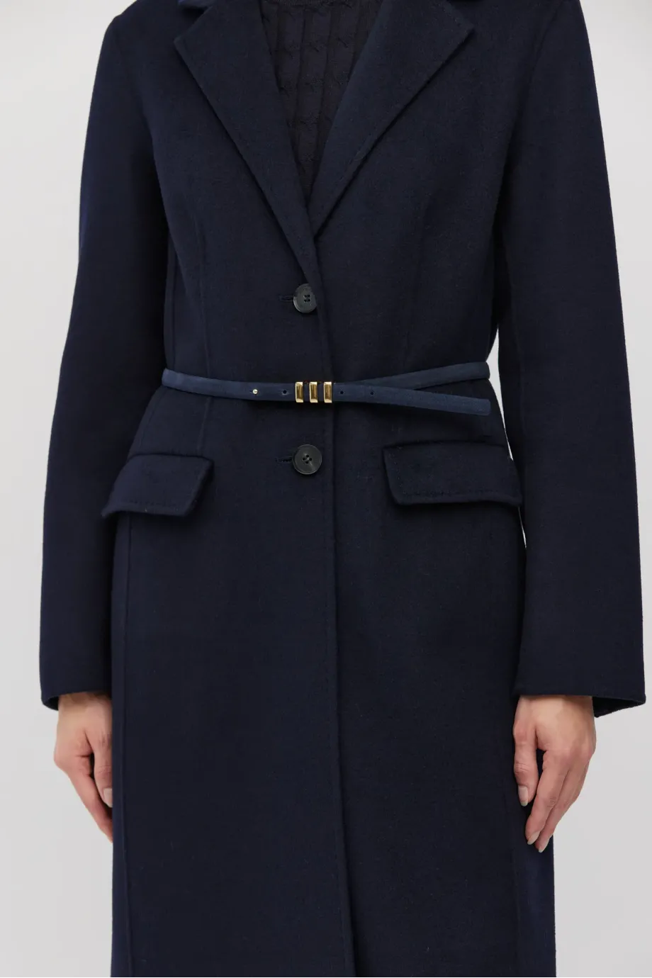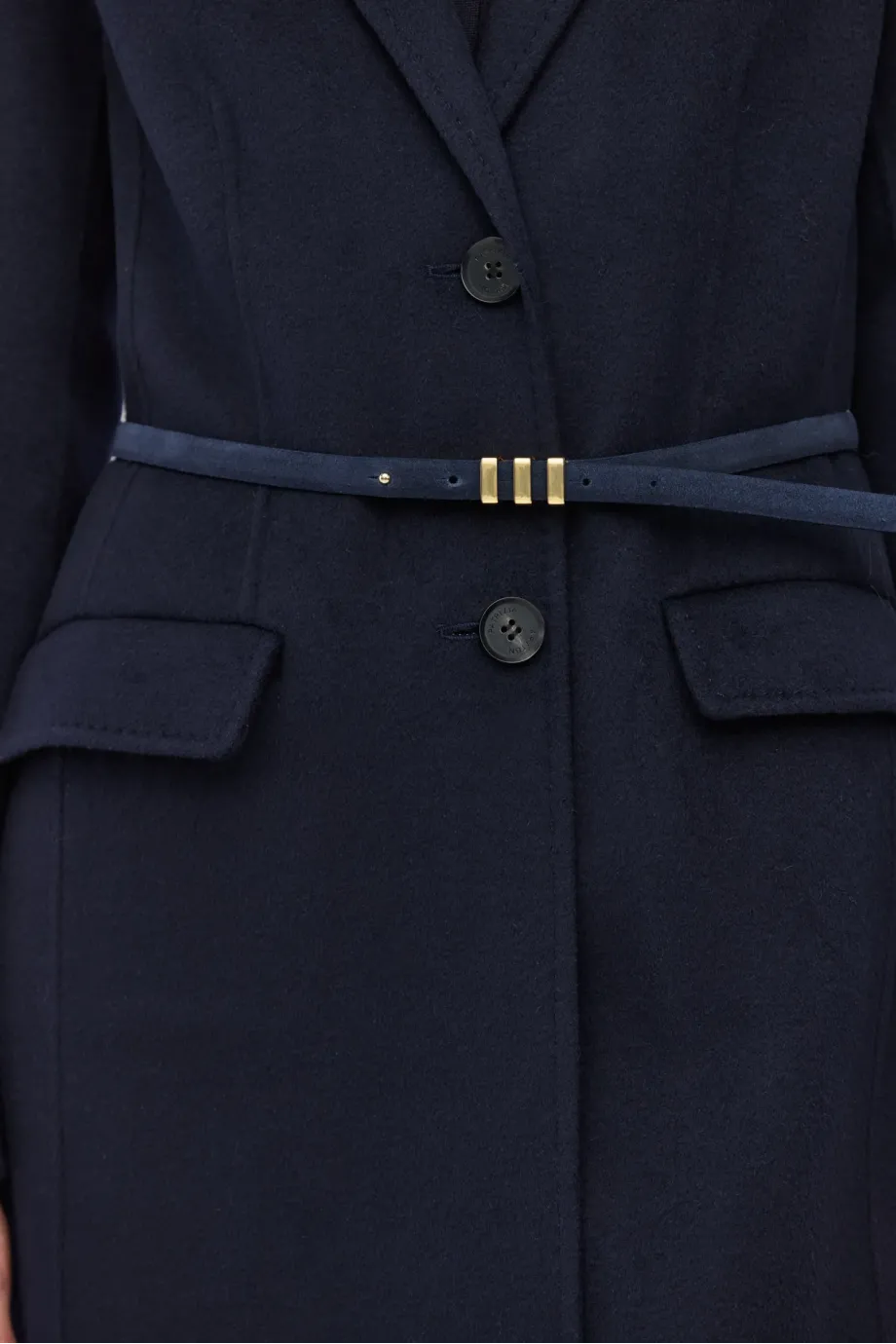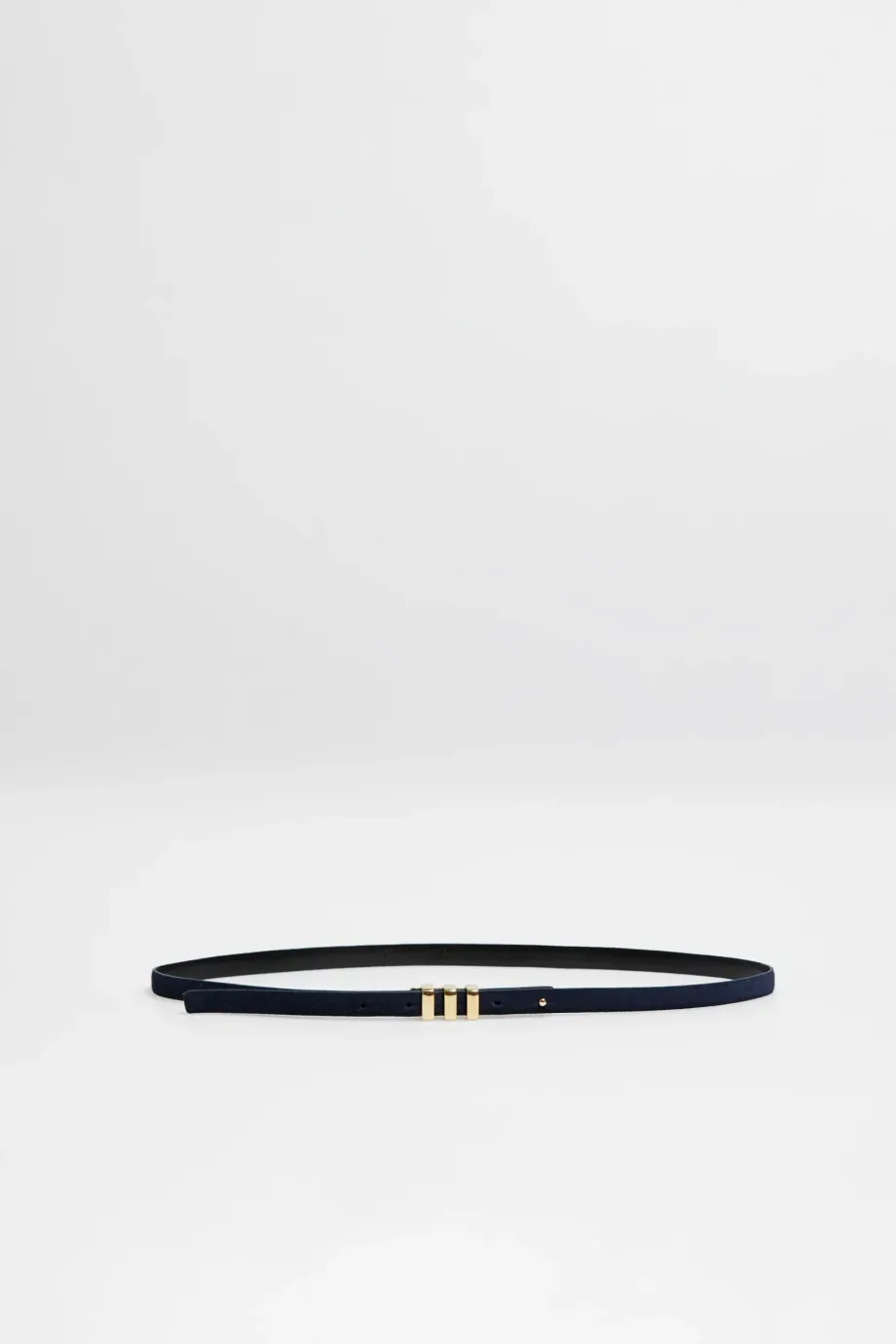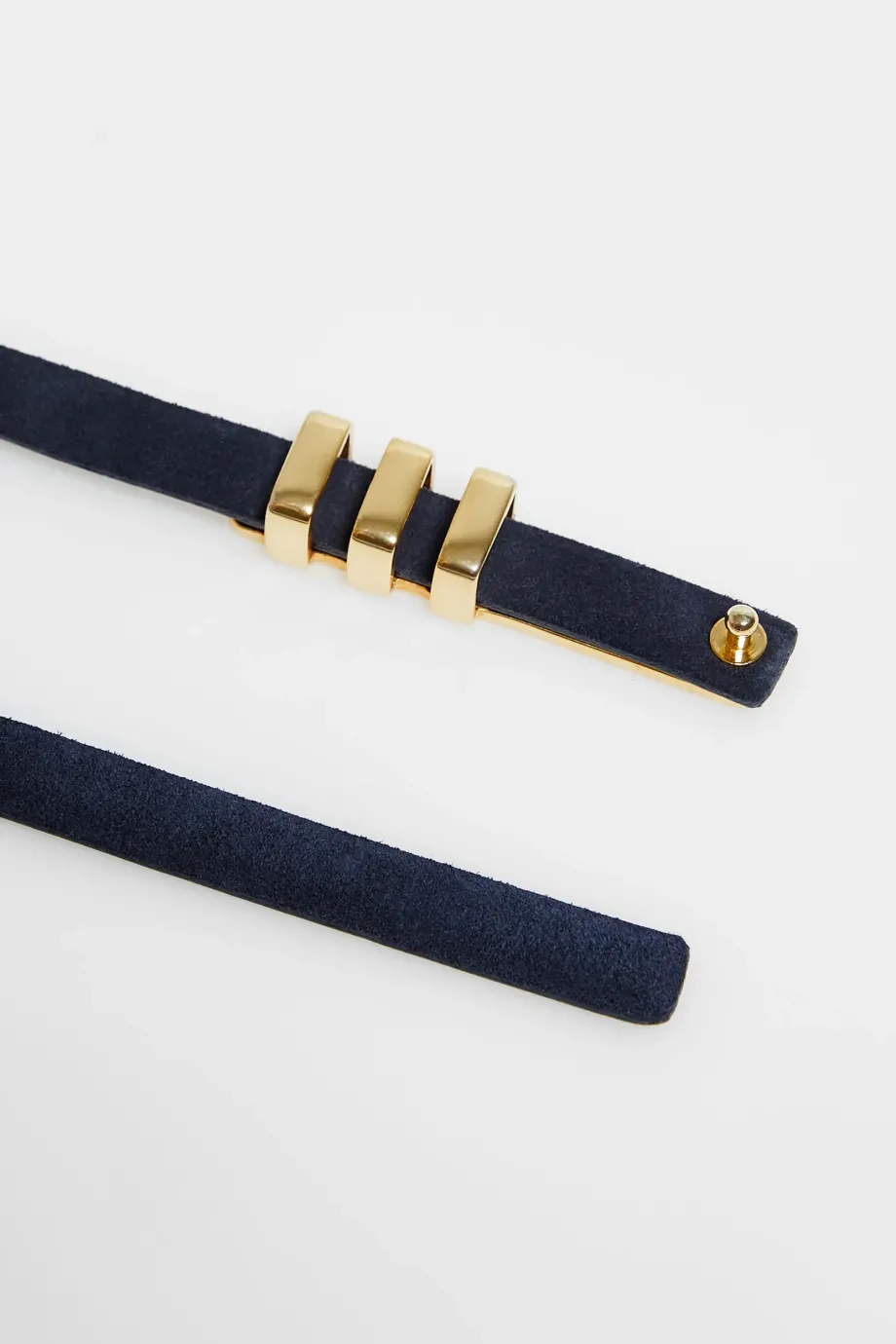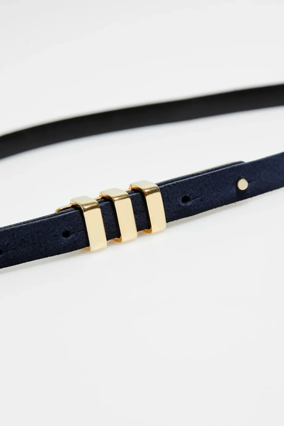 Tmavě modrý, tenký pásek z přírodní semišové kůže, s přezkou ve zlaté barvě. Ručně vyrobeno v polské manufaktuře.