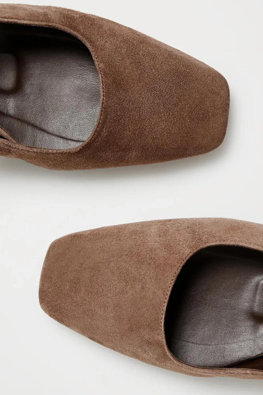 Slingback boty na nízkém čtvercovém podpatku. Vyrobené z měkké přírodní semišové kůže v hnědé barvě. Tenký pásek s elastickou vsadkou. Ručně vyrobené v italské manufaktuře.