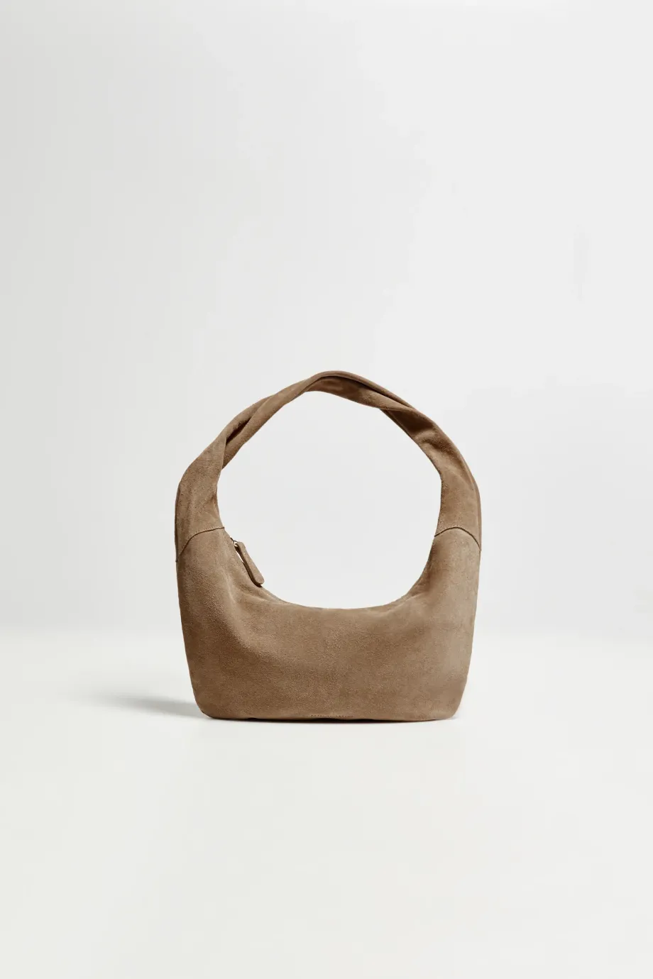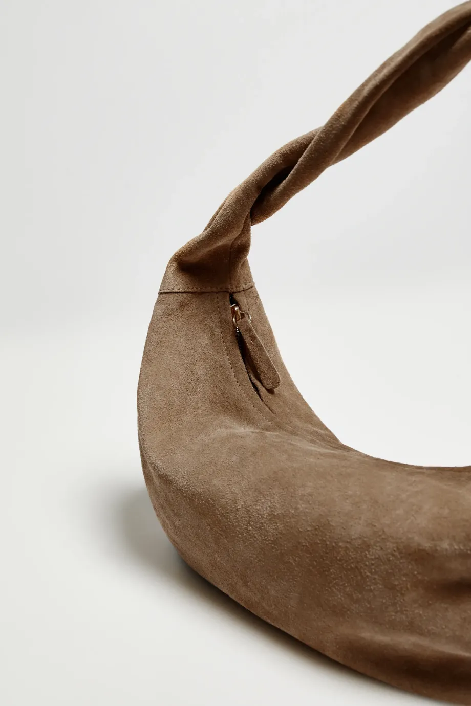 Taška polokruhového tvaru vyrobená z měkké, přírodní zamskové kůže v béžovém odstínu. Zapínání na zip, se širokým, pohodlným popruhem – na nošení na rameni nebo v ruce. Lehká a měkká na dotek, podšitá, uvnitř malá kapsa na zip. Ručně šitá v italské manufaktuře.