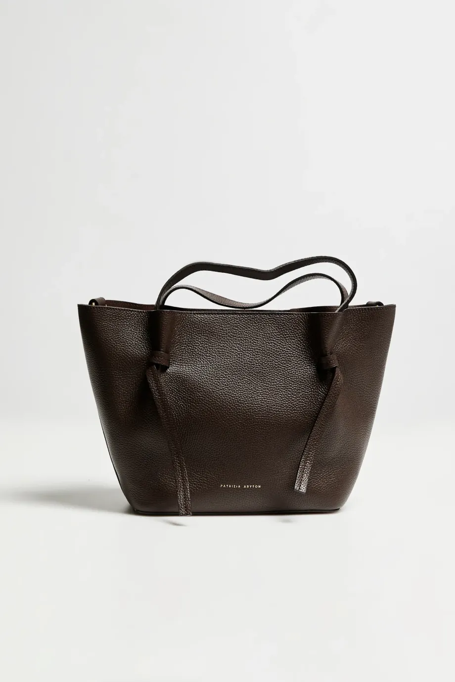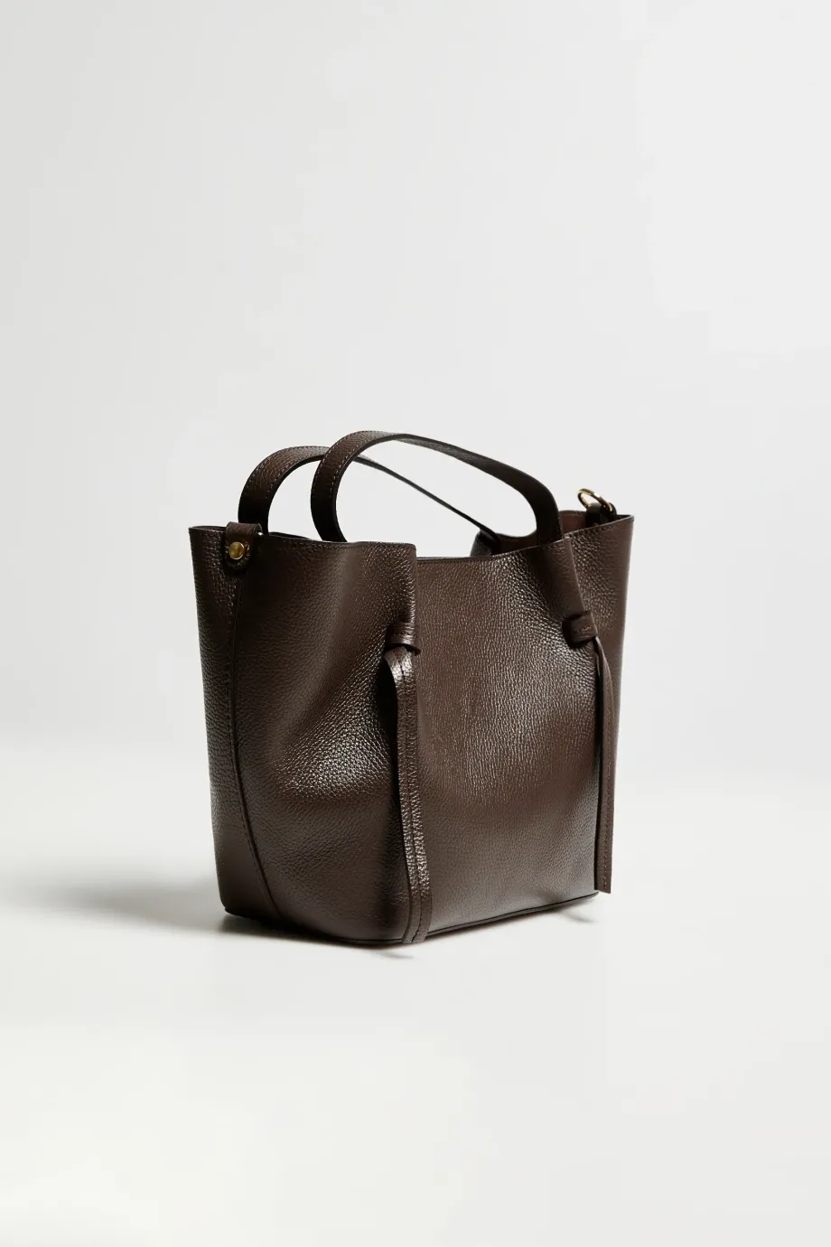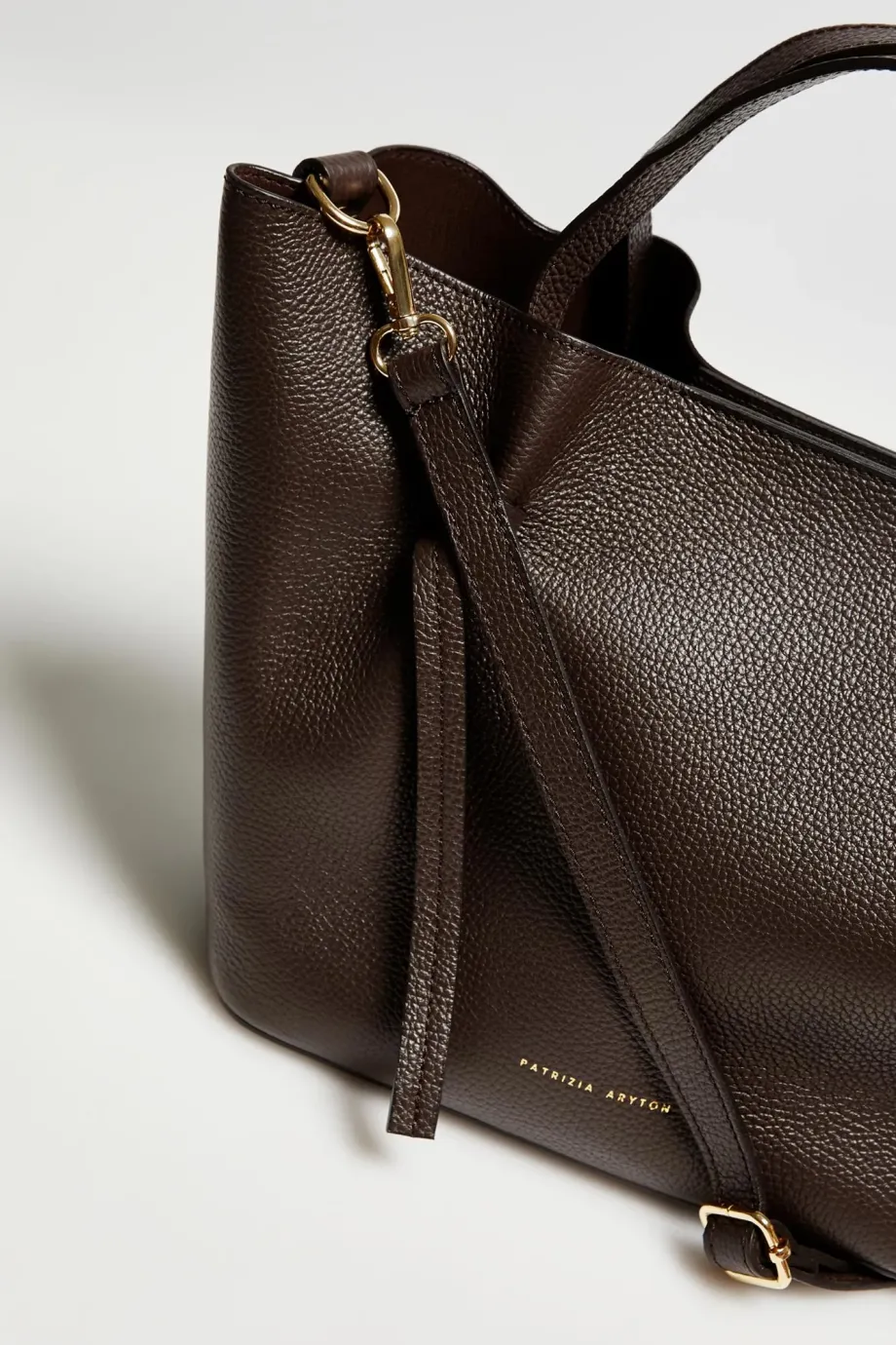 Taška typu shopper vyrobená z přírodní hnědé kůže s jemnou strukturou. Ručně ušitá v italské manufaktuře. Interiér vybavený odnímatelným zipovým pouzdrem. Zlacené kování, solidní držadla.