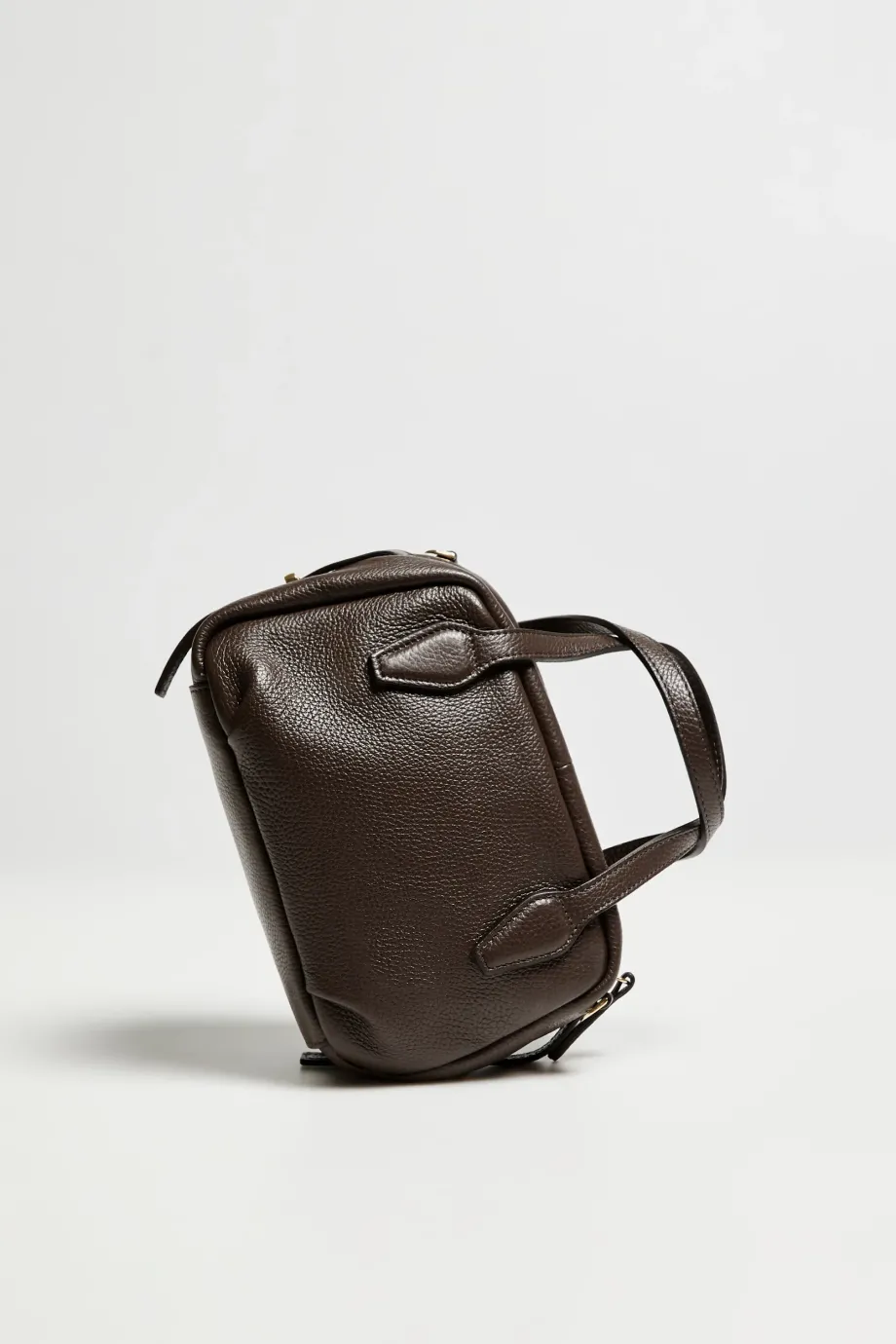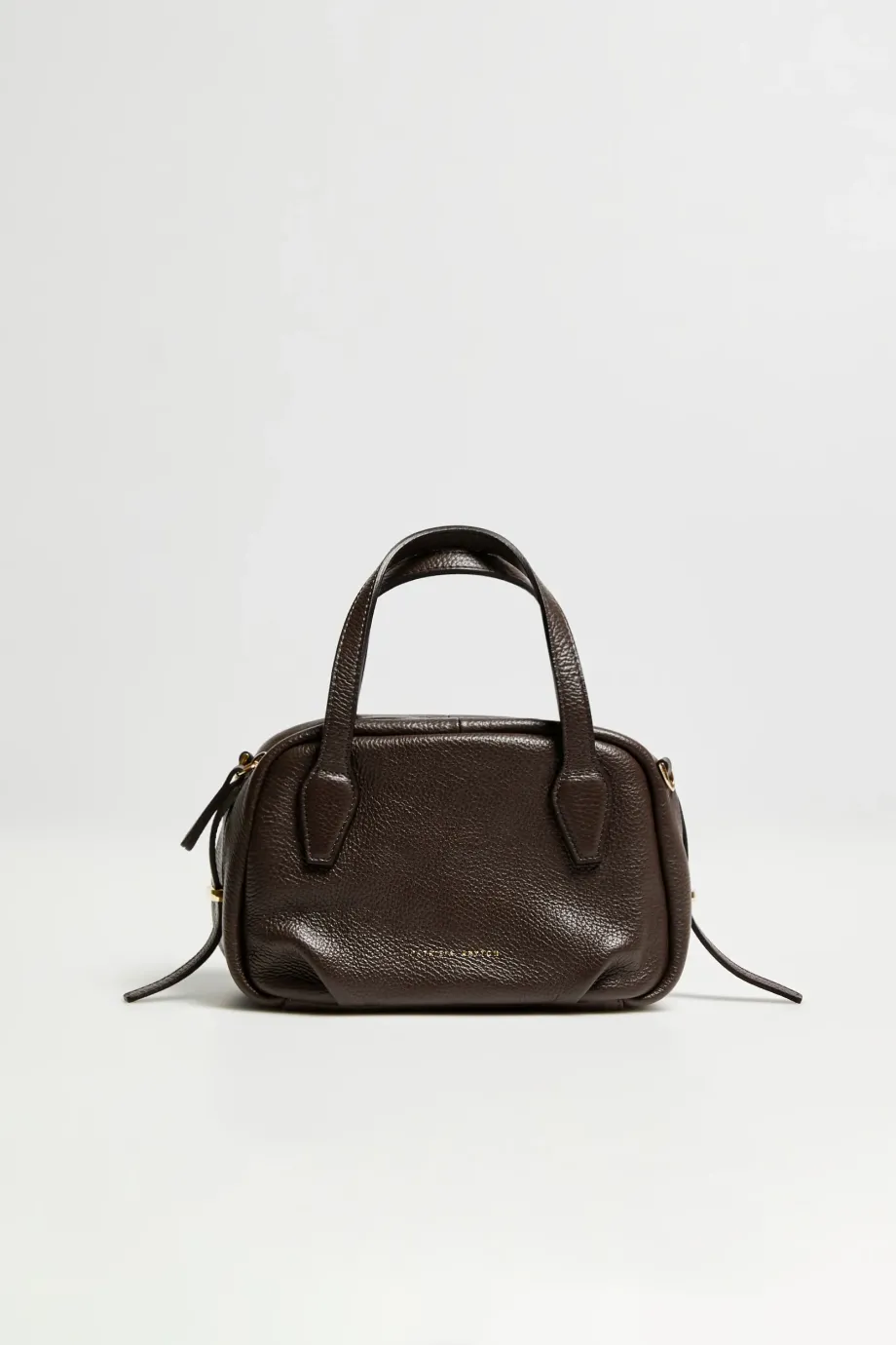 Kabelka ušitá z vysoce kvalitní kůže s jemnou texturou, odolné proti poškrábání. Kompaktní tvar s krátkými uchy a dlouhým, nastavitelným popruhem, možnost odpojení. Zapínání na zip v zlaté barvě. Uvnitř podšívka a kapsička na zip. Ručně šitá v italské manufaktuře. Barva hnědá.