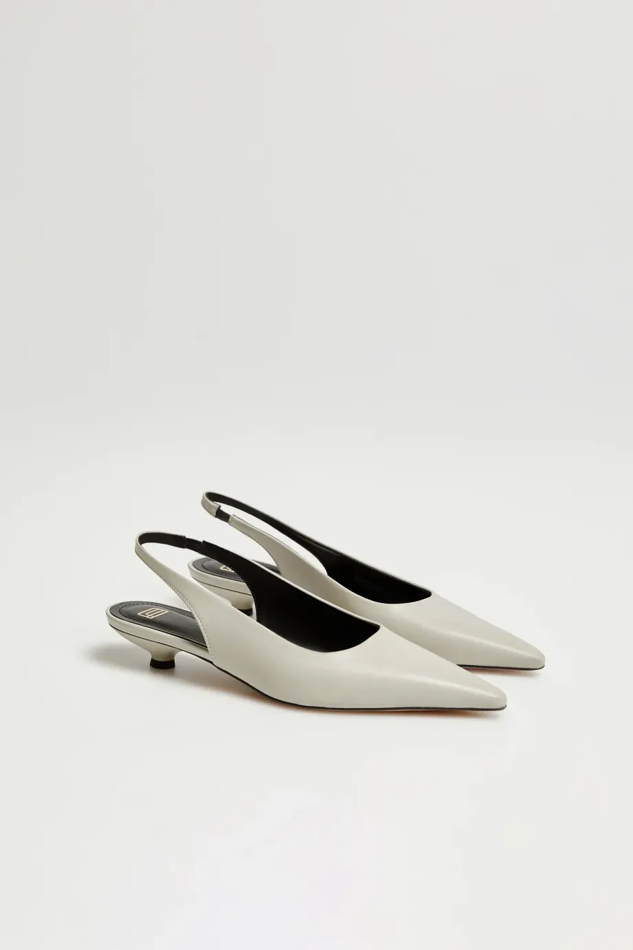 Boty typu slingback s odkrytou patou a páskem s elastickou vsadkou. Štíhlá, špičatá špička a nízký podpatek typu kitten heel. Vyrobeny z měkké, přírodní kůže. Barva světlá zeleň. Vyrobeno ručně v české manufaktuře.
