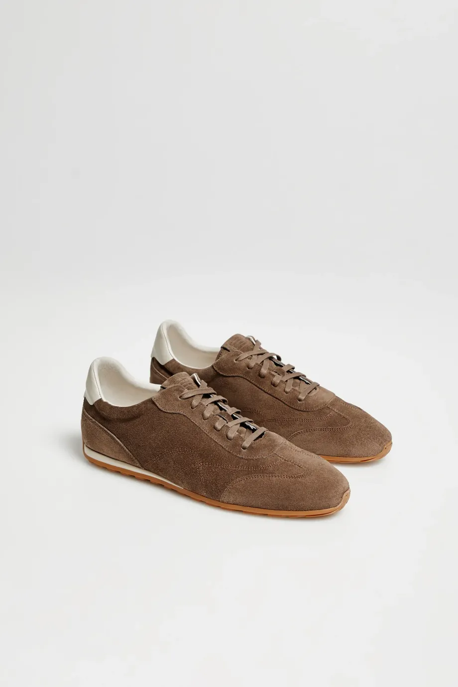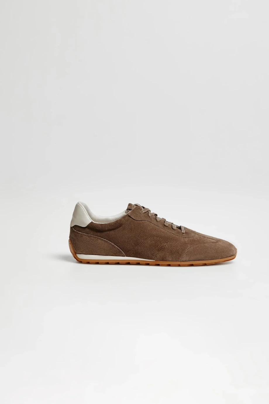 Hnědé retro tenisky inspirované klasickou sportovní obuví. Vyrobené z přírodní semišové kůže, umístěné na lehké, pružné podrážce. Měkká stélka. Ručně vyrobené v Polsku.
